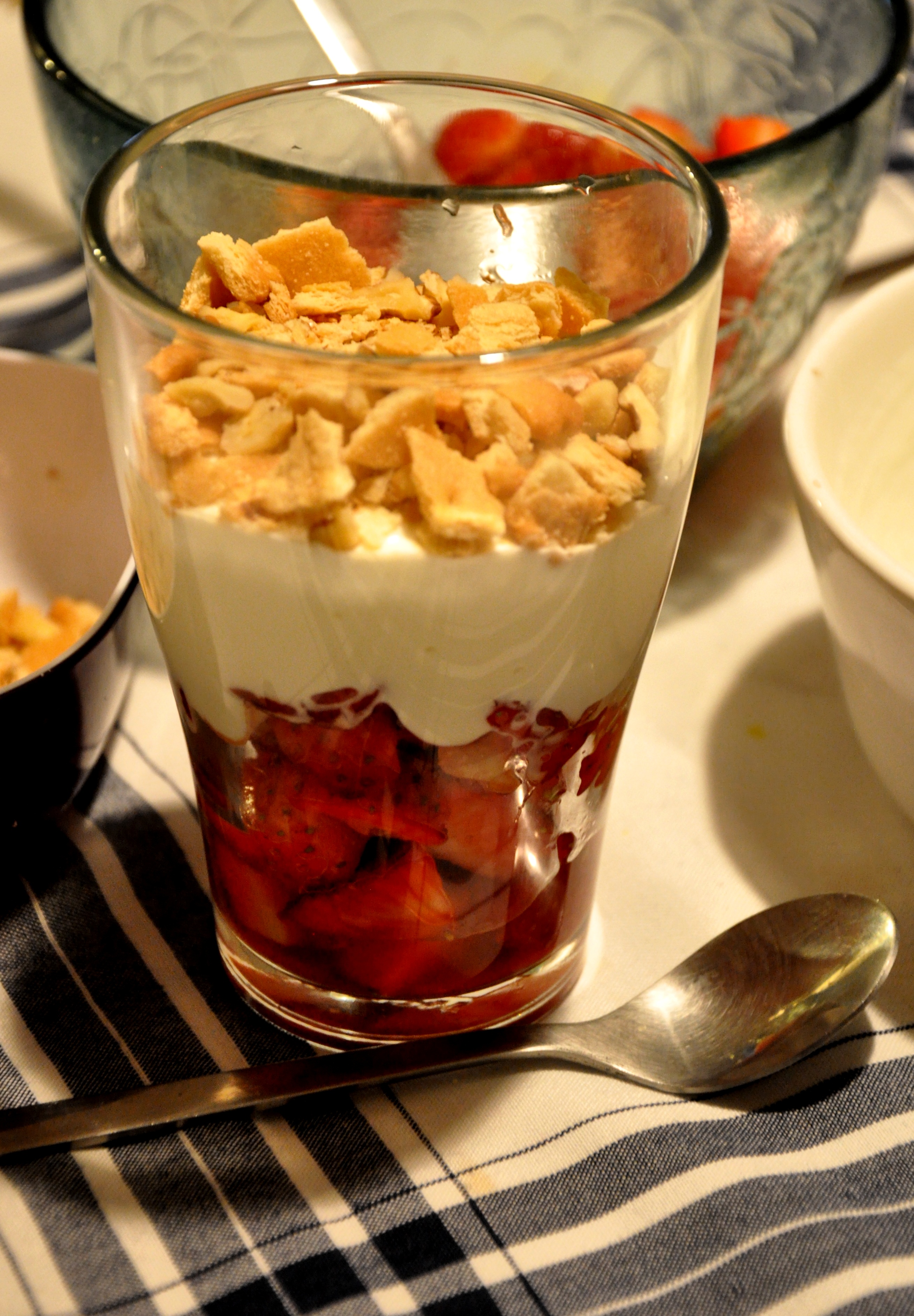 But sometimes it’s the quick and easy that reward you just as much: chop up a few strawberries, add sugar and any liquor you prefer (I am personally currently in love with a sugar-cane-rum-thing that is just divine), whip up some Greek yoghurt with (ah ehm) sugar (I have a sweet tooth and am not afraid to admit it), crumble plain biscuits, then layer. In this order. Or any other, as you wish. It doesn’t really matter, see, because the textures and the tastes are so different yet complimentary that in whatever order you put them into your mouth, they’re perfect. Sometimes, in season, I add a little bit of mint leaves to spice the whole thing up. I’ve seen them with whipped cream instead of yoghurt, but I think the feel is too light, too fluffy for this plate.