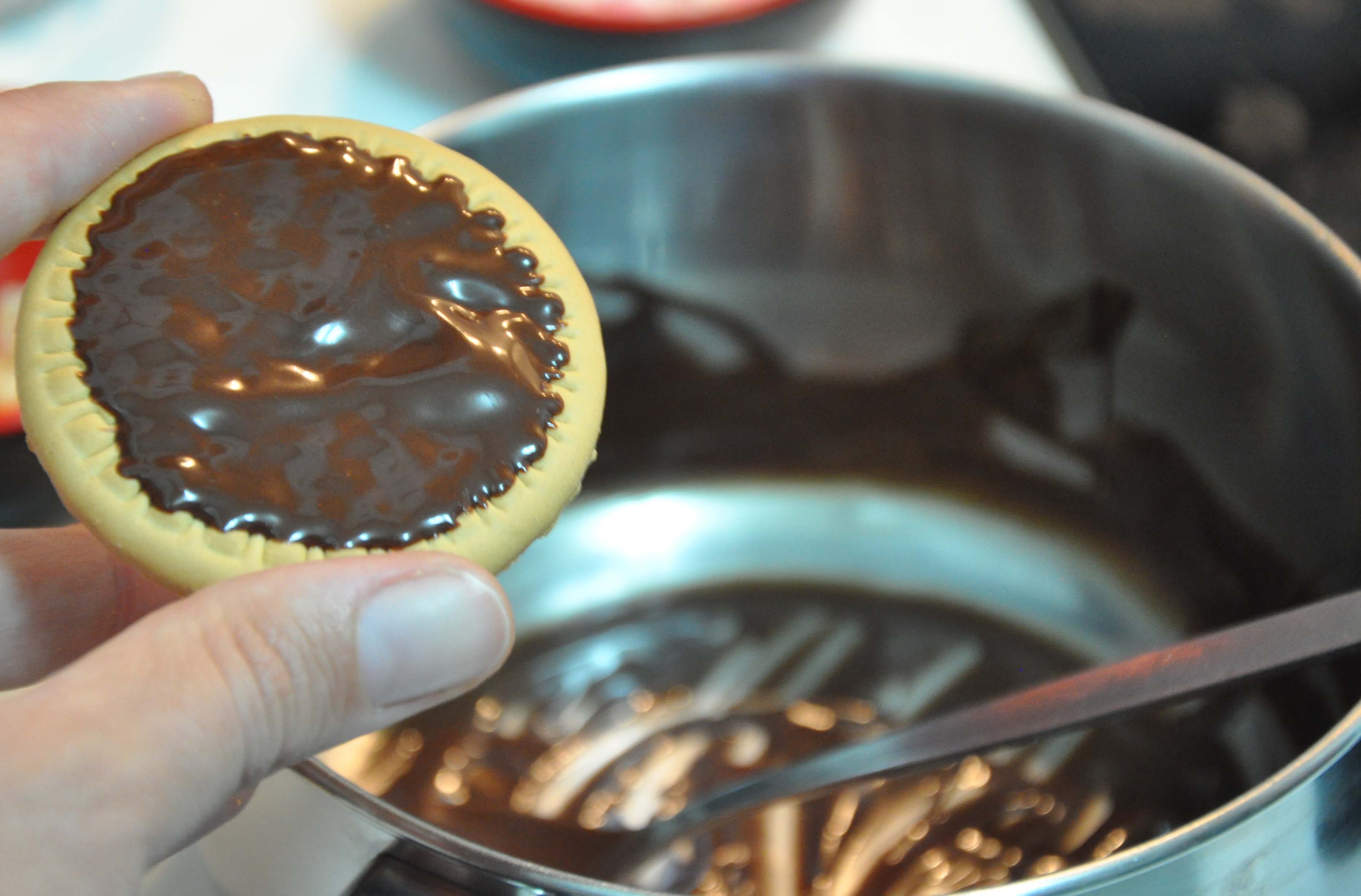 When I finished the strawberries (by the by, the chocolate chip topping on smaller strawberries does not work, unless you want your delicate romantic dessert to look like an angry goth dessert) I found myself with quite a lot of leftover melted chocolate. I immediately thought “I’ll EAT IT!” but then stopped my greedy little hands for a second and wondered what I could do with it instead of just goffing it down (I just invented that verb, but it does give the right idea, right? Like scoffing but more greedily). Then it came to me: those awful, boring, tasteless biscuits! YES! I would pimp my biscuits!