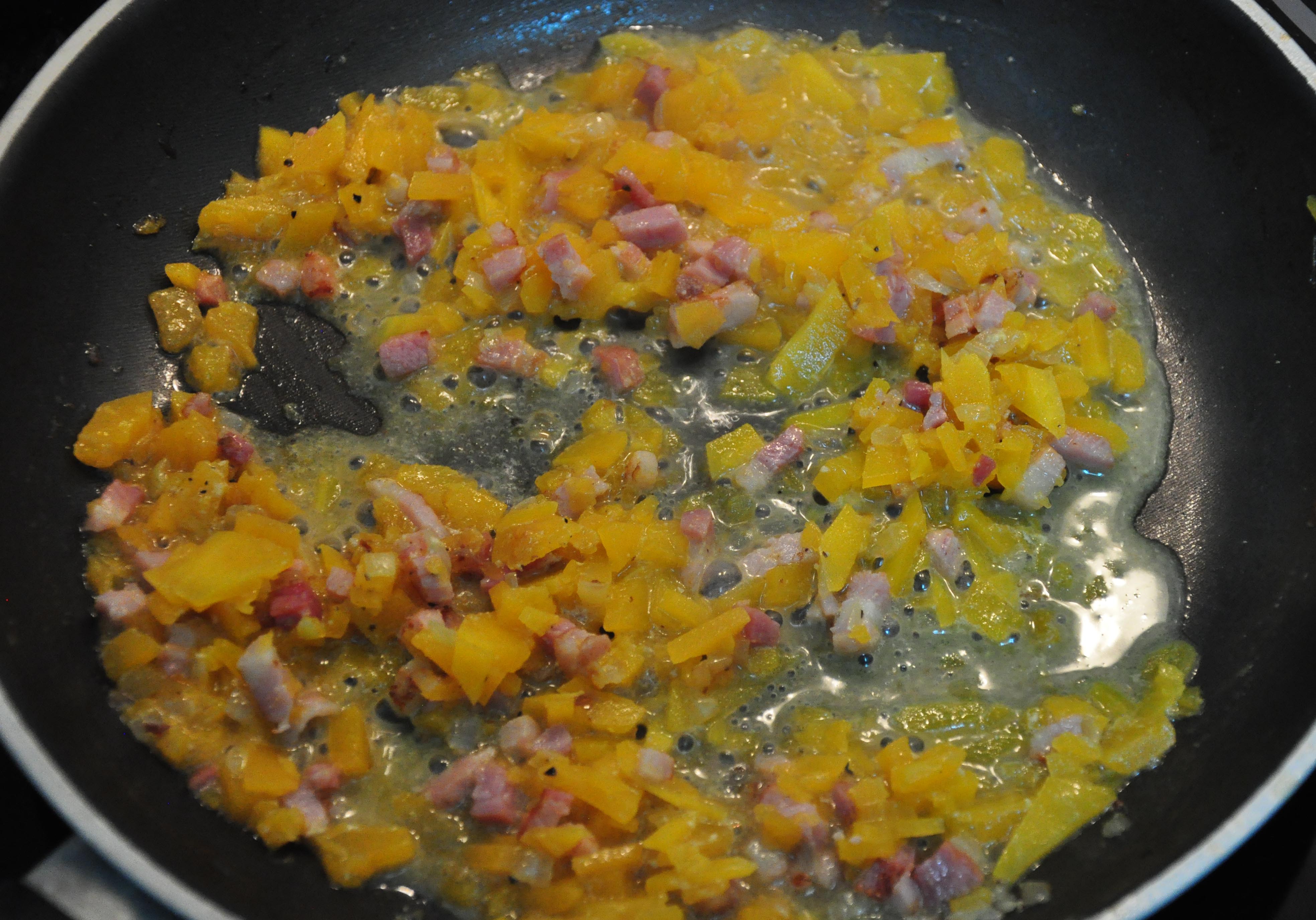 When the emergency was over, it was very late and I couldn’t cope with warming the sauce and cooking risotto – I wanted a quick, easy pasta. So while the water in the pan was starting to boil, waiting for the pasta, I cut some leftover raw pumpkin (otherwise known as butternut squash but a total synonym in my head, see the risotto post) in slithers (to promote fast cooking) and put it in a teeny pot with broth and milk. It started simmering, and I chopped up some onion and fried it with bacon. When that was ready I added the cooked pumpkin to let the tastes mingle. In the meantime, the water was boiling so I dropped the pasta in.