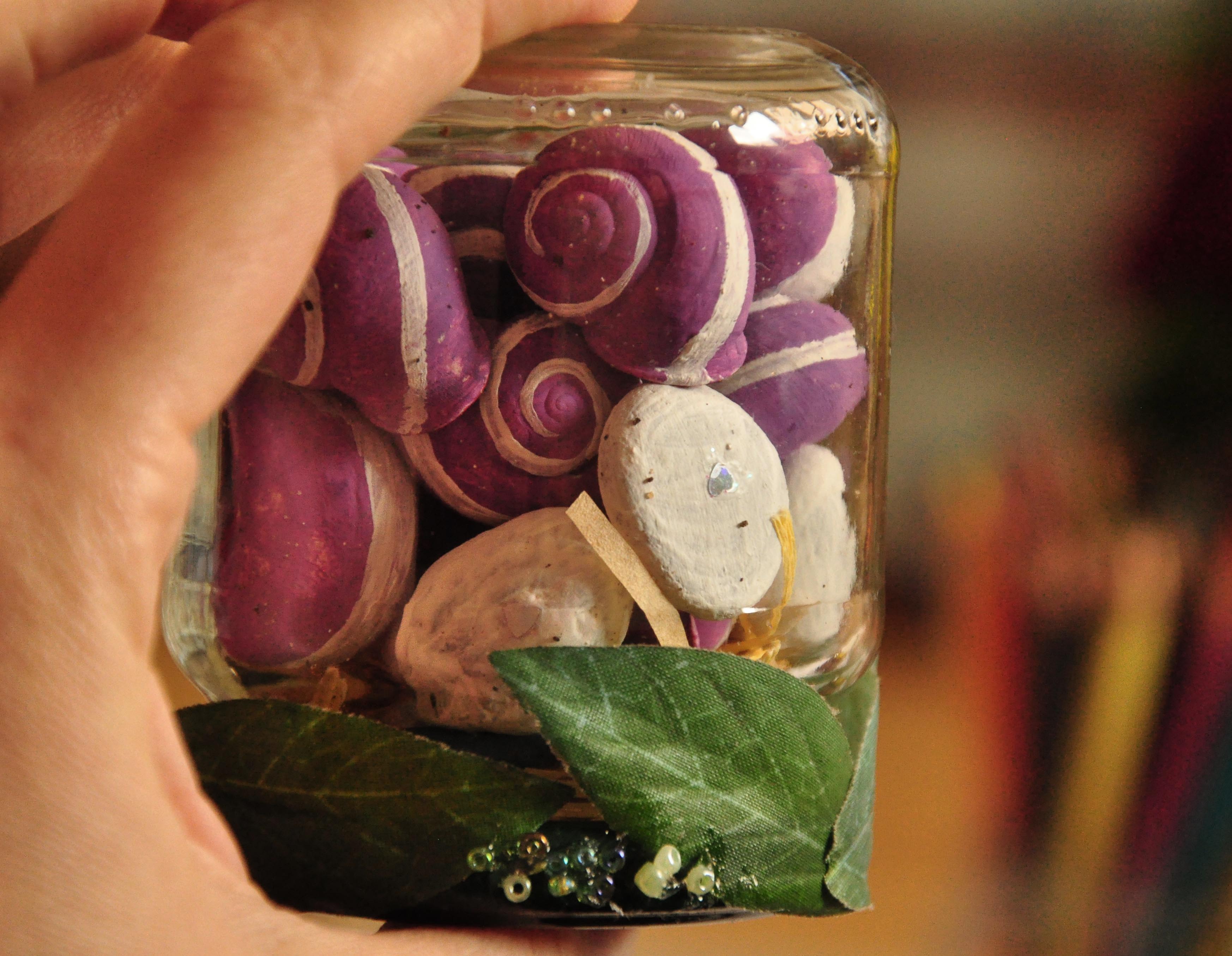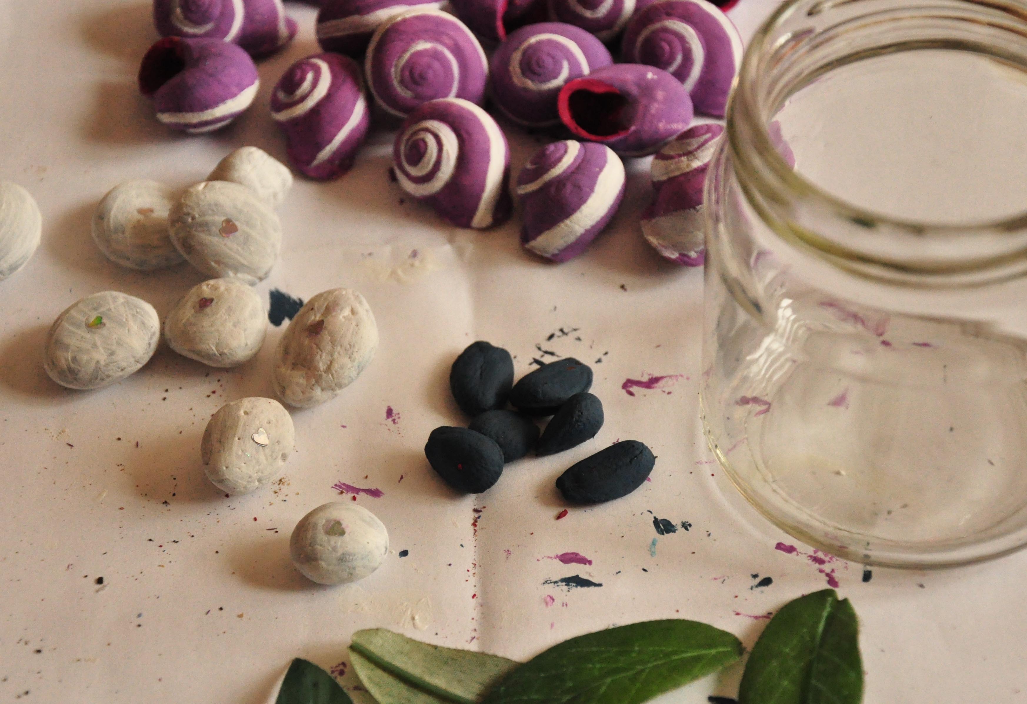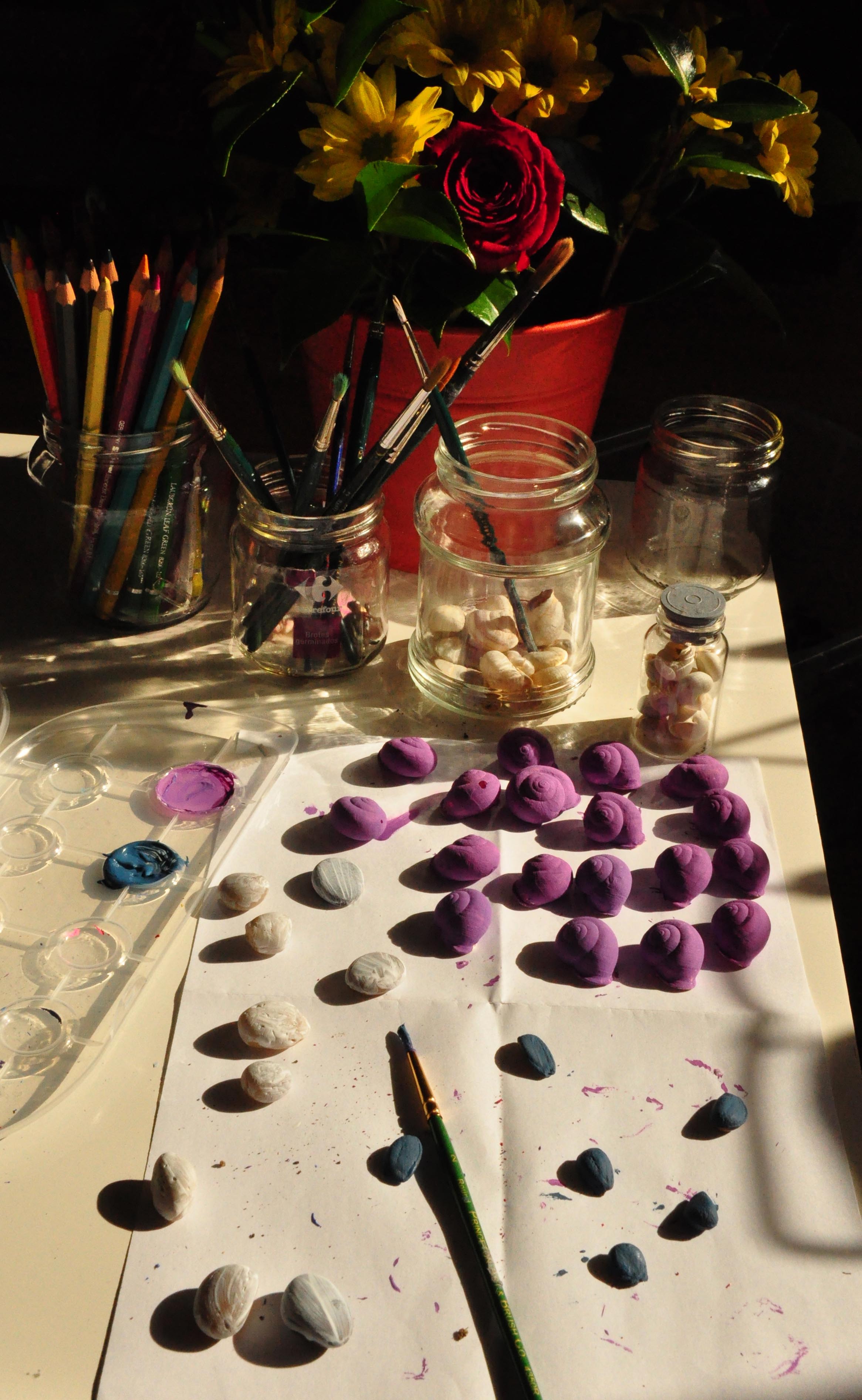 I got a few snails (I love snails, and they’re so… balanced.. so.. golden ratio…), collected (already dead, in case someone’s wondering) in the South of Portugal, and painted them purple with white stripes. Because I like purple. 16, because it’s my second favourite number, and 24 of them (my absolute favourite number) didn’t fit in the jar. I had some stones lying around the house. I chose 9 flat, smooth stones that I had collected in a Spanish stream (stability, strength). And some cherimoya seeds. Anyone familiar with the cherimoya fruit? I ate one, once. And kept the seeds.