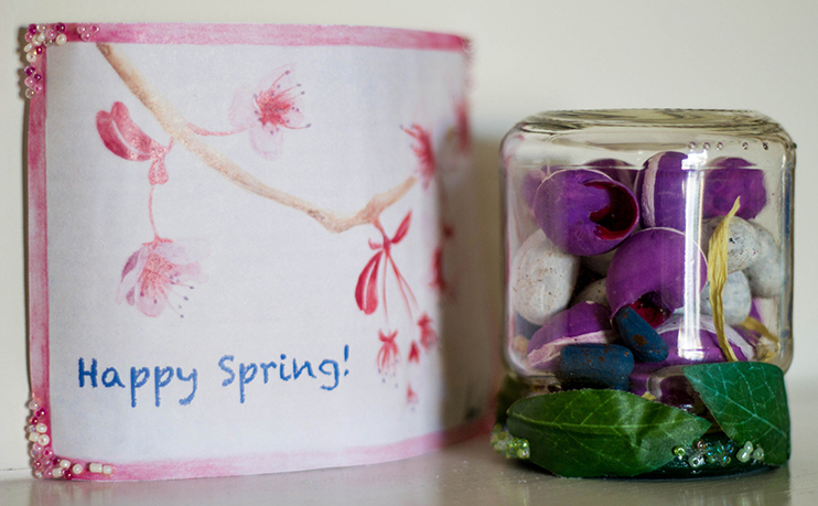 The card in the following photo was painted by me, then photographed and written on for the occasion. I loved making this little jar full of thoughts and good wishes!