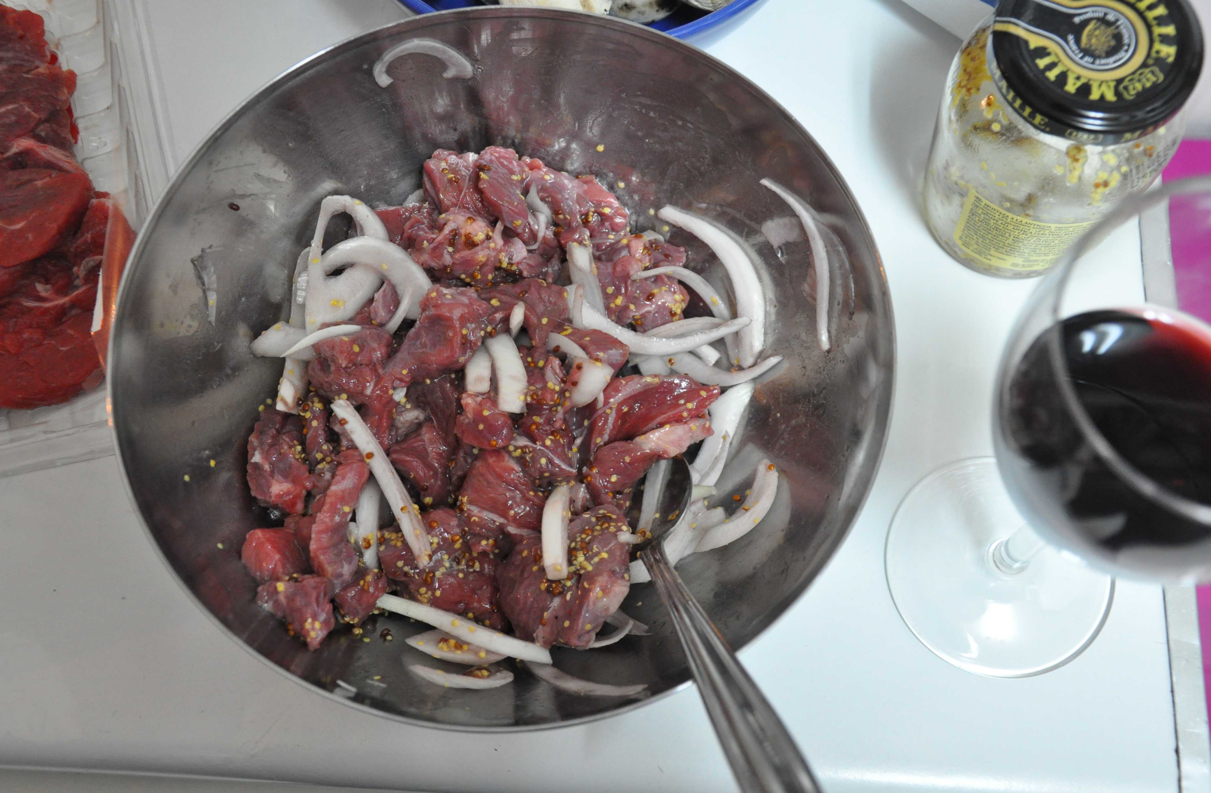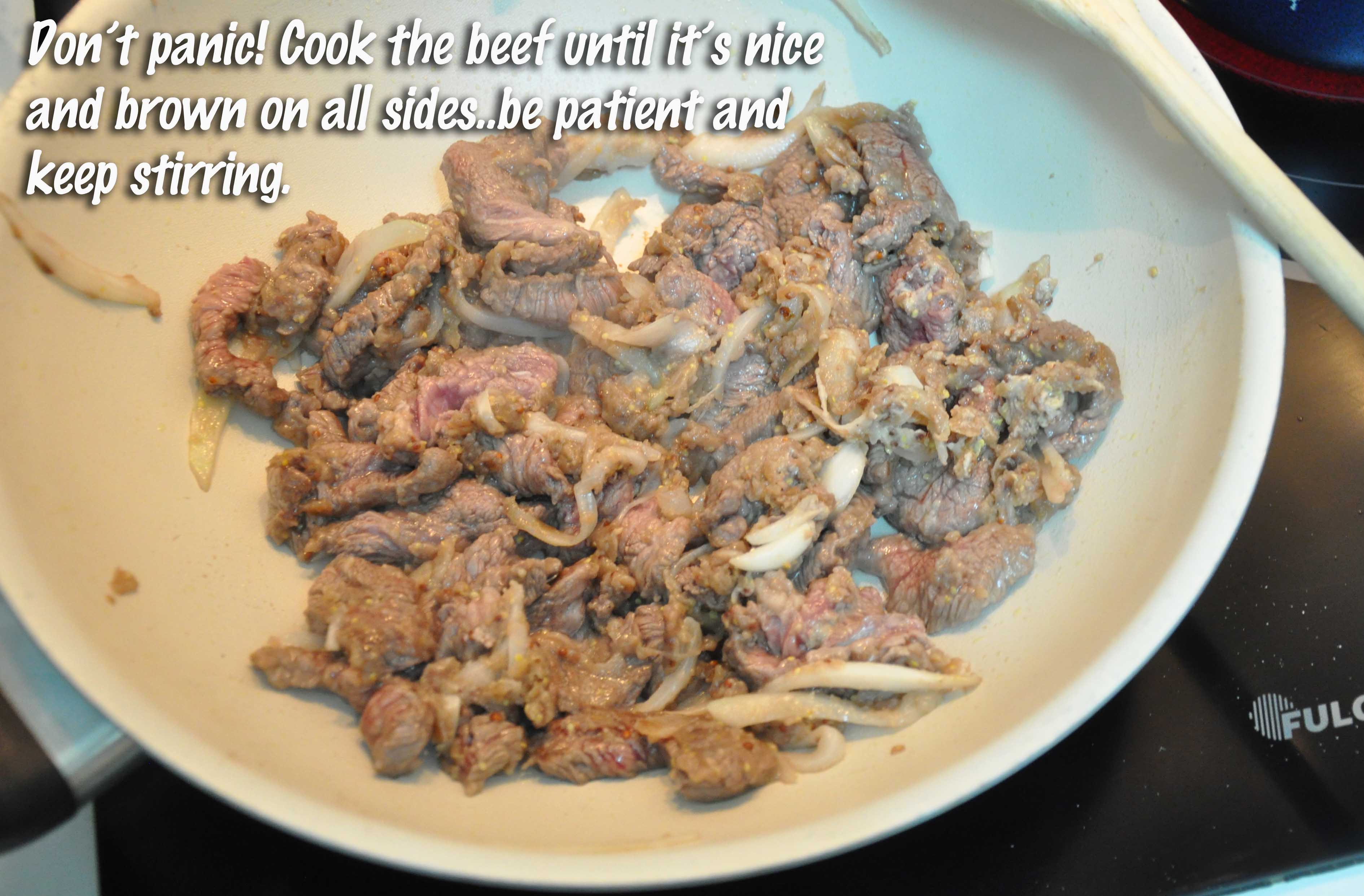 When you feel like cooking, get a very very good pan (it MUST be non-stick!) and put a dab of olive oil. Coat the marinated meat and onion with flour and, as soon as the oil is hot, dump it in the pan and sear.