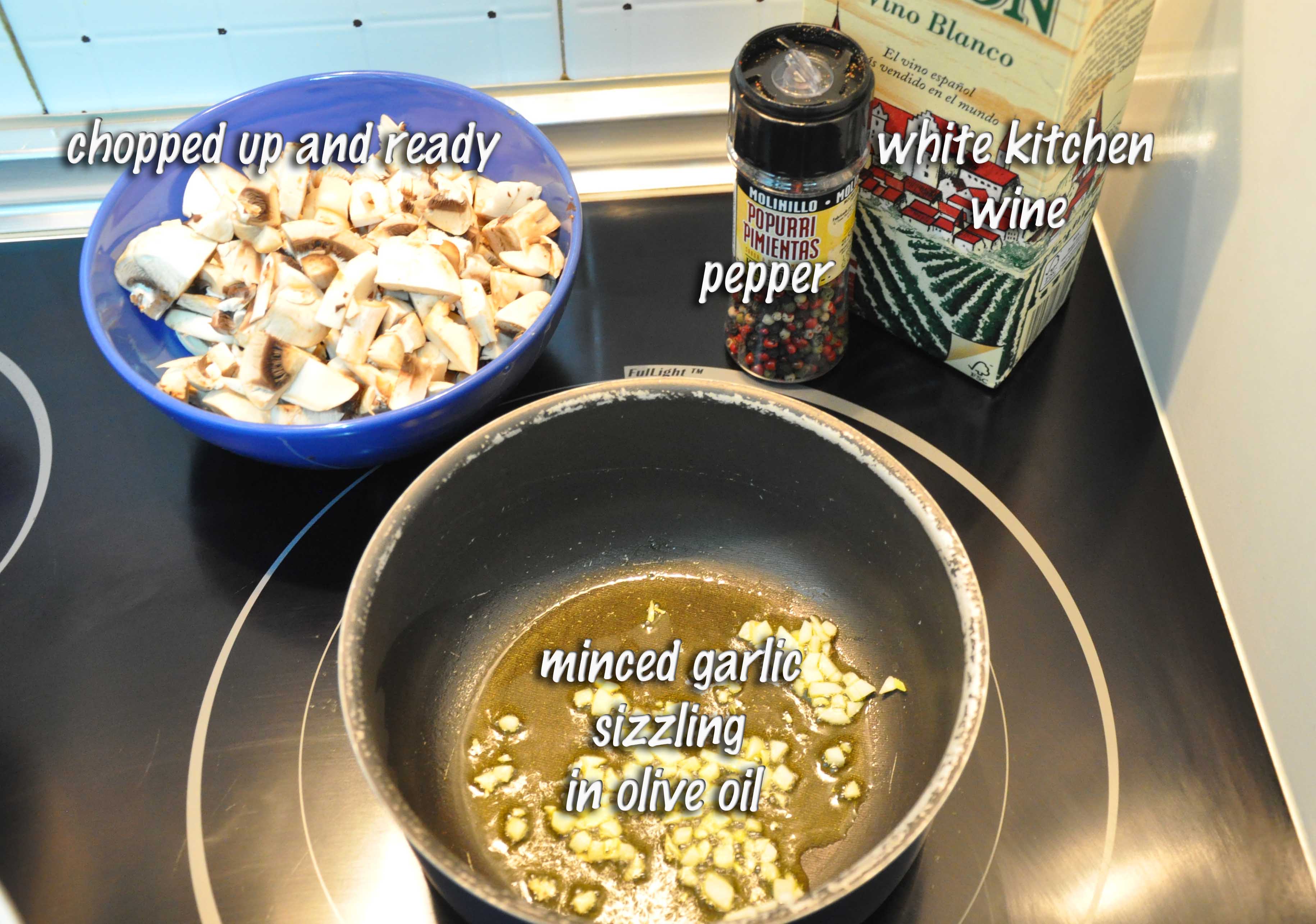 Coarsely chopped champignonthe ingredientsDrop them in the oil before the garlic starts to brown. Season. When they’ve lost a lot of water, add the wine. Let it evaporate, then you can add: cream, fresh white cheese, parsley, thyme…or anything else you might want to try!