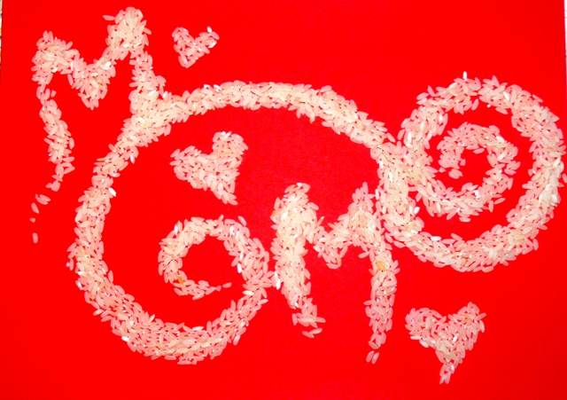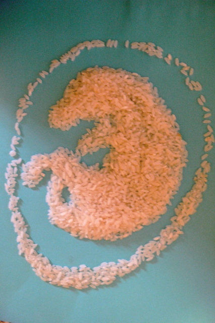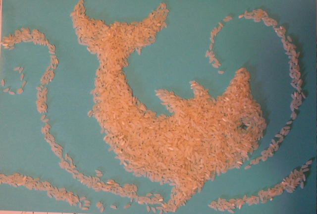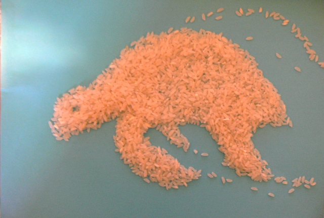 A long, long time ago I was in Portugal. Studying otters. And one evening, home alone, I was chatting on skype (with whom? I don’t remember). It was raining outside and I had worked, walking through mud and water, all day. A risotto would be nice, I remember thinking. Kitzy-poo (our family cat, who came with me to Portugal) curled up on my lap – a personal and eternal hot water bottle. She purred. I chatted. The skype call must have been impromptu, because I had all the ingredients for the risotto on the table already. What happened next was not planned, not expected and..well, quite cute I must say. Doodling with food, I guess…