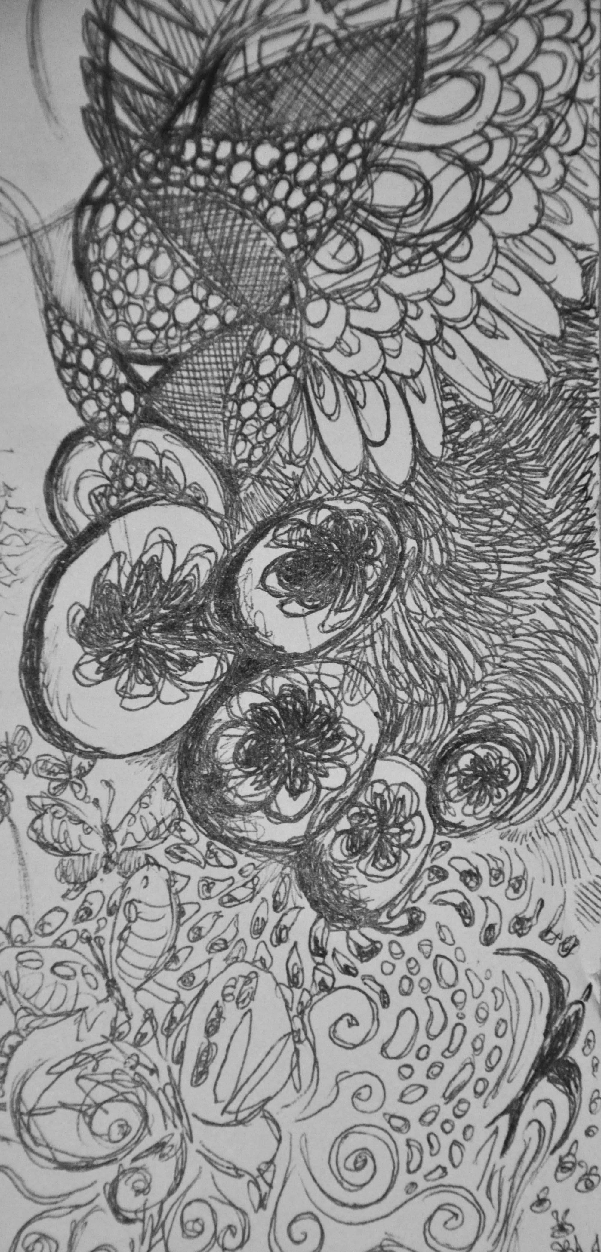 And then, as it often happens, I drew the body but didn’t like it. Got stuck with the arms and…bored. So I drew my bear. I draw him a lot, and he’s nearly always surrounded by bubbles and bees. And I drew an orca. Because why not.