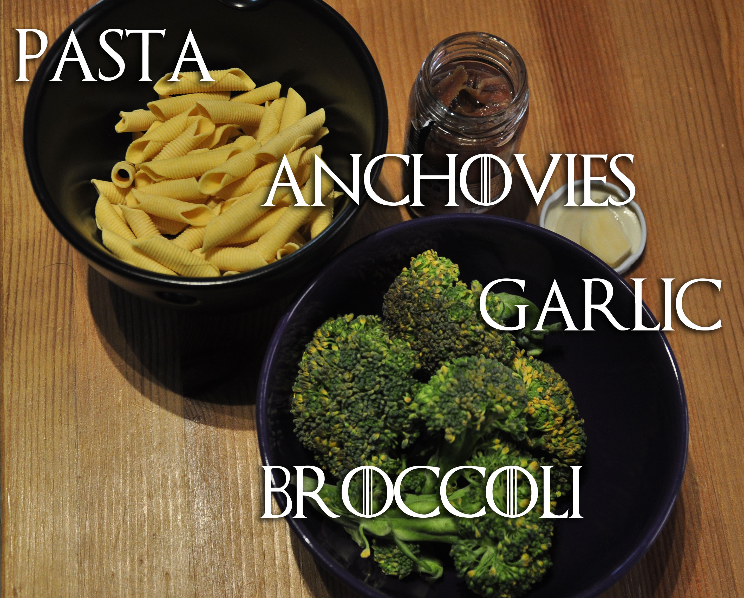 These are the ingredients. Together with the usual oil, salt and pepper. The font is epic because, you know…Game of Thrones.Chop up and boil the broccoli in salt water for not more than 5 mins – they have to be tender but still firm.In a pan put a spoonful of oil – you can use chilli oil, to make it more interesting – the garlic and three anchovies (for one person). Cook until the anchovies start to dissolve (2-3mins)Lightly strain the broccoli (if there’s some water left, even better) and sautée them with the sauce you made