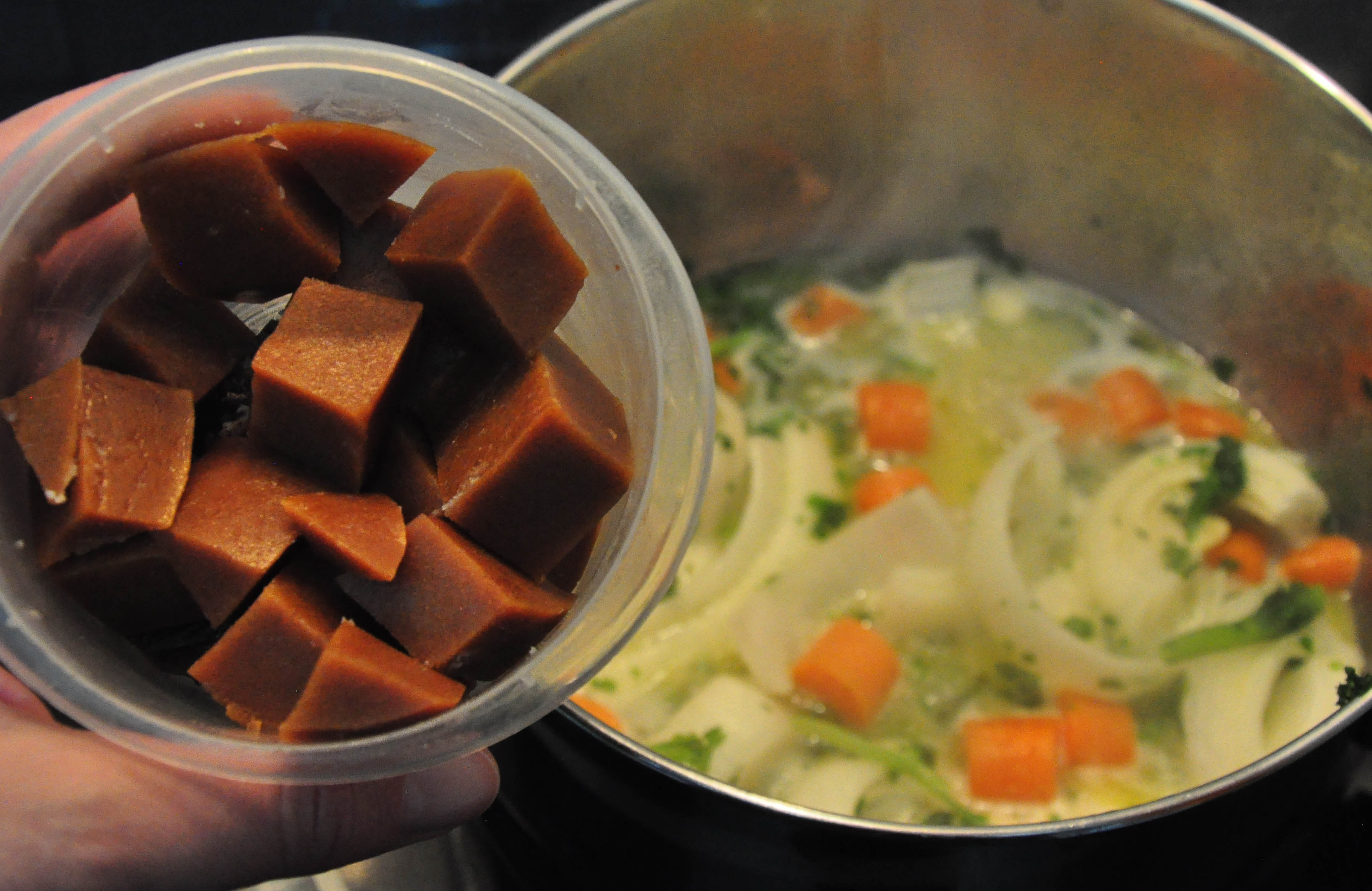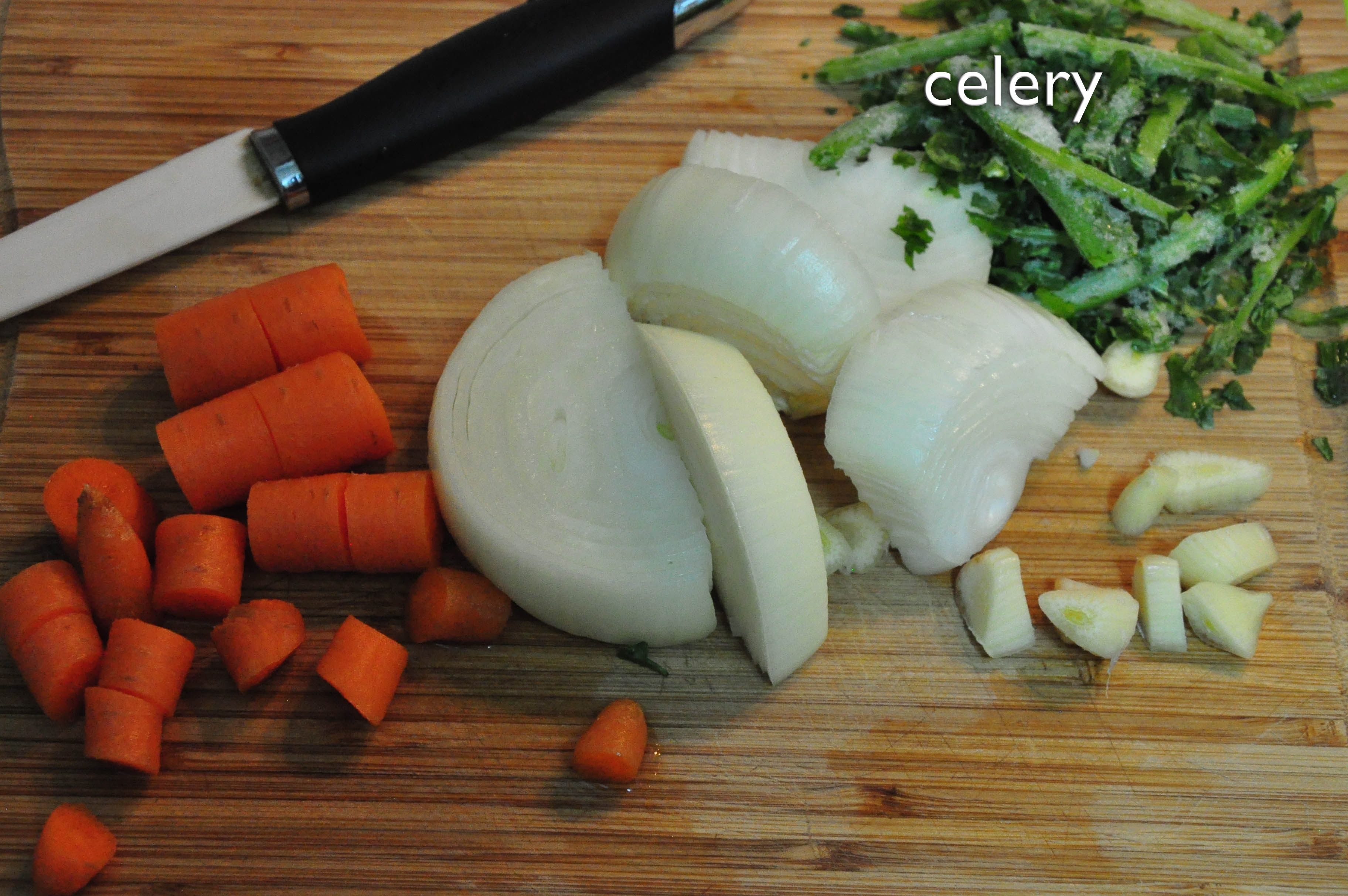 Not in the photo: oil, butter, salt, pepper and the celery that’s in one of the next photos. The carrots, as you might have noticed, were frozen. I love freezing things for “emergencies” …or when I’m feeling particularly lazy 😀Chop up the veggies in a haphazard way, remembering to include the celery that you forgot to put in the previous photo. This was frozen, too.Put the veggies (but not the tomatoes!) to simmer in a mix of oil and butter. When they’re nice and soft, add some stock and let it melt. Add a glass of warm water.