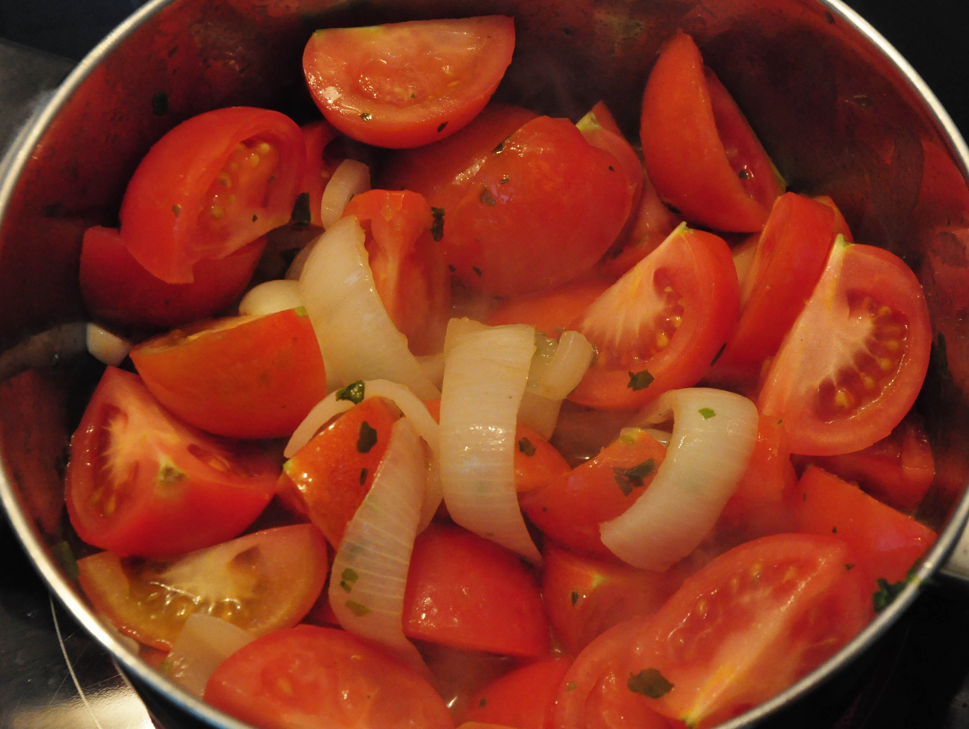 When the stock is nicely absorbed, add the coarsely chopped tomatoes. Let them simmer, then add water (if you put a bouillon cube) or more stock until they’re just covered. Let them cook….and cook…..