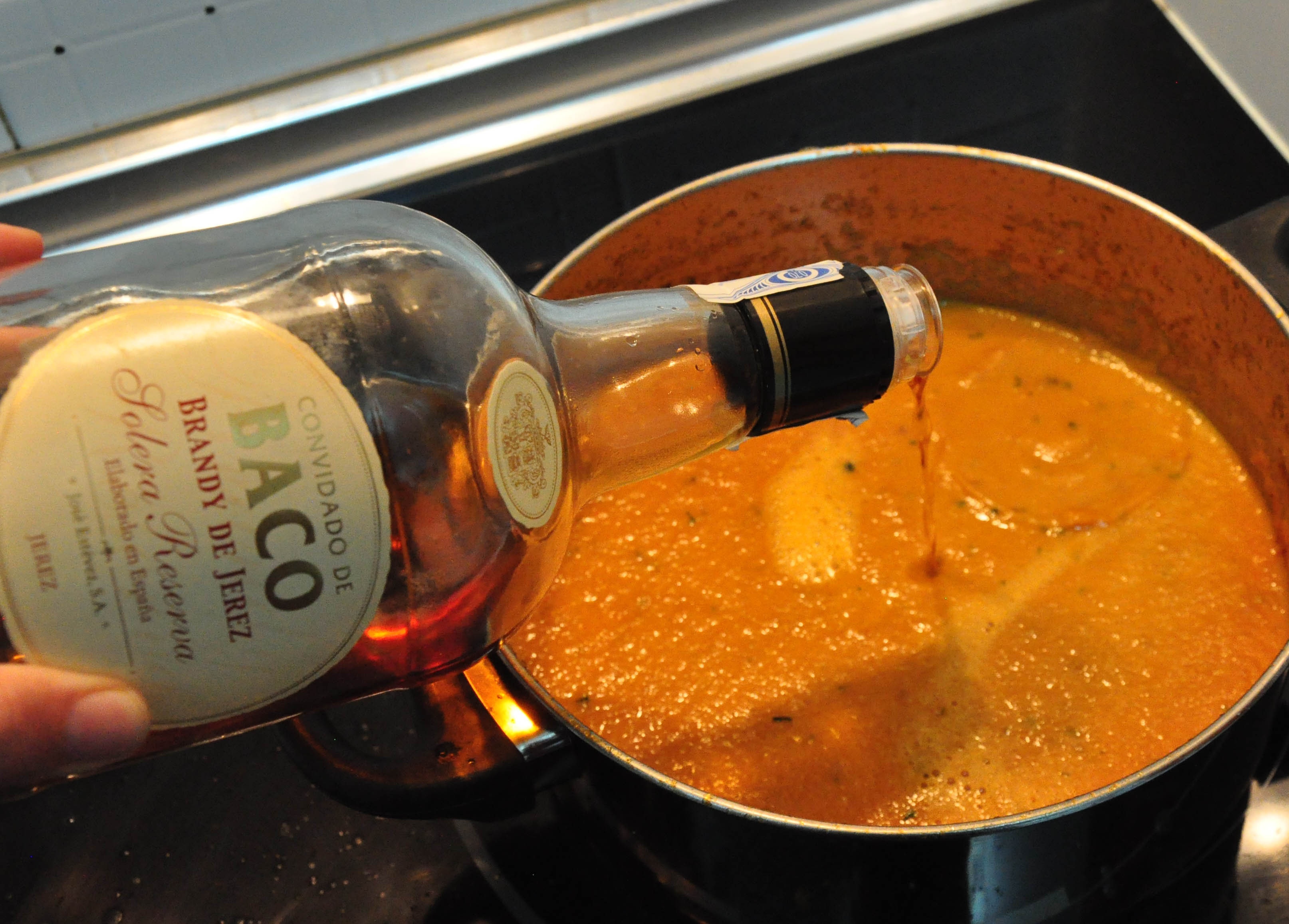One of the recipes called for sherry at this point, and I remembered that onion soup also needs something alcoholic at the end (I think I remember brandy) so since we didn’t have any sherry on hand we added brandy. On second thoughts however maybe port would have been a better choice because it’s more liquory.