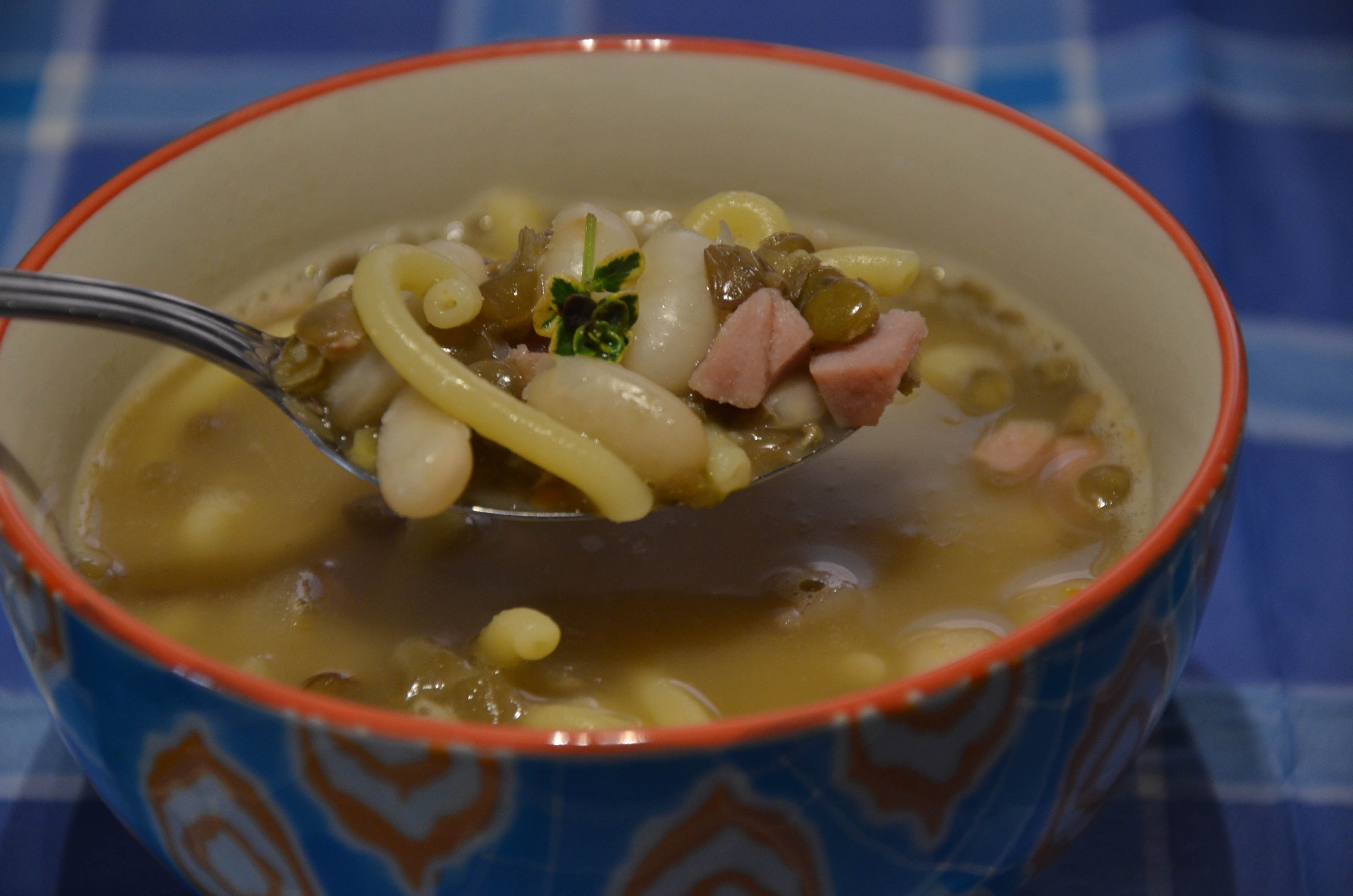 And yesterday I was hungry, but didn’t feel like cooking. What I felt like doing was cuddling the friendliest of our foster rats (yes, we’re currently fostering a trio of pet rats that are looking for a forever home) and research bruxing, which was at that moment much more interesting than cooking (sorry, stomach!). So when (around three pm) I headed to the kitchen (about five steps from the sofa) I opened the freezer and a simple but effective idea formed in my head: legume soup. Or better: lentil and white bean soup with a little addition of pasta and homemade stock. (no chickpeas, I had finished those aaaages ago). Oh! And some diced ham that we had frozen before a trip we went on.