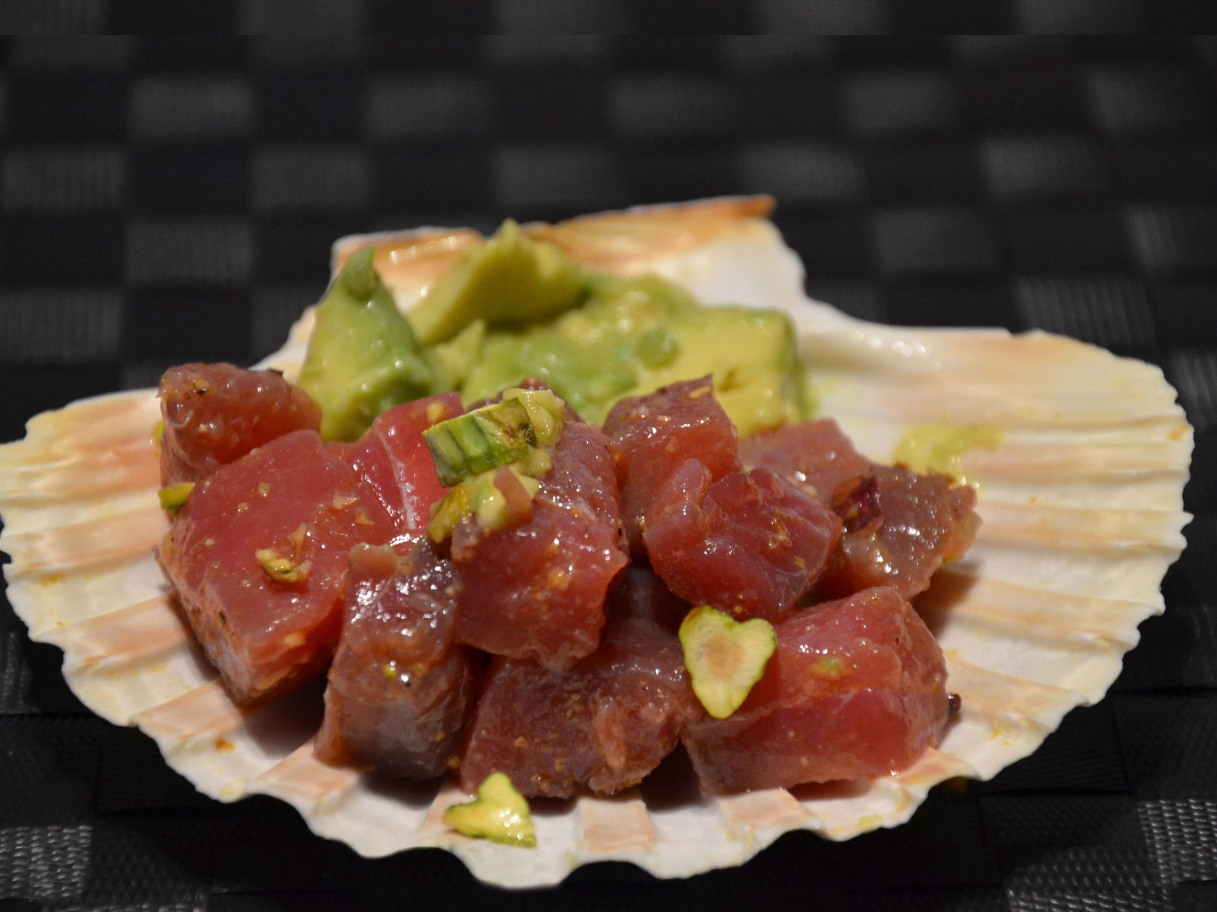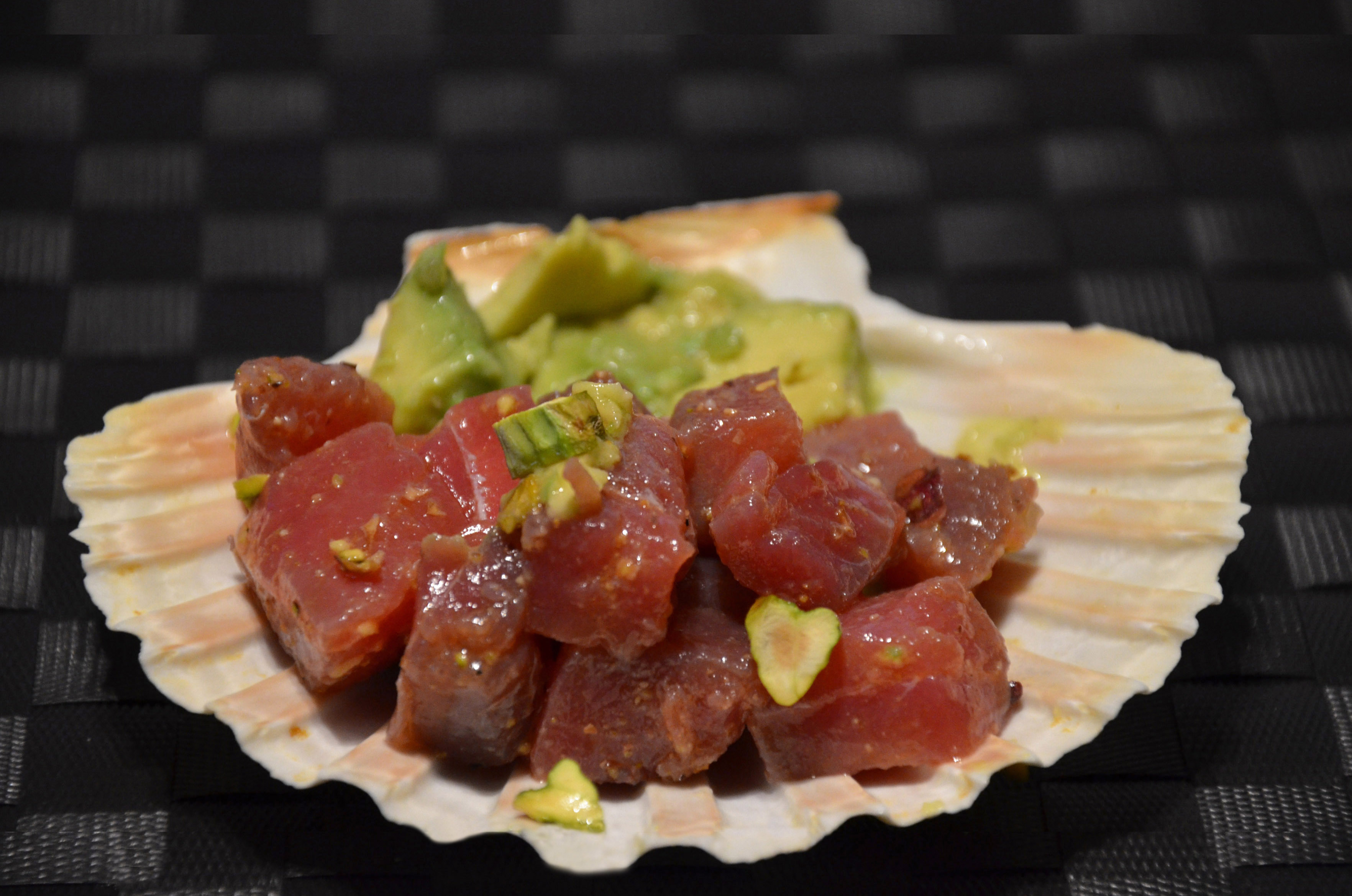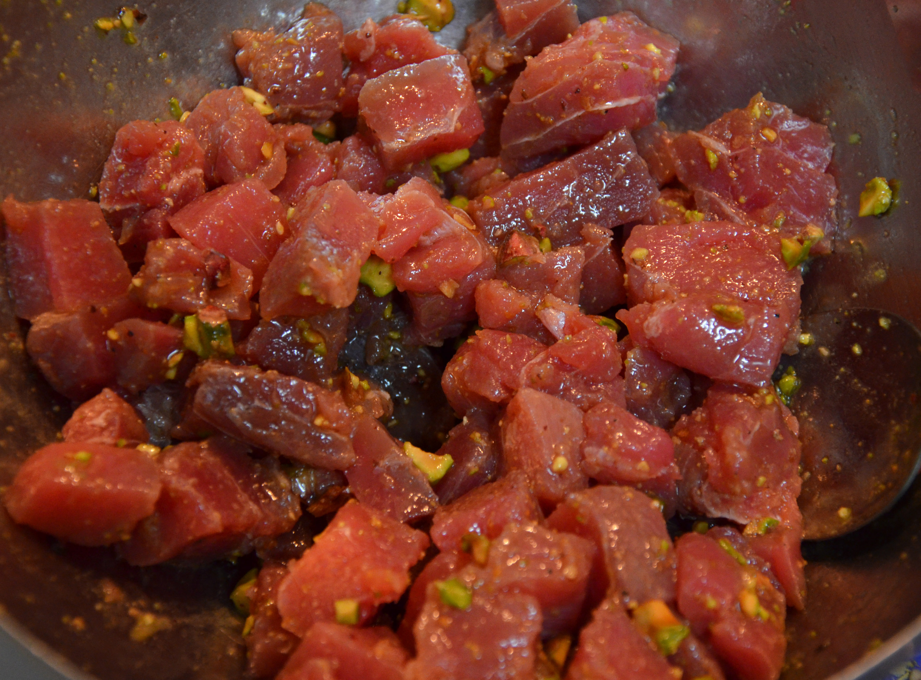 dice the tuna, dice the avocado, grind the pistachios with a mortar and chop some into little pieces (so you both have powder and chunks) and make the dressing.