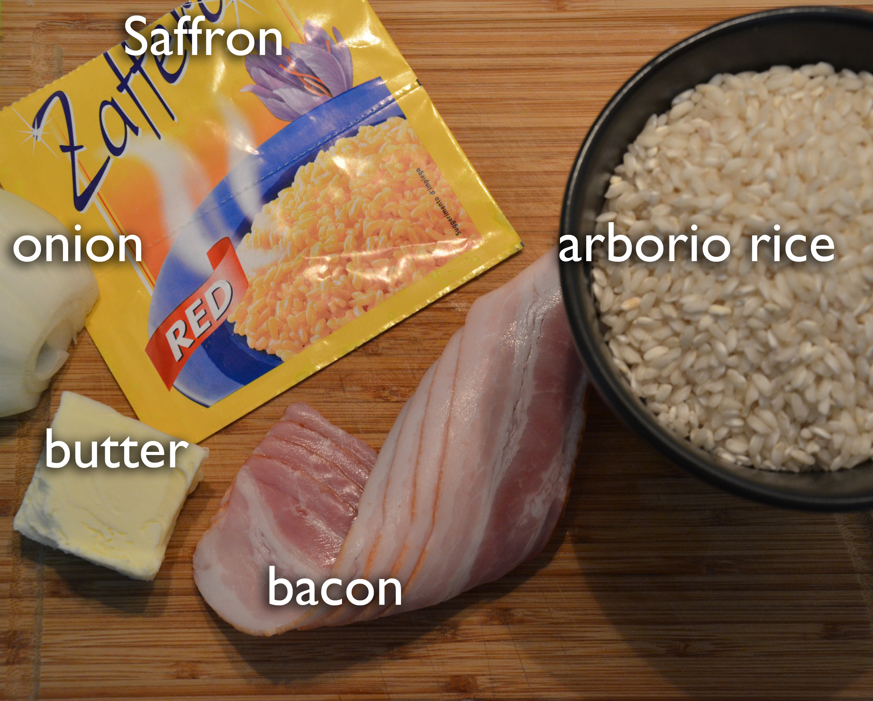 The ingredients you will need. Not in the photo: the bouillon cube, the white wine, black pepper and more salt, if needed.The only prepping you need to do is this.In a hot, non-stick pan add the bacon and wait for the fat to start melting.Add the onionAdd the bouillon cube and the pepper. I like adding the bouillon cube now, so the onion and the bacon and, in a second, the rice can fully absorb all the tasteIf you see that the bouillon cube is struggling to dissolve, add a little amount of water. Here I added a little less than half a glass of warm water.Now the rice. Turn the music off, turn the tv off, turn the air vent off and listen – this is the most important moment! Put the rice in and it will sizzle, absorbing all the yummy liquids that were in the pan. As soon as it goes quiet, add a large glass of white wine and let it absorb that completely, too.After the wine has been absorbed, put in a ladle of stock or, if you added the bouillon cube before, just the hot water. Let the rice absorb that and then continue adding stock/water until the rice is nearly ready (about 12/15mins after you started cooking it)3 to 5 minutes to the end, when the rice is soft but still a tiny bit hard in the center, add the saffron. I use italian, powdered saffron. I tried with the spanish one but it’s not as tasty; I tried with the whole pistils but again, not as tasty. One small bag is enough for 200grs of rice (I think they weigh 2grs each)Stir the rice – this should be the colour you get. Taste it. If the colour is too dull or you can’t taste the saffron, add some more!Last but not least, the butter. Butter should be added when the rice is basically ready, and not cooked but simply melted into the risotto. In this image the stove was off: I stirred until the butter melted and the risotto glistened.And you’re done! Not as easy as other recipes in this blog, but certainly rewarding. Remember: risotto needs love and constant attention. If you like it, at this point you can add some parmesan. If not, you’re good to go.