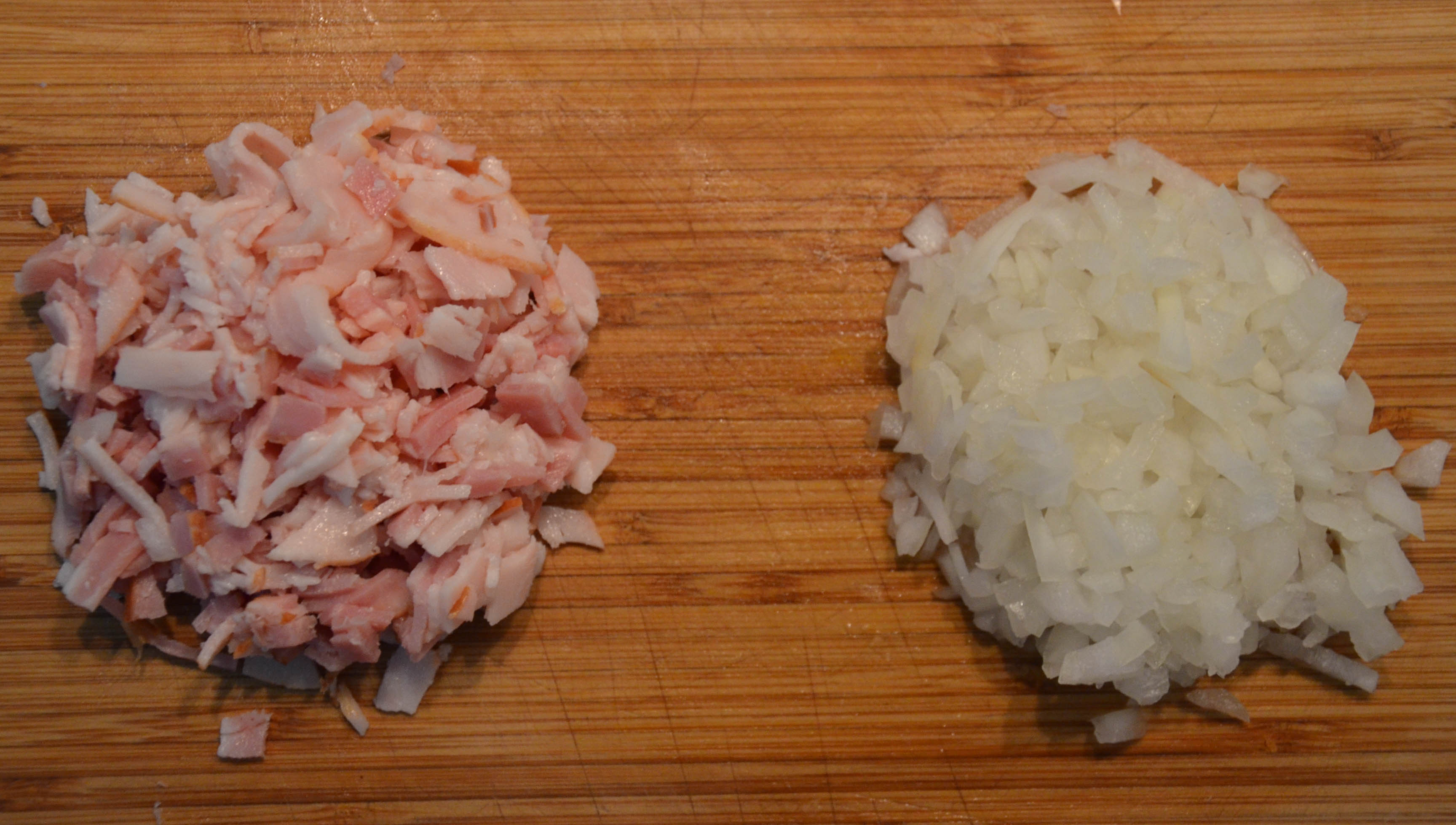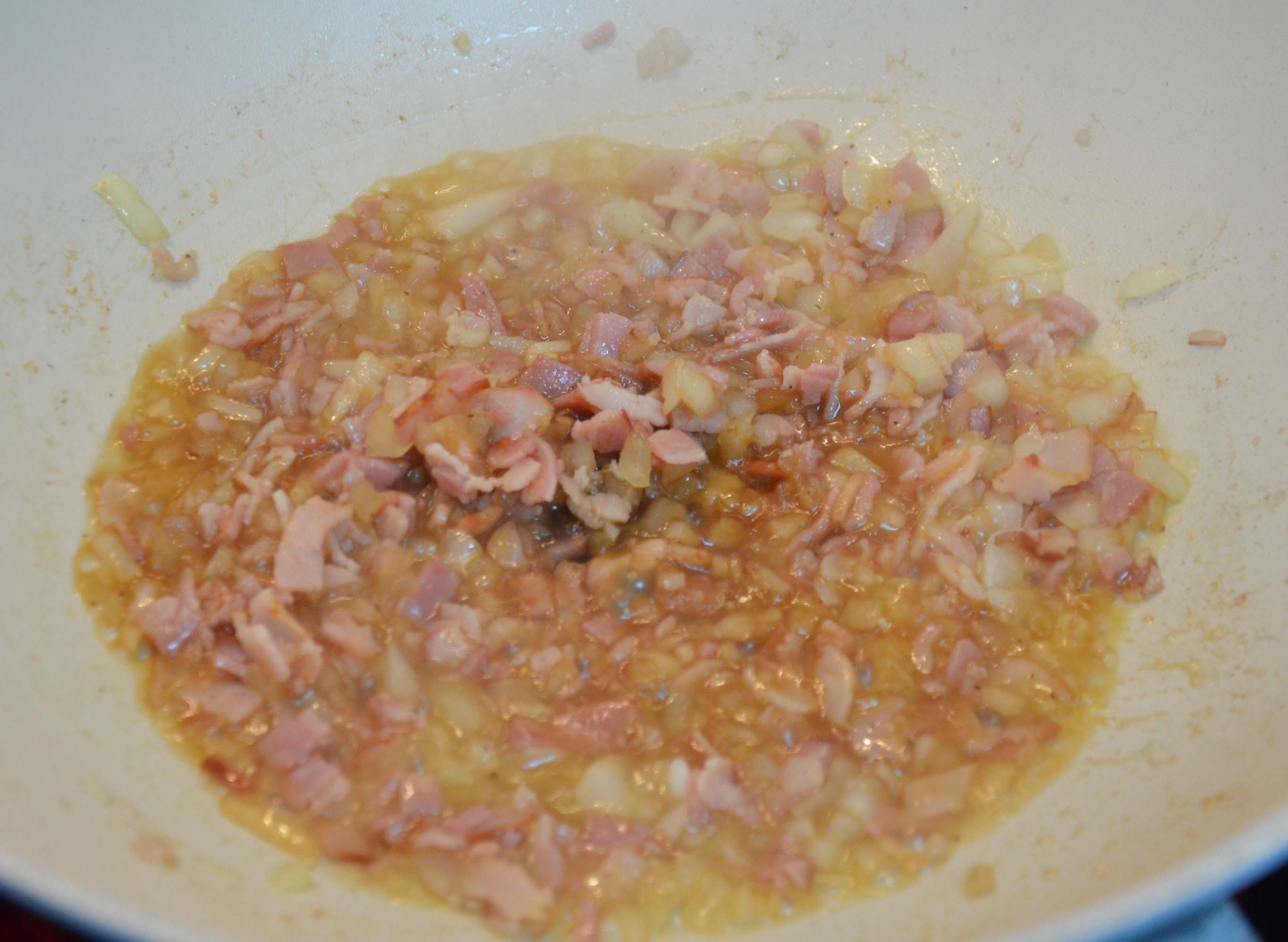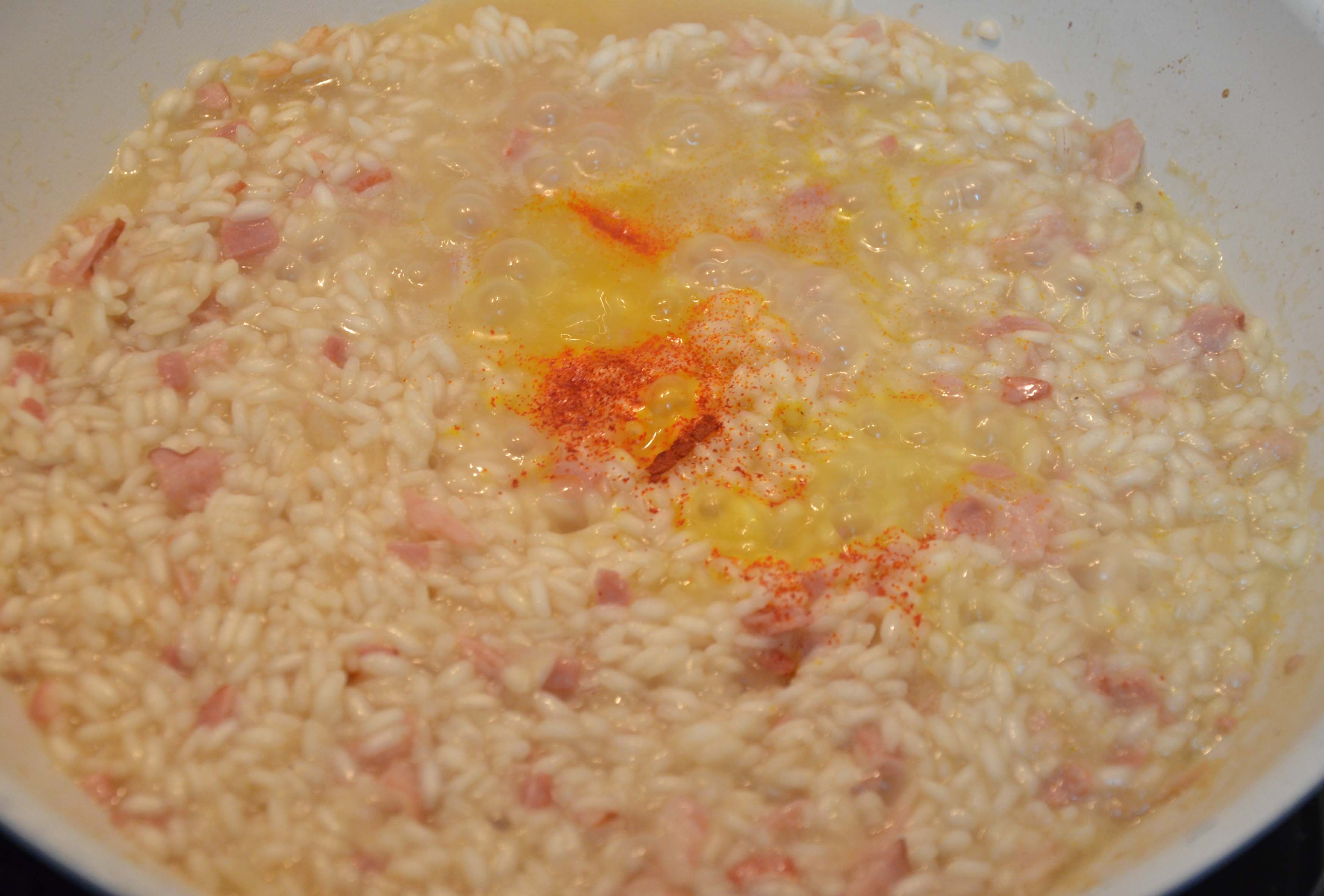 The only prepping you will need to do for this recipe is chopping up the onion and bacon, heating some stock (or water, if you’re adding a bouillon cube at the beginning like I do) and measuring the rice. Since the saffron and bacon aren’t as substantial as, say, pumpkin and sausage, I’d recommend about 80/100gr of rice per person. If you want the guests to be happy. Also, I used one store-bought bouillon cube in this recipe for four people. FYI.