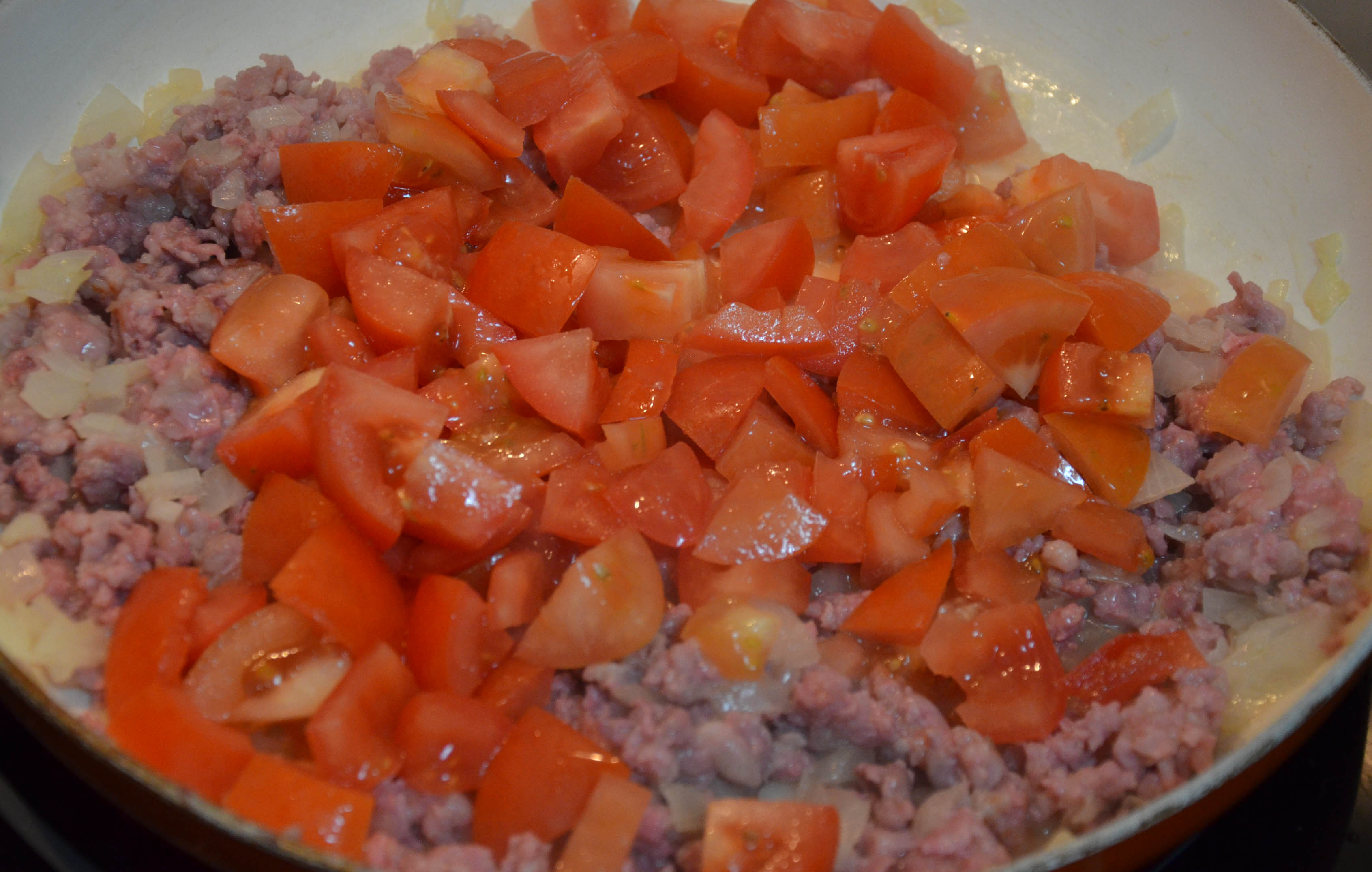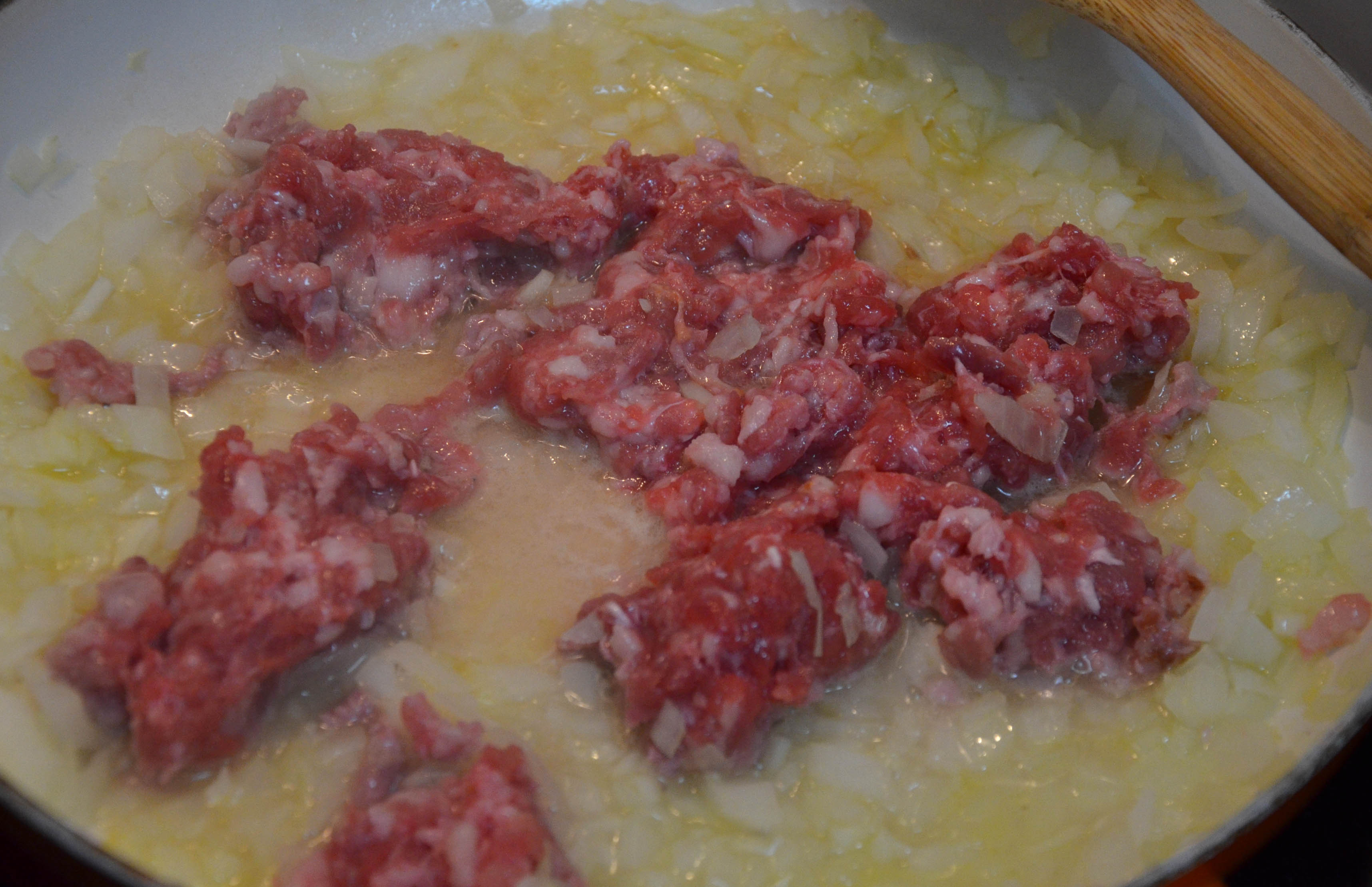 Put some oil in the pan, heat, add the chopped onion and garlic. Cook until soft.Add the sausage. For this recipe, I bought just the sausage filling, not the actual sausages because it was cheaper and easier – I would have emptied the sausages either way!
