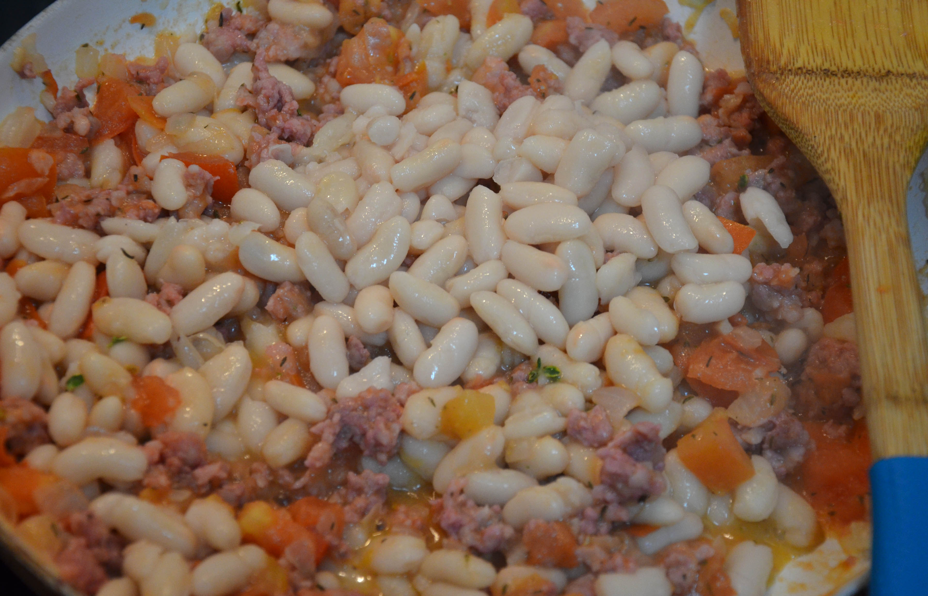 Throw in the chopped tomatoes.and then the cannelloni white beans. I used the ones from a can, rinsing and straining them, but I think if you make your own from the dried goods would be better. Add pepper, salt and fresh thyme.Now just heat the filling – the beans don’t need to be cooked again. Mix well and let it sit while you prepare the chicken.Rinse the chicken and pat it dry. Massage in the olive oil, lather it with salt (I use that verb to remind me to put more salt than I would normally, which always seems to be to little!) and pepper and rub it in. Gordon puts paprika on the chicken at this point, which I can’t … you know now. I’m allergic. But feel free to add some yourselves – it looked amazing!