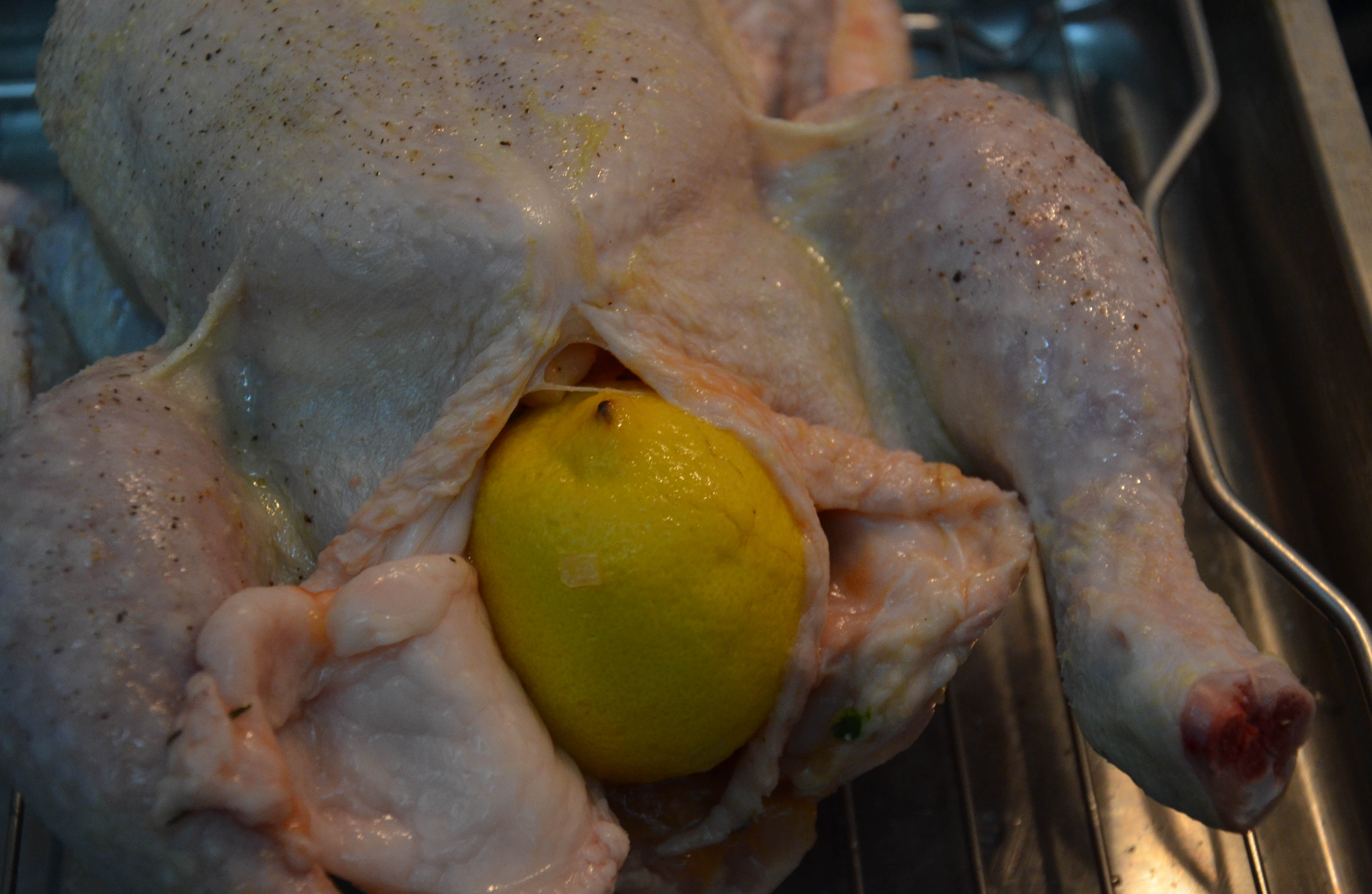 Squeeze the lemon in the juices, empty the chicken of the stuffing, carve and serve, spooning some of the lemony juices over the dish.