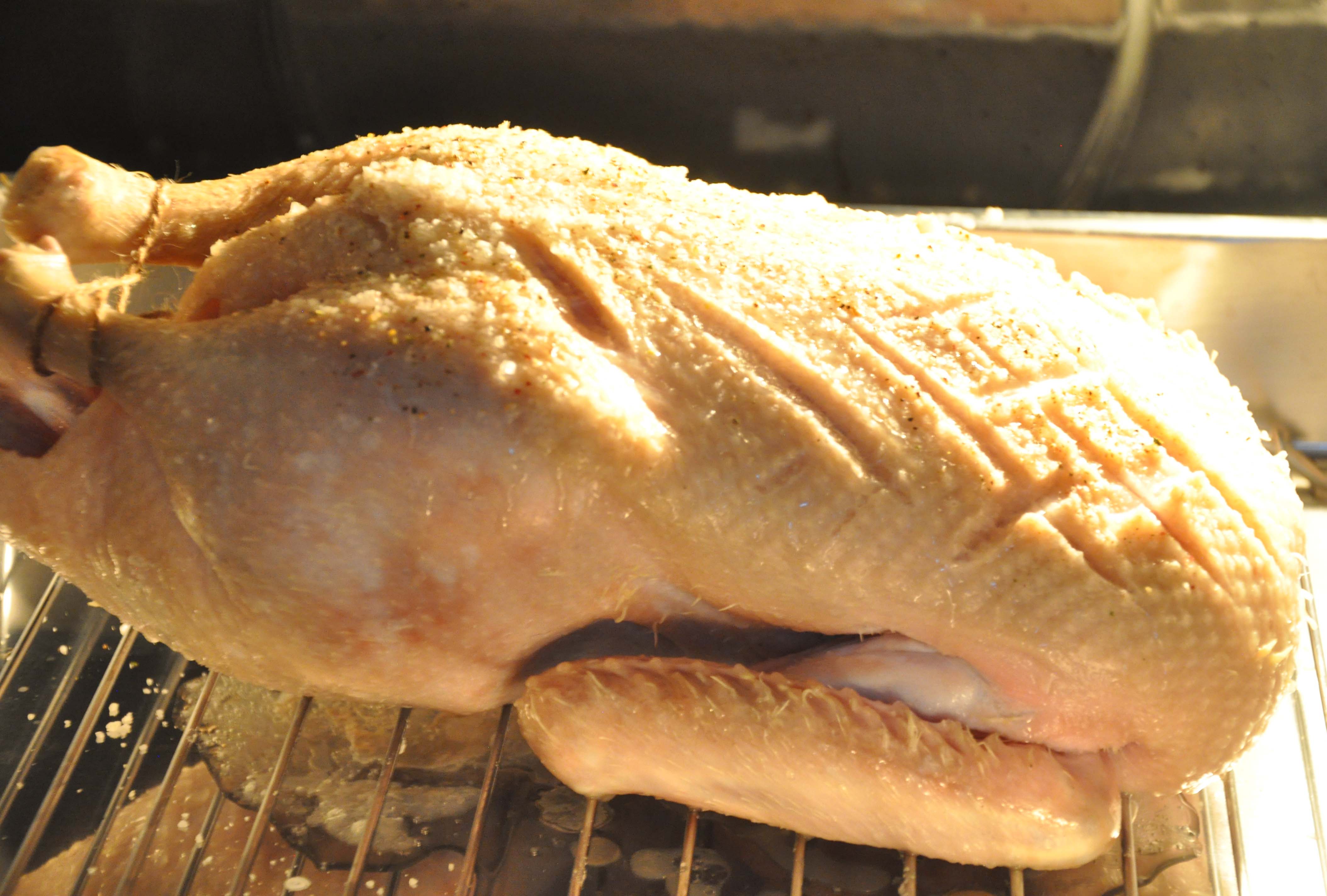Then, following a recipe from the web (forgive me but I can’t remember where I read it and can’t seem to find it now) I did what seems to be the second most important thing: carving the thick layer of fat so it drips and the duck becomes the crunchy yet moist meat we all know and love.