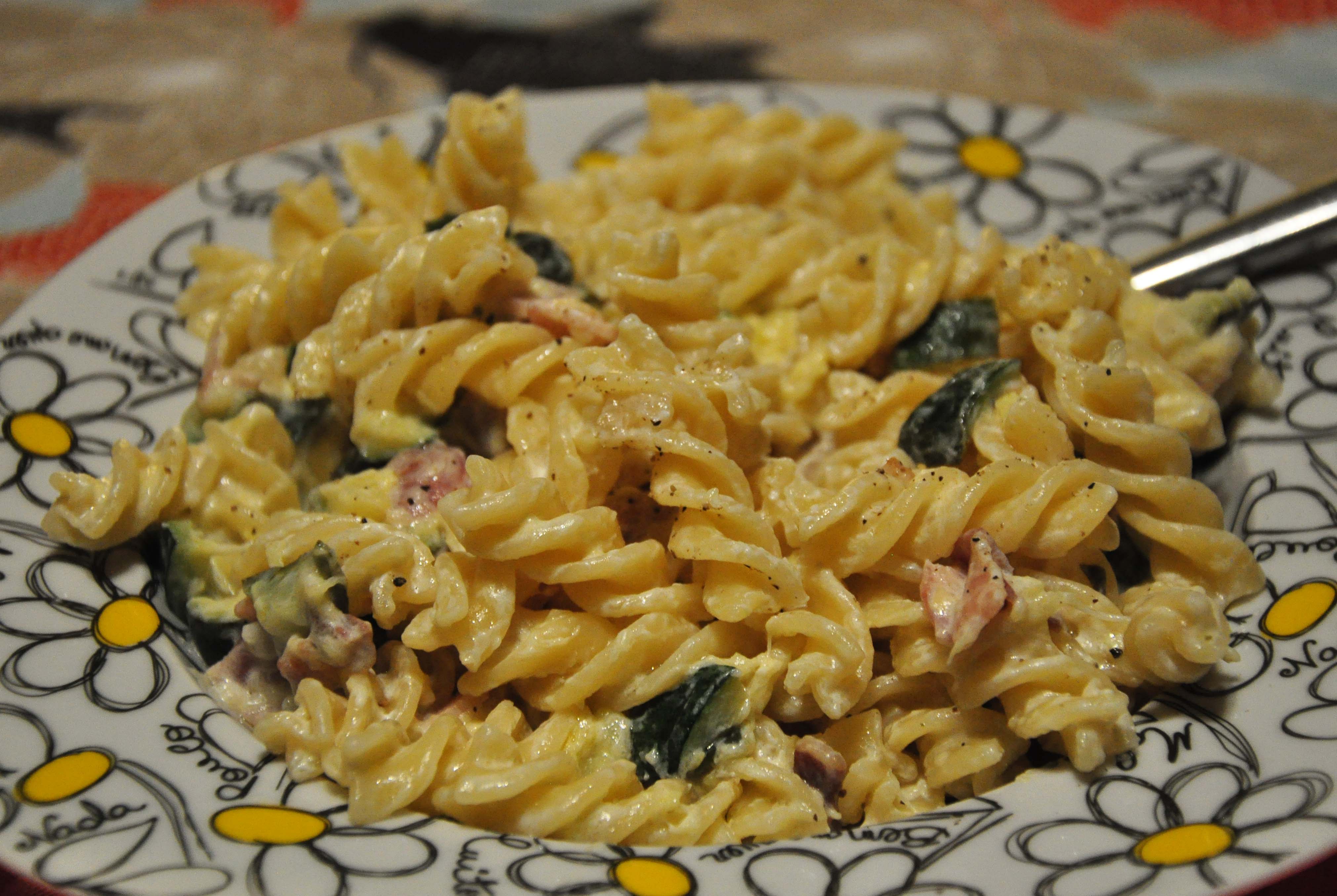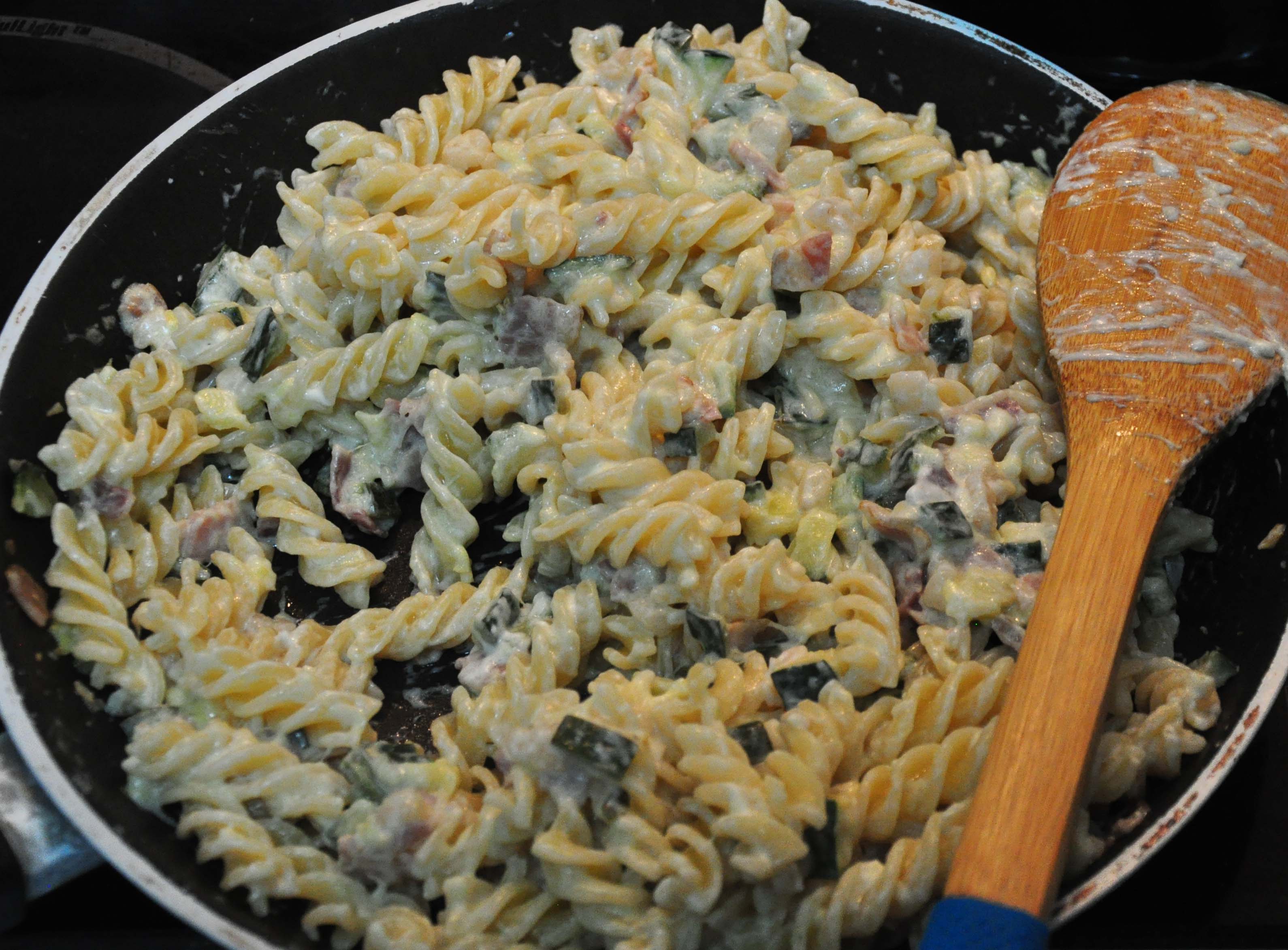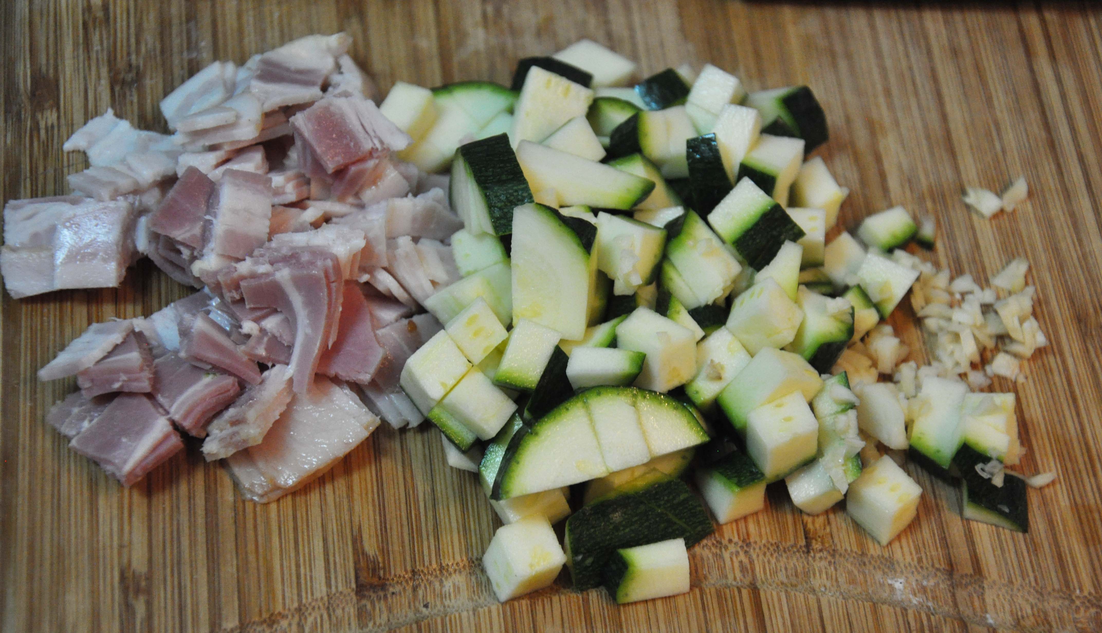 Chopped up some garlic, zucchini and baconlike so. Showing off my chopping skills.Dump the bacon and garlic in a hot pan with oil. Don’t put the garlic before, because it’s chopped so small that it’ll burn in one split secondWhen it starts to brown, it’s ready to welcome the zucchine!Add the zucchine, lower the fire to medium and if needed add some water (1/4 glass) or white wine. Zucchine need to cook slowly and absorb a lot of water.When the zucchine are soft – a fork can pierce them easily – but not mushy, add the heavy cream (or, if you don’t have that, fresh cheese will do), salt and pepper. Taste and turn off the fire when it’s all blended welladd the fusilli, al dente, and mix really well so every single fusillo is coated in sauce…Et voila! Done and ready to eat. If you want to, a little sprinkle of parmesan goes well with this dish 🙂