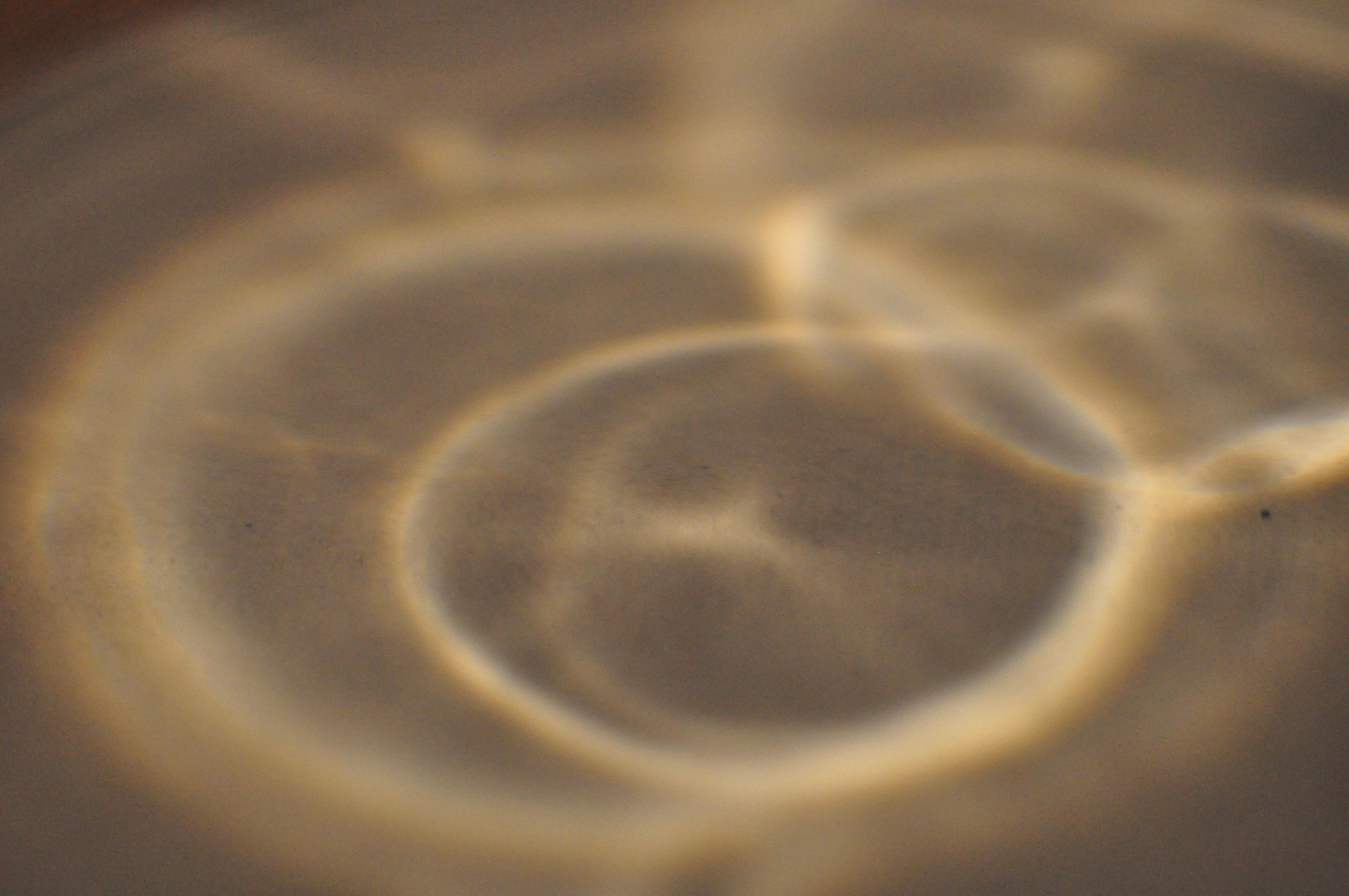 I don’t remember what we were doing, but suddenly our dining room table (yes, those that know that our house is basically a one-room-gig can now laugh) was flooded with circles of light, caused by the wine glasses we were working with.