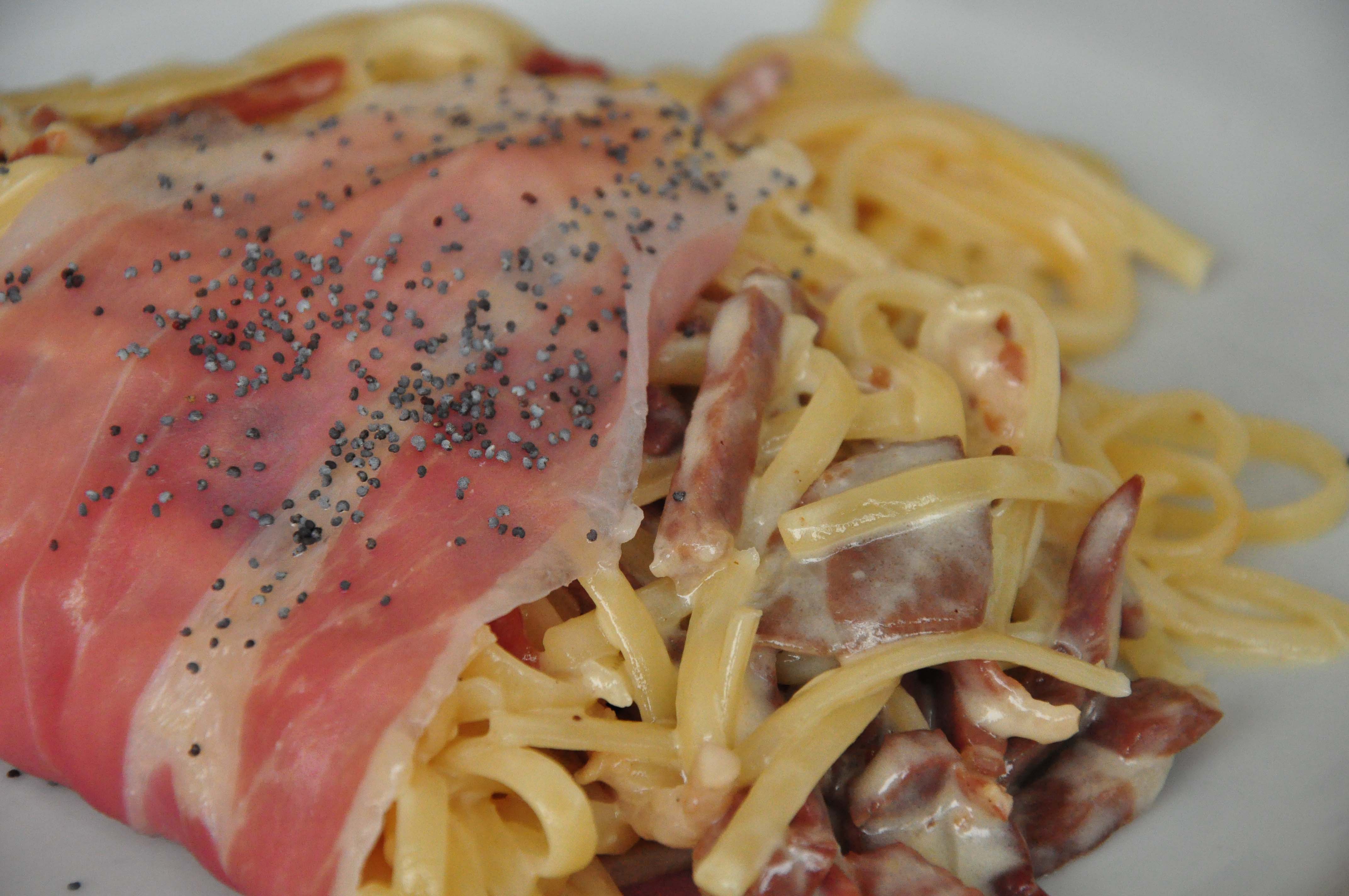 These are the ingredients: homemade tagliolini, prosciutto, onion and cream. Wrapped in a tissue-thin slice of prosciutto sprinkled with poppy seeds. Not much to it, but the flavour profile, you ask? An Italian explosion in your mouth.
