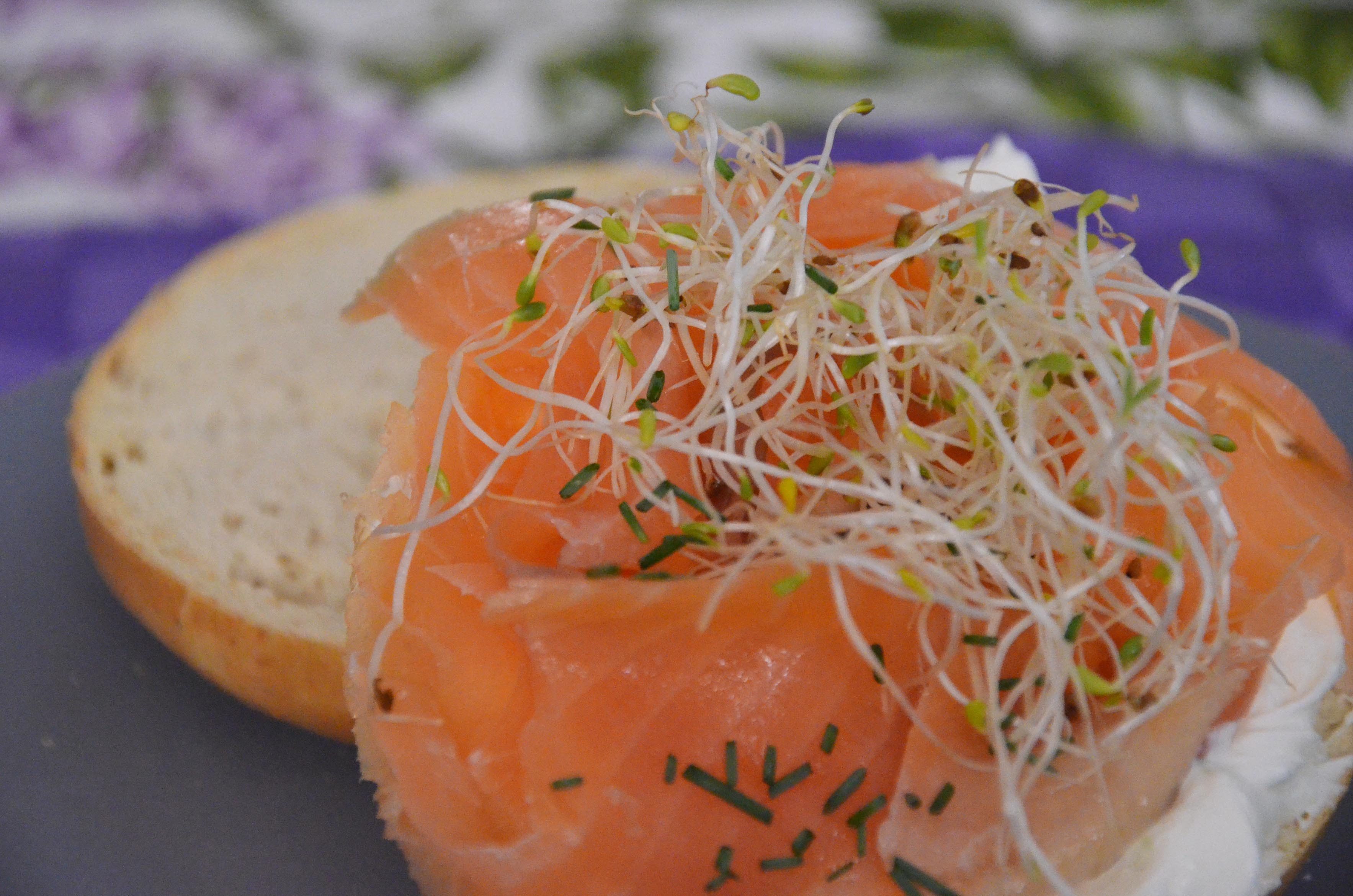 I like my bagels with alfalfa sprouts. Have you ever tasted them? I was looking for watercress sprouts but didn’t find them, and settled for alfalfa that turned out to be quite the substitute! Tasty and earthy but crisp and fresh, they went really well with the strong flavour of the salmon.