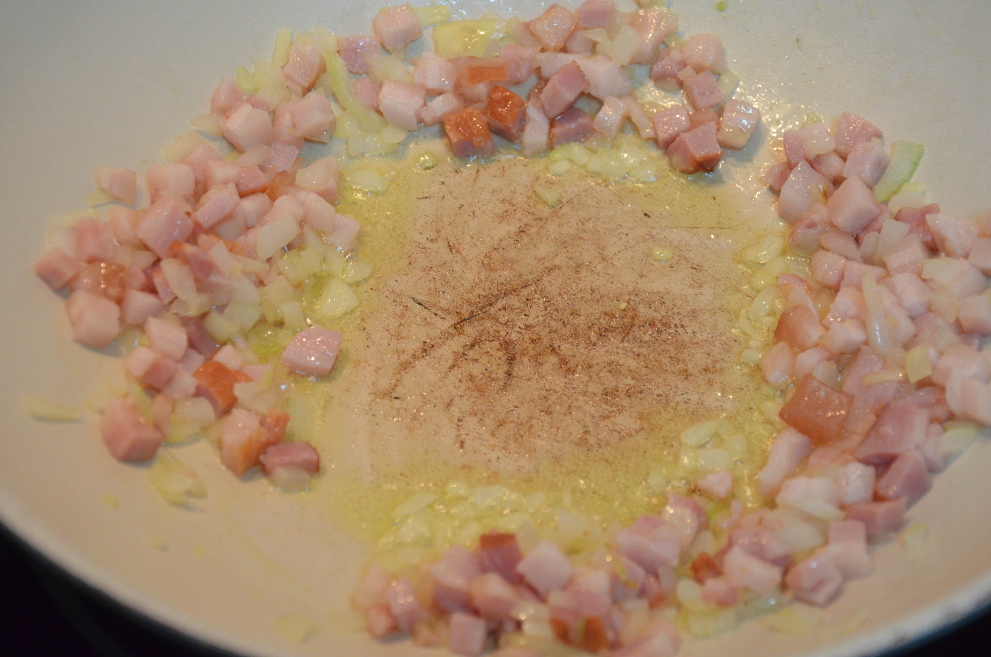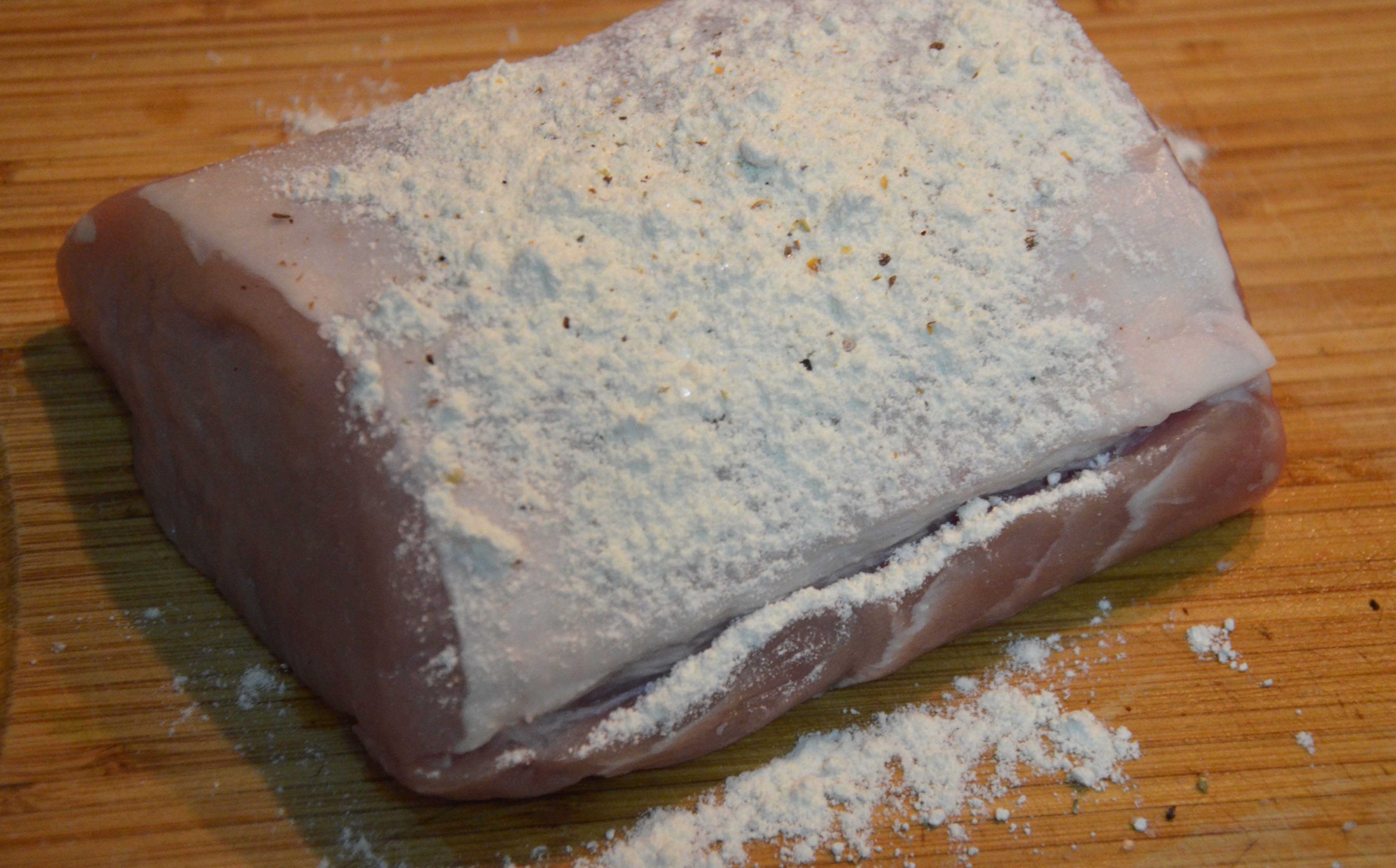 Start by simmering the diced bacon and chopped onion in your non-stick pan. You can add a slither of oil to help the onion to cook, but sometimes the bacon’s fat is enough.While the onion and bacon are cooking, coat the loin with flour, salt and pepper.Massage it in. Meat loves to be massaged.When the onion is translucent and the bacon has rendered all its fat, make some room for the loin