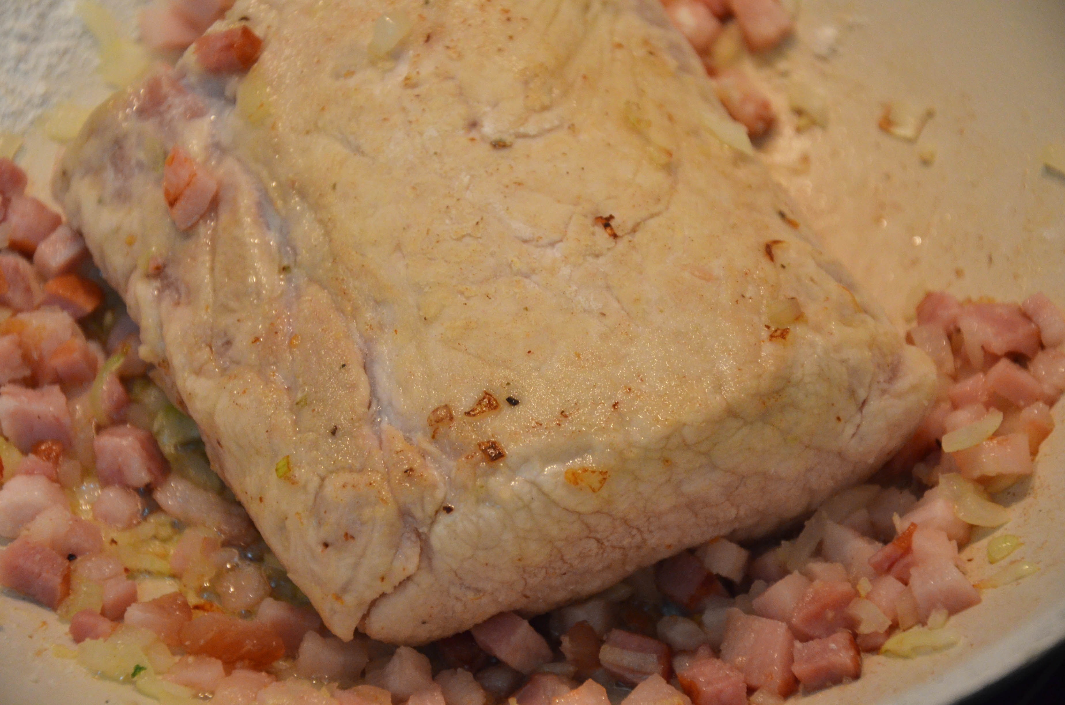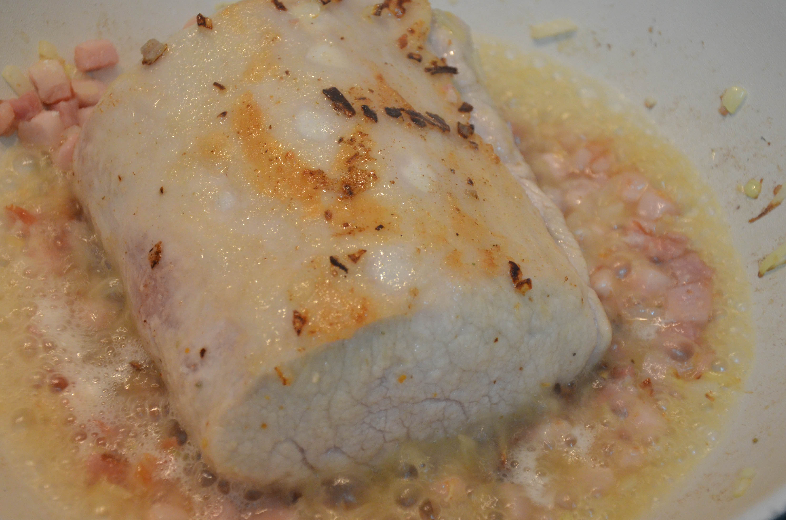 Lower the loin into the pan and sear it well on both sides (about 2-4mins per side)Remember that the flour will start absorbing the oil and the fat and that the bacon and onion are still cooking – if everything becomes too dry, add a tiny bit of white wine. Very little though, we want that loin to be seared beautifully!When the loin is seared on both sides, add about a glass of white wine. Let it evaporate.Now, for a generous spoonful of butter. Let it melt and remember to turn the loin so both sides get some goodness.When the butter is melted, add the bouillon cube and melt it into the butter. Stir, so everything is coated in bouillon cube goo. If you don’t have a bouillon cube, add some stock (about a glass) and wait for it to reduce to about half.