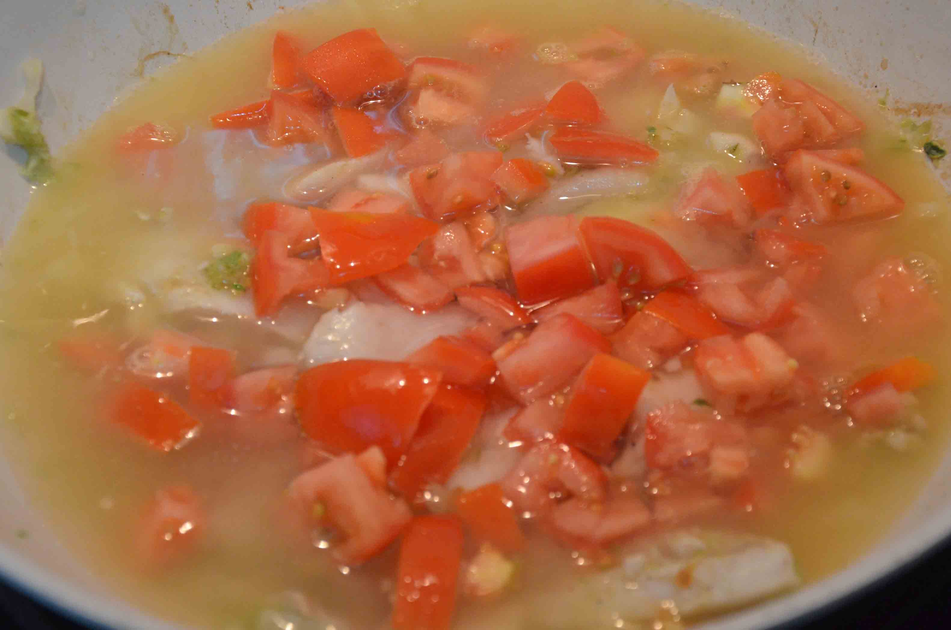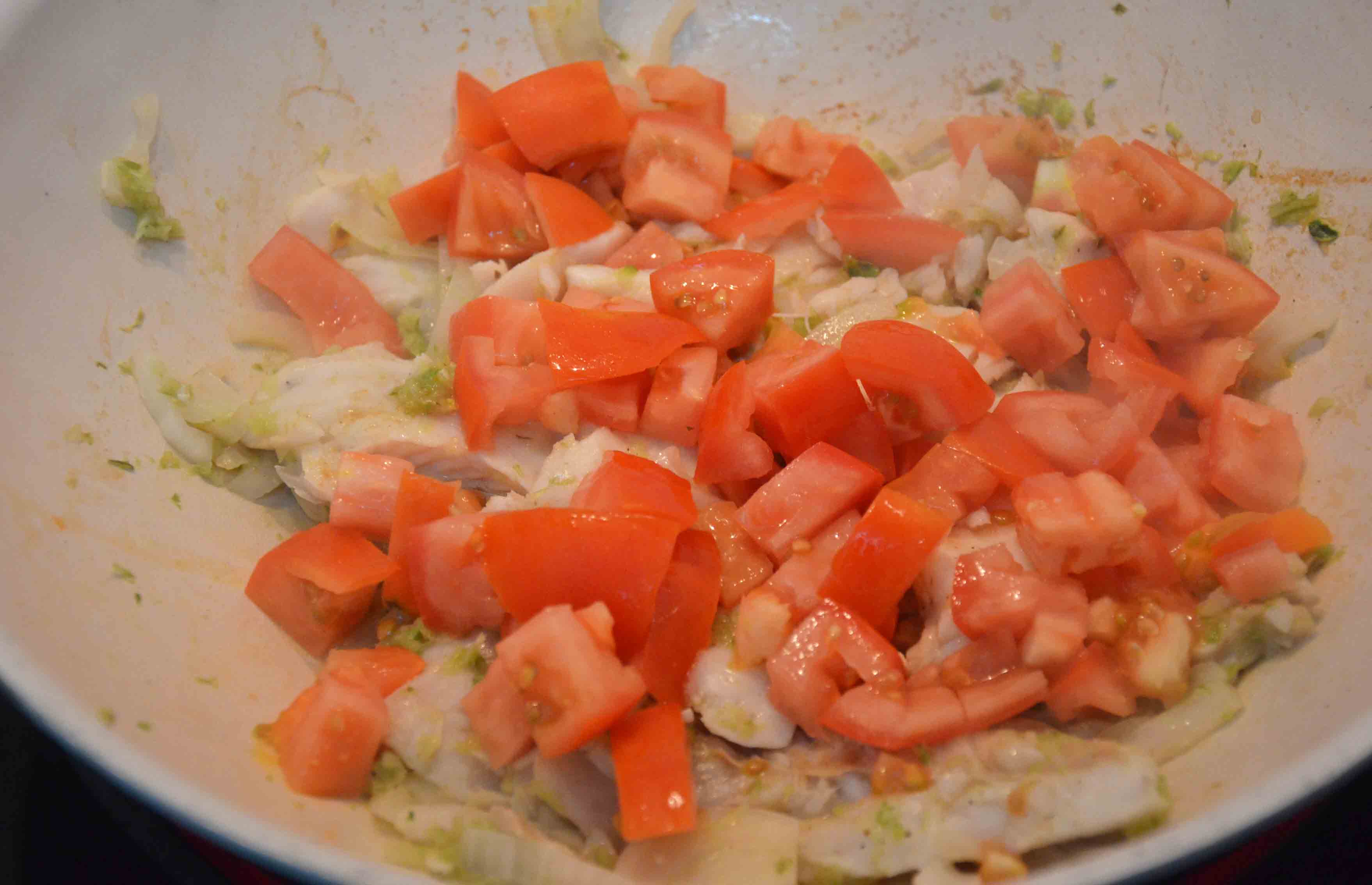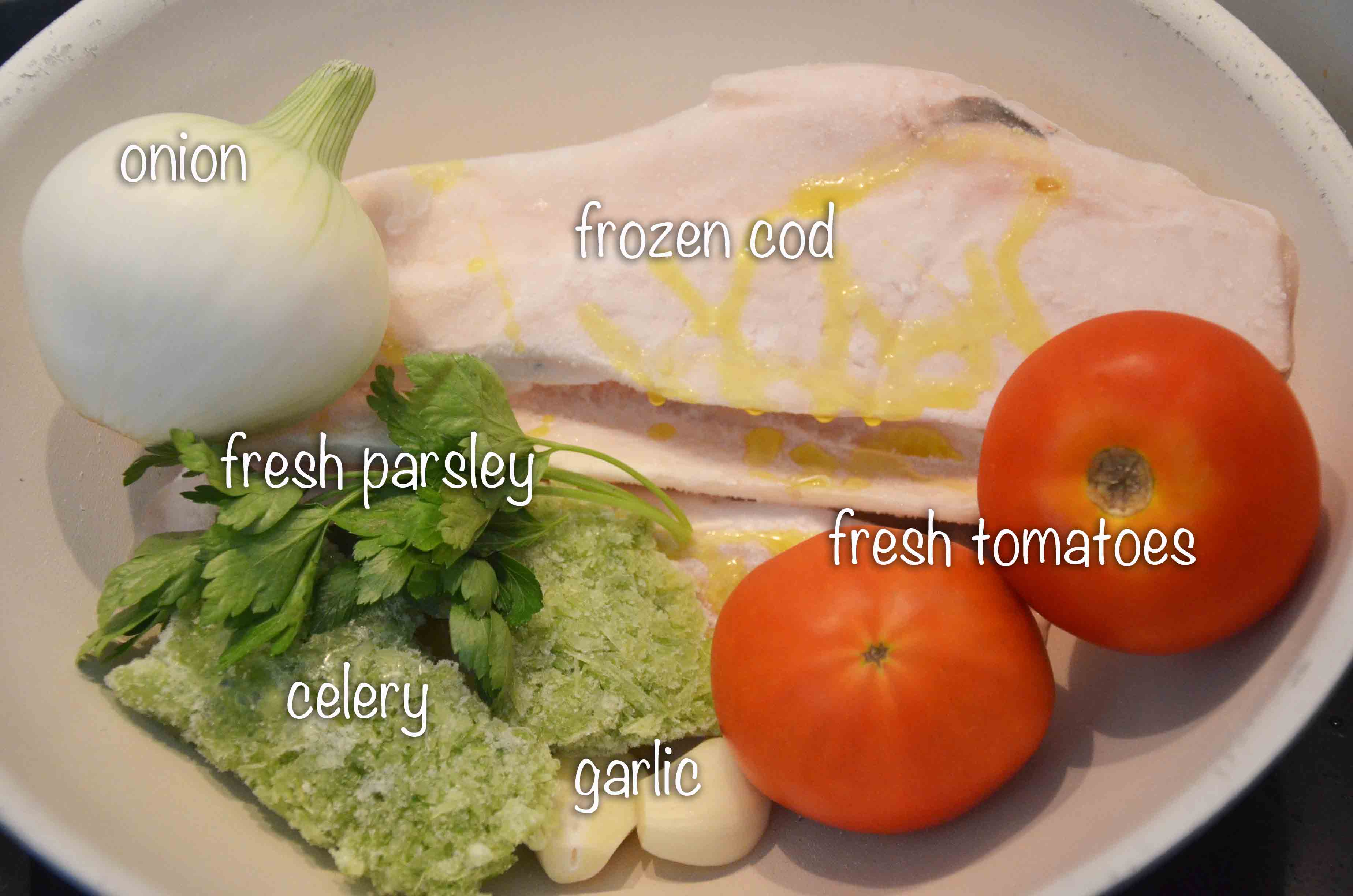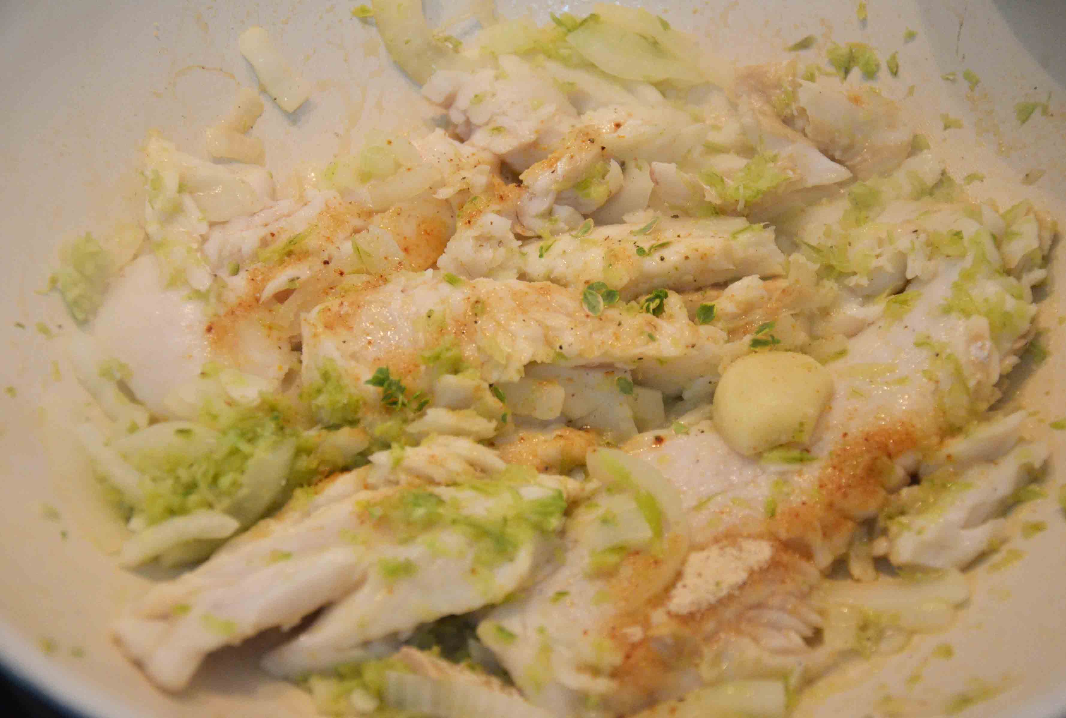 Using a non-stick wok, start simmering the celery and garlic in half a spoonful of olive oil. After about 4 mins, add the fish and, if fresh, sear it on both sides; if frozen, wait for it to thaw and release some juices.