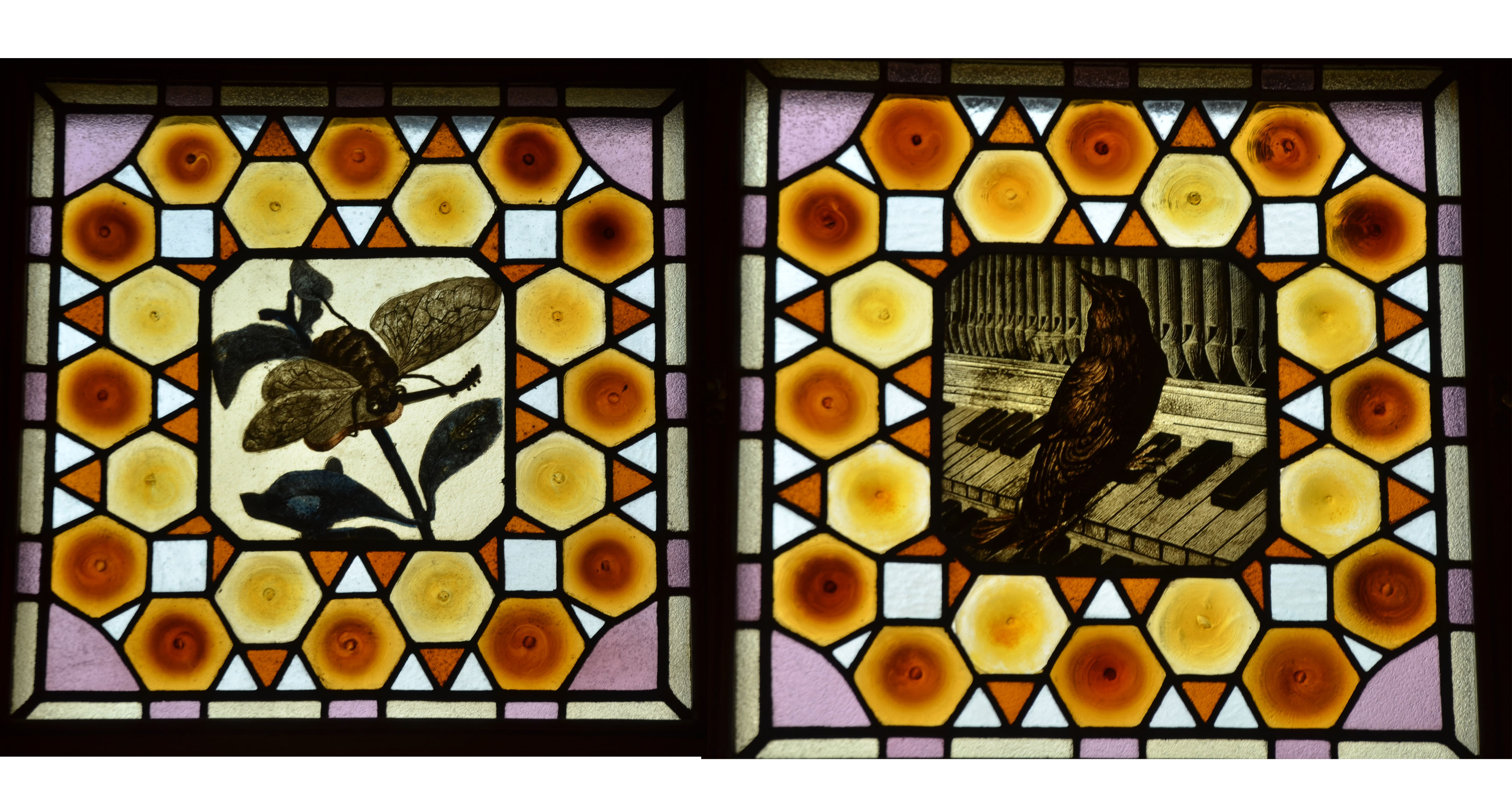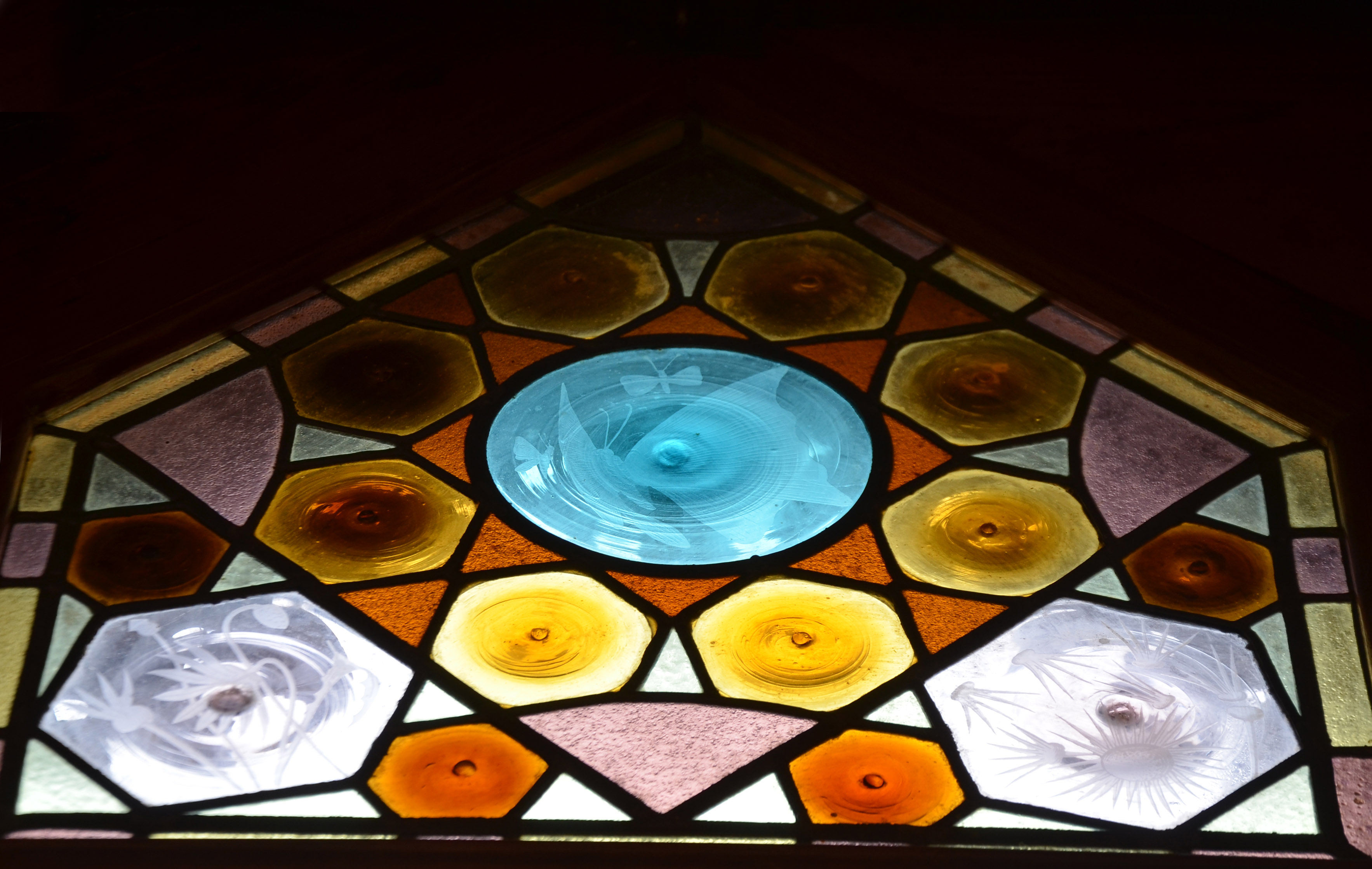This stained glass window, for example, was made to satisfy two of the owner’s passions: nature (the bee) and music (the bird playing the piano). What I discovered while I was trying to take the perfect photo, is that three of the stained glass tiles on top of the main panes had hidden drawings: a flower, a daffodil and a butterfly.