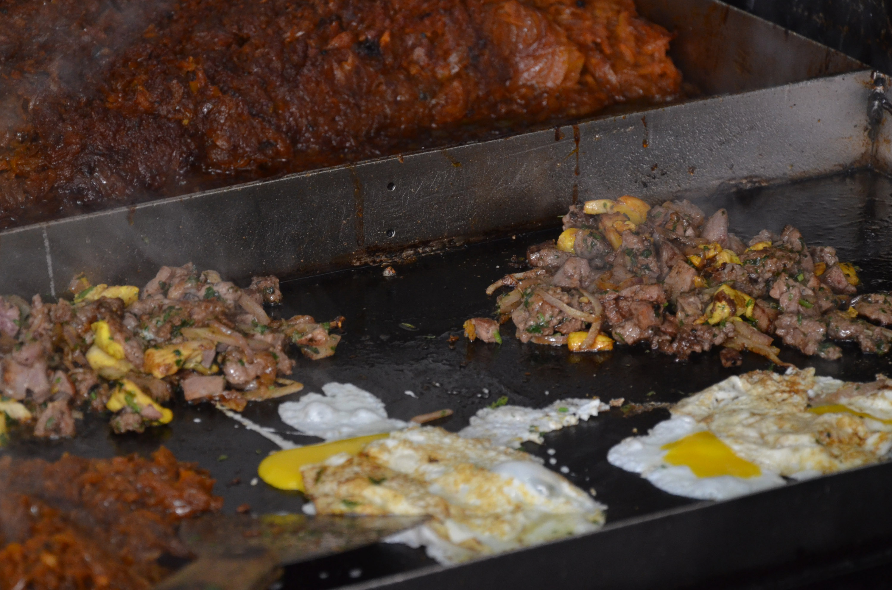 A spit with chickens roasting turned quietly on the back wall, and two large hot plates simmered on the right. One had a large mass of unidentified food cooking. Just cooking. When asked, the chef/owner/manager said that it cooked all day. It was most probably onion, maybe garlic, possibly some other veggie (but maybe not) and a lot of spices.