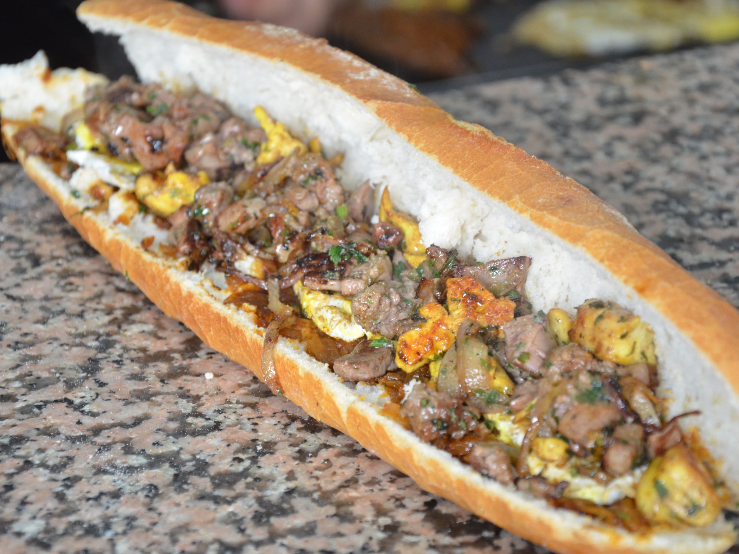 On the other one, he cooked. For every sandwich, he cooked a handful of onion (yes, more), a handful of chicken livers and hearts, a handful of chopped chicken meat. Spices. Something green, which was not bell pepper. An egg.
