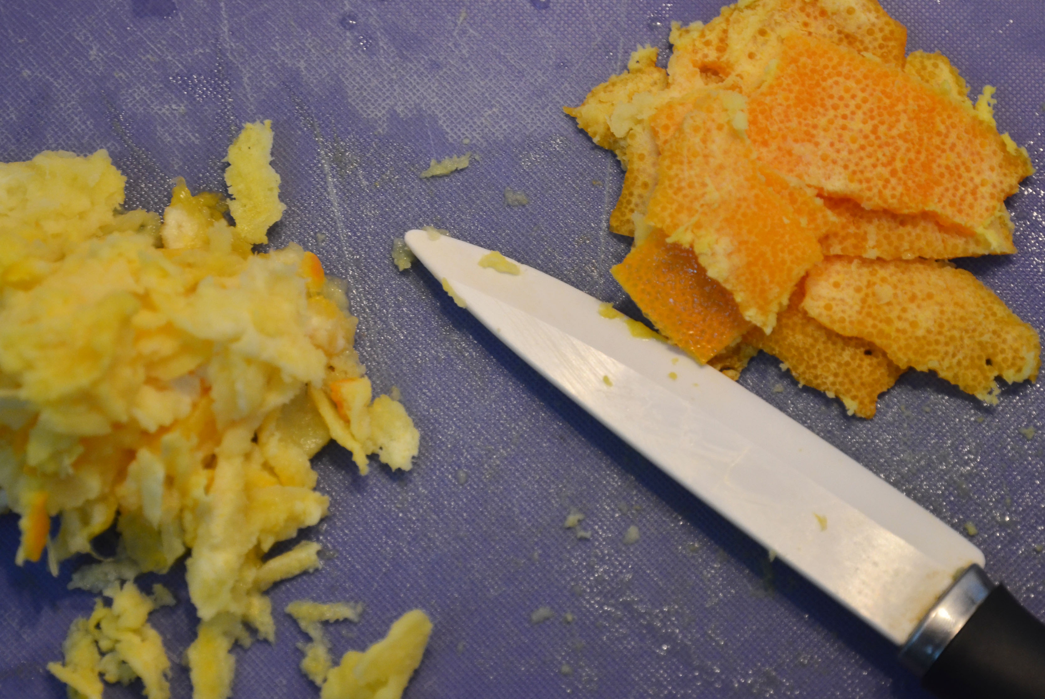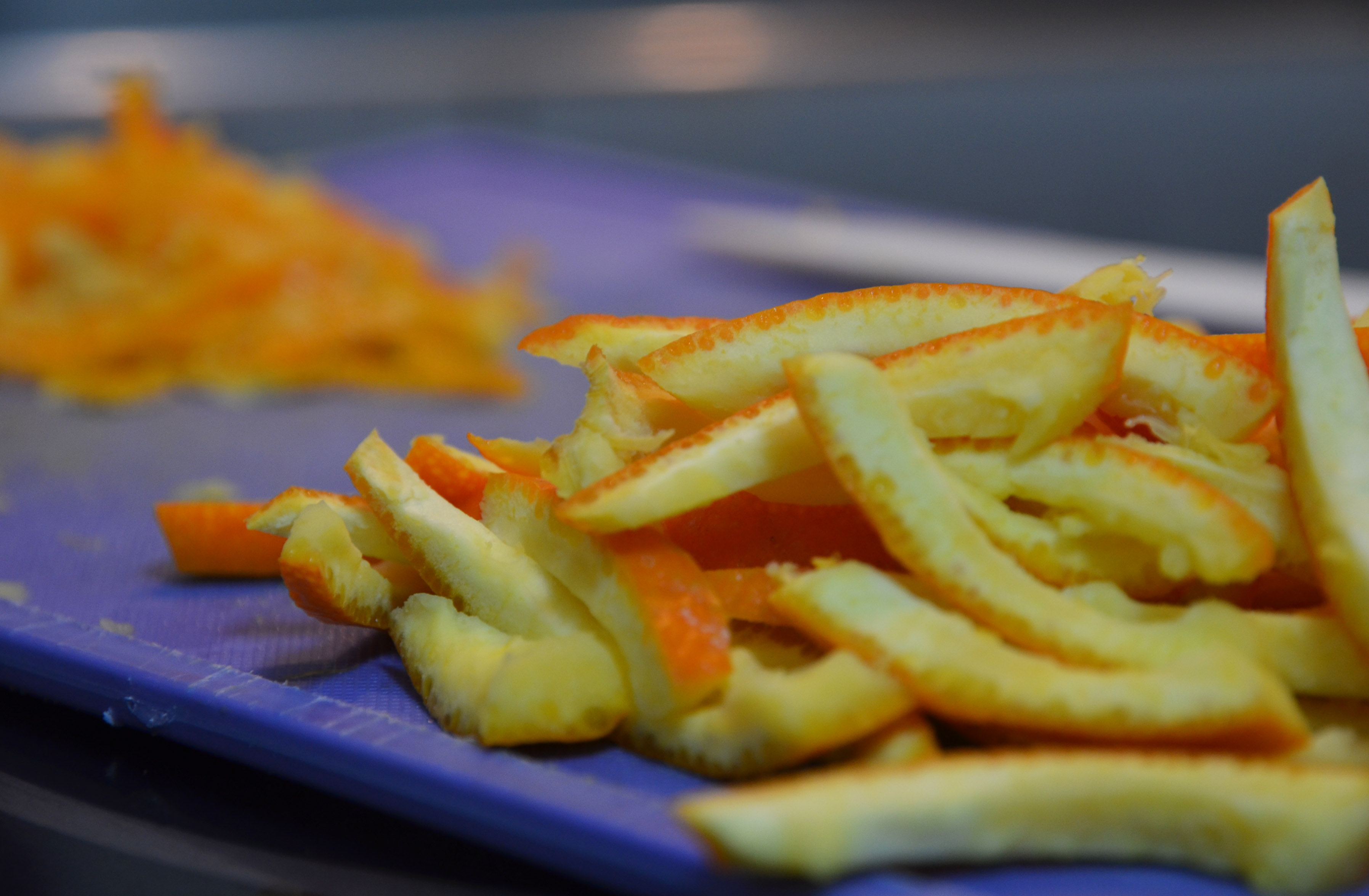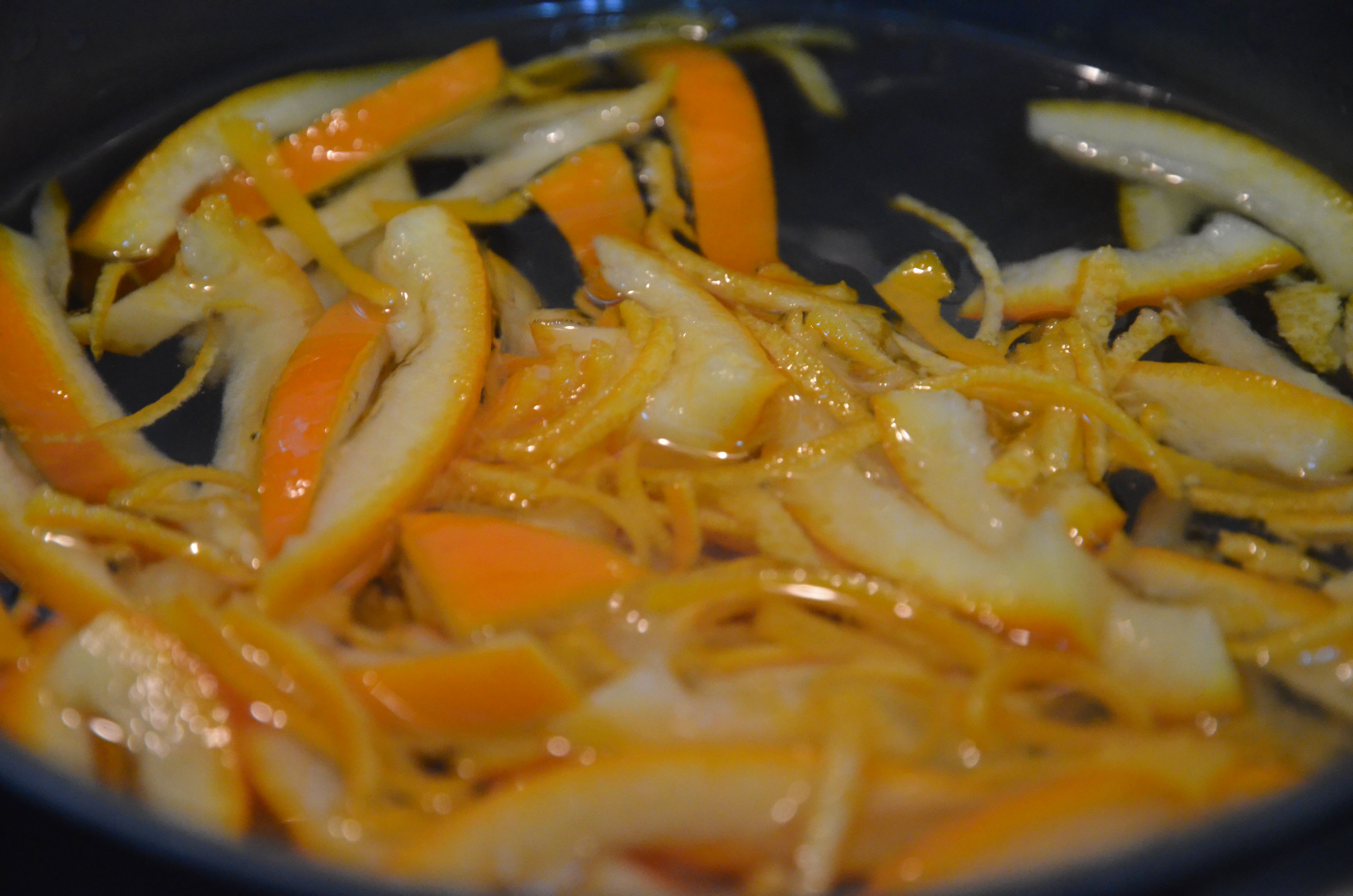 Get your orange peel. Let’s say you’re using two oranges. One of them, just clean of the pulp and slice. The other, clean of the pulp and grate with a knife to remove every single trace of white pith. I developed a technique that worked well: while holding the peel with one finger, I scraped with a sharp knife nearly horizontally.