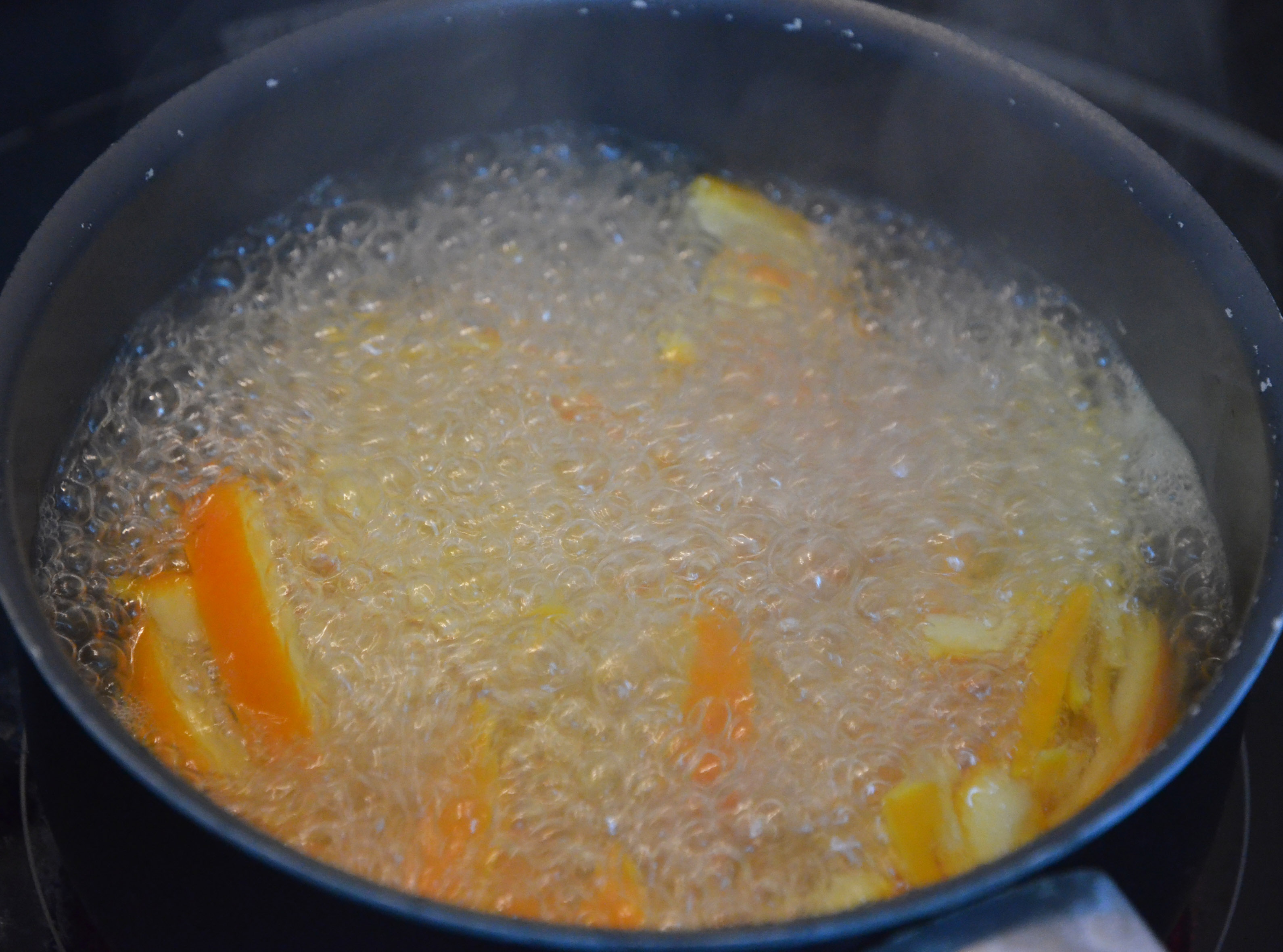 Next, boil some water. Drop the peels in, boil for 15 mins, strain the peels, throw the water and repeat. I saw recipes that called for only one boil and others that said three was the minimum, so I boiled them twice and it was absolutely fine.