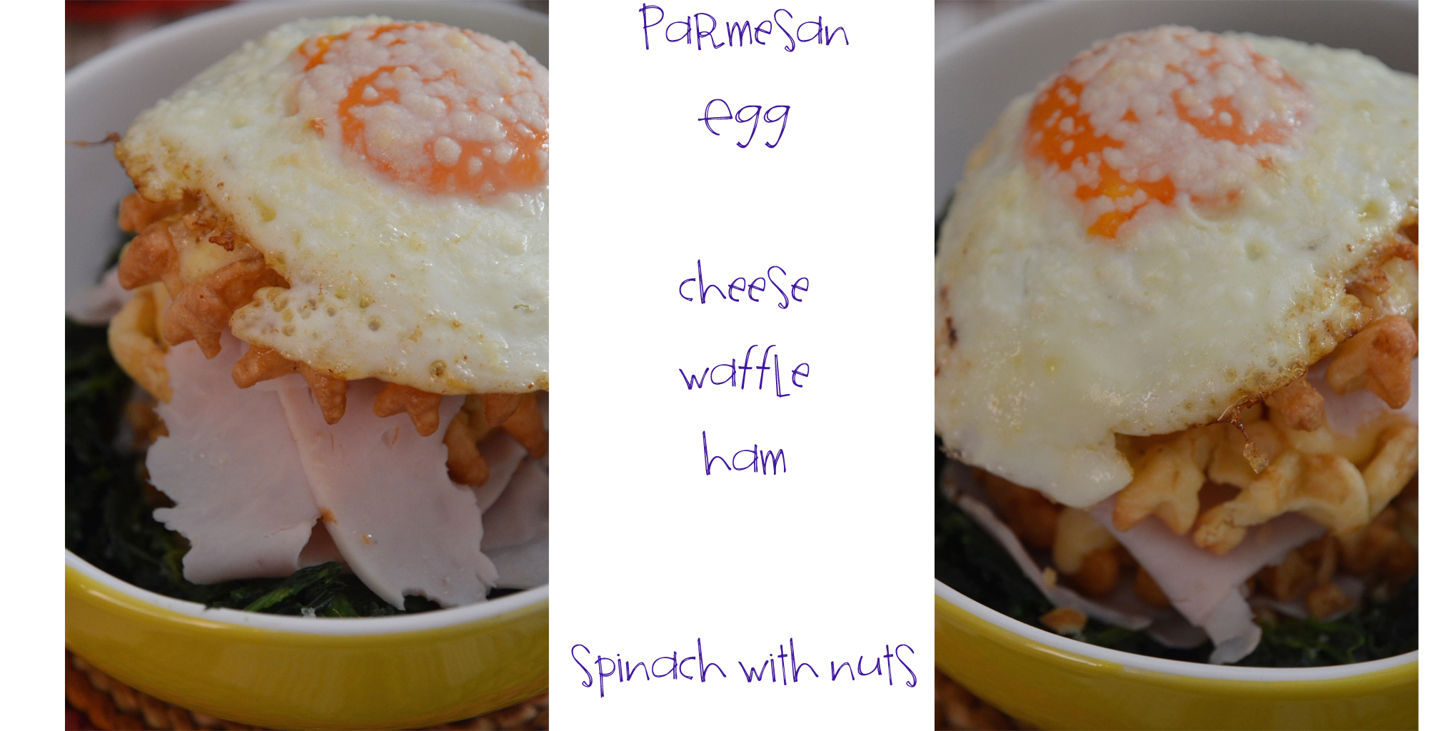 I warmed up the waffles and placed one on a bed of sautéed spinach mixed with walnuts and nutmeg. I put a wee bit of butter on that warm waffle and placed a slice of cheese, then a slice of ham. This was covered with a waffle, butter, cheese, ham and another waffle until the waffles finished. The top layer was (starting from the bottom): waffle, butter, cheese, fried egg and grated parmesan.