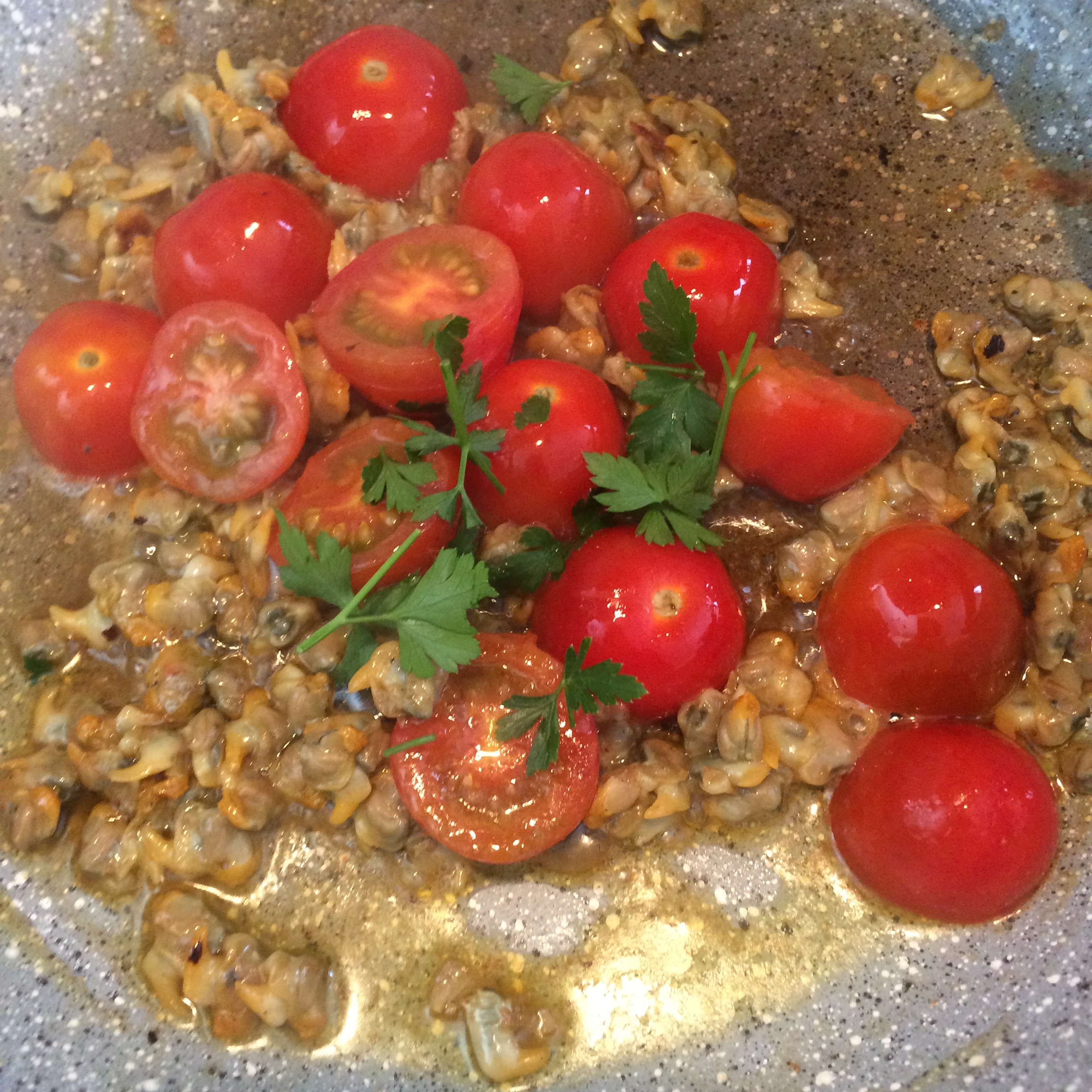 Get a non-stick pan. Add some olive oil and garlic, or garlic infused olive oil. Pour in the clams, and let them sizzle. Cut your cherry tomatoes in half and put them, sliced side down, to lose their water.
