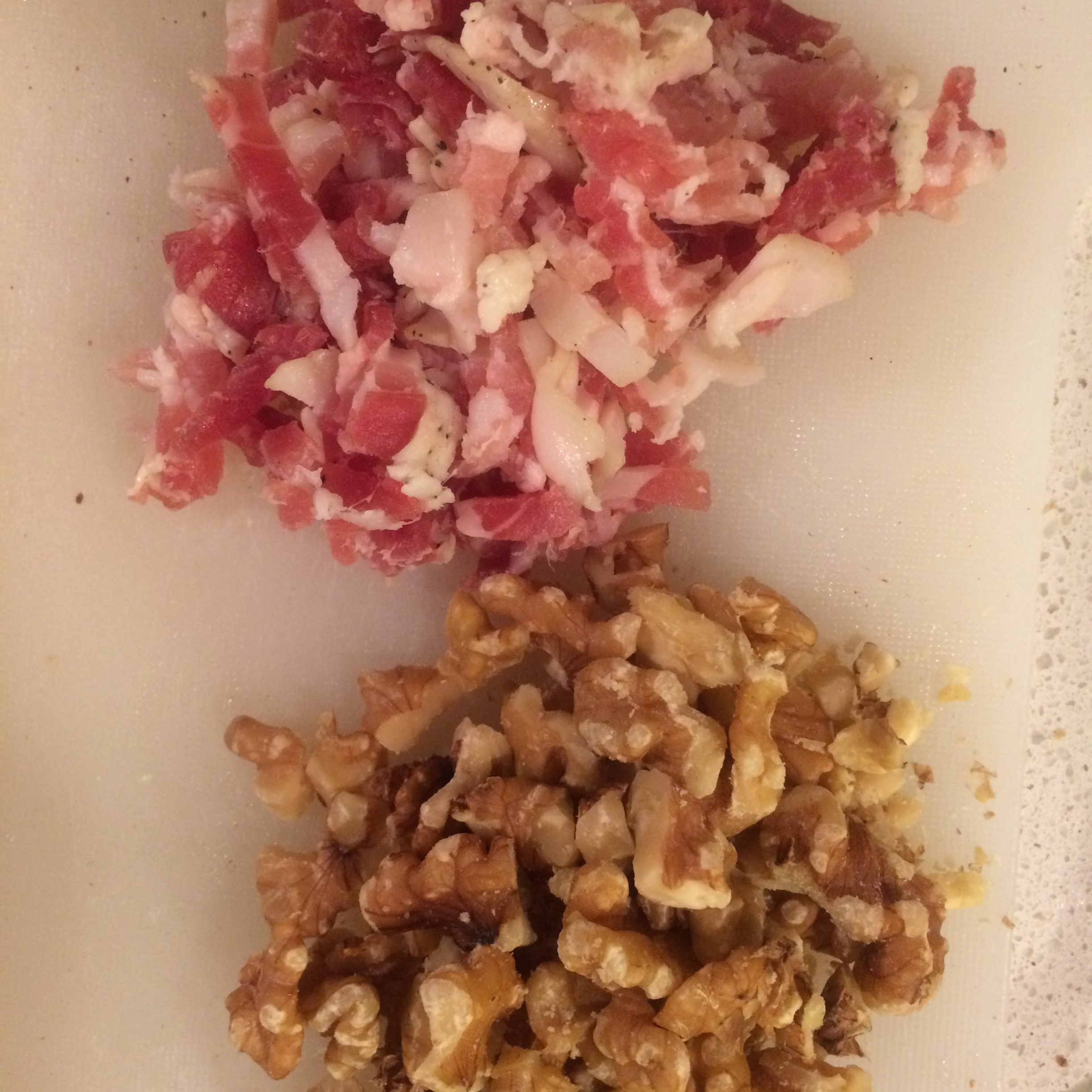 Now for the pork! Chop up your pancetta and coarsely break the walnuts