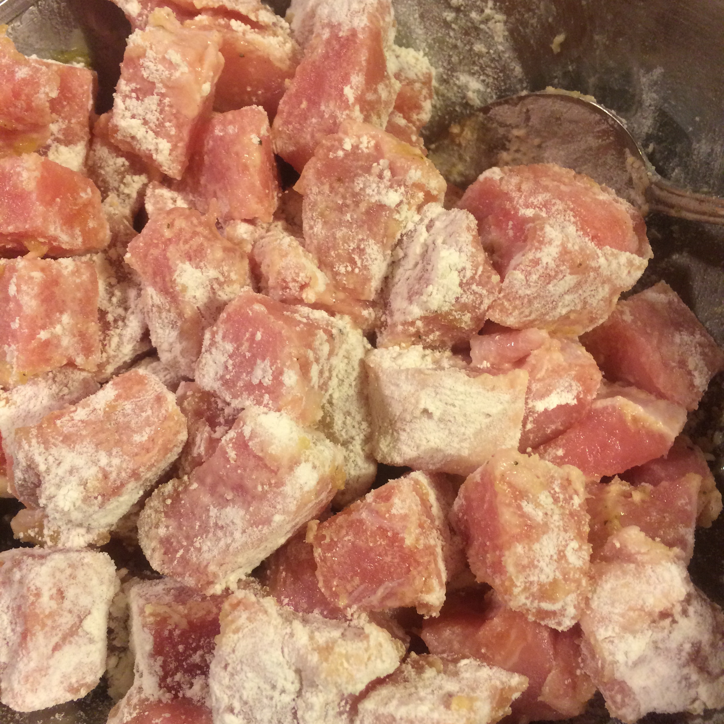Dice the pork and marinate it in garlic infused olive oil, salt and pepper. Toss it and then put it in the fridge to rest.