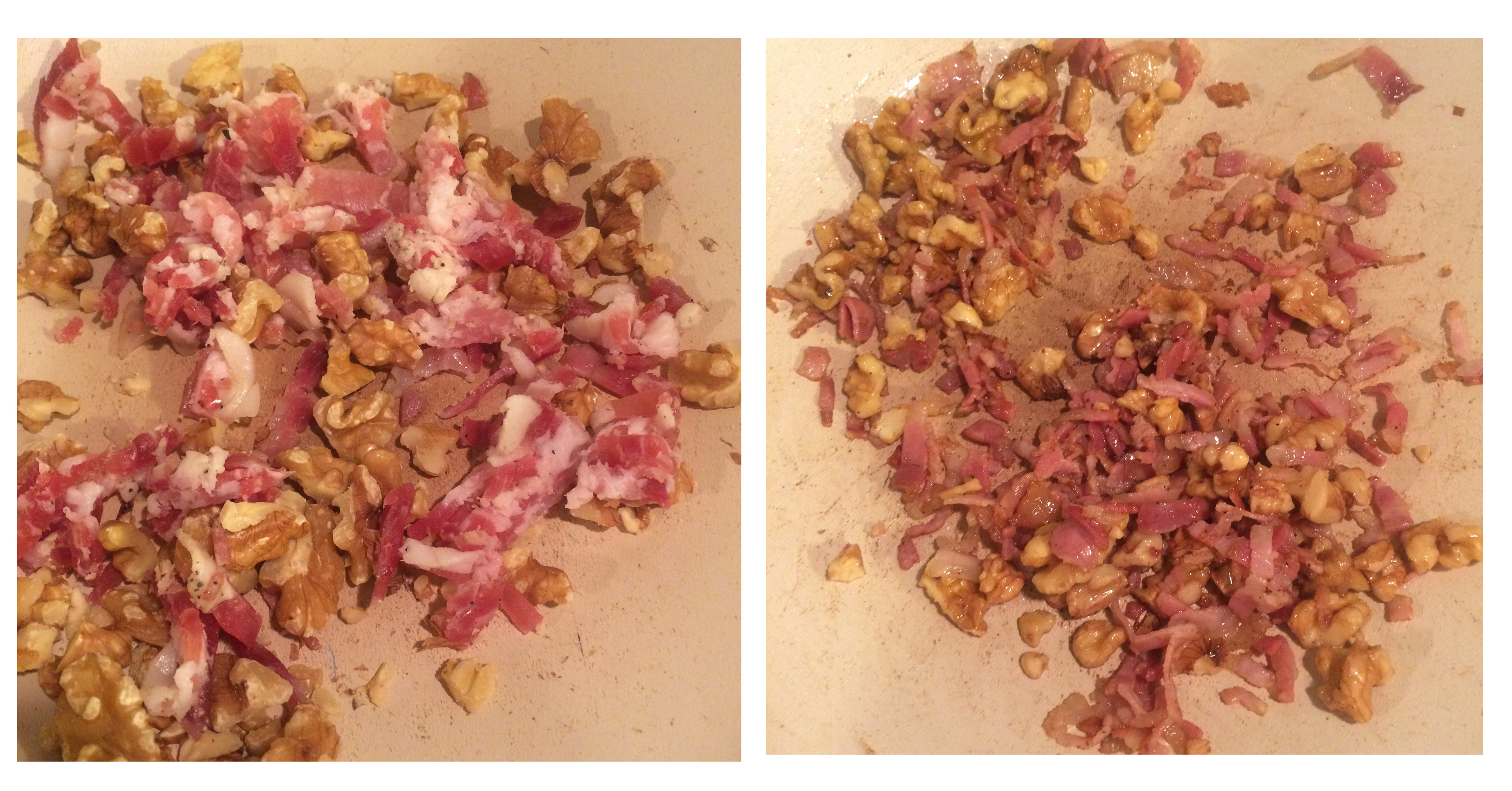 Place both the ingredients in a non-stick pan and let the pancetta’s fat melt and roast the walnuts.