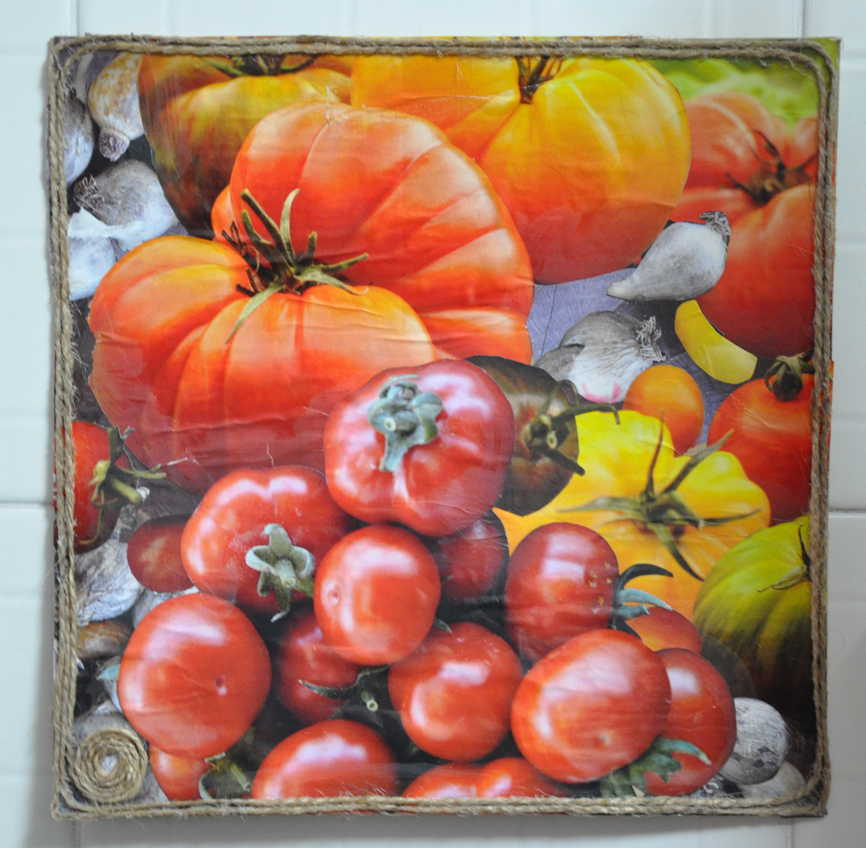 I made this. I found lots of photos of tomatoes – in a few editions of Living, I believe – and I cut them out and stuck them together again. Oh, and some garlic. Then, I made a frame out of string.