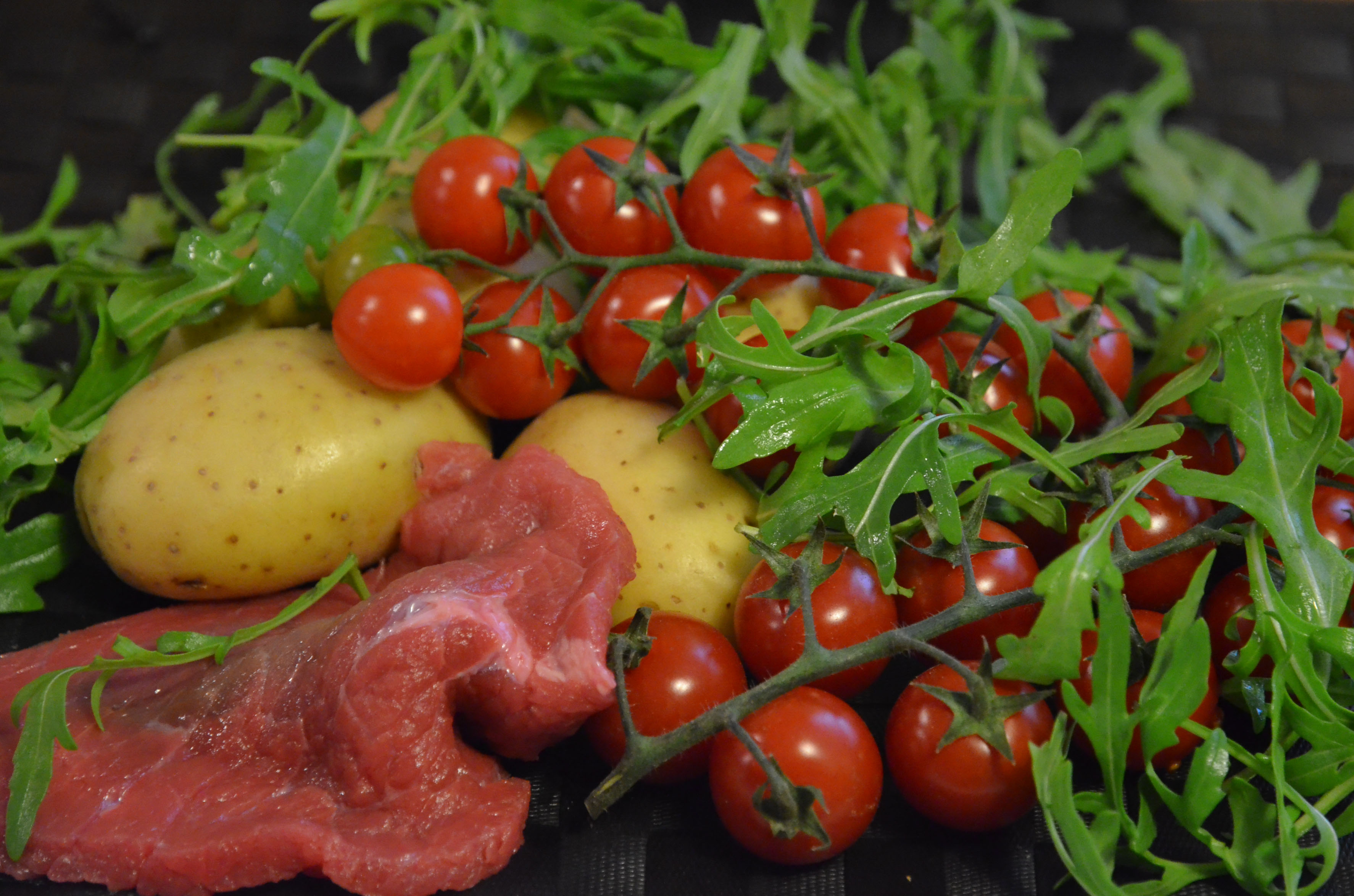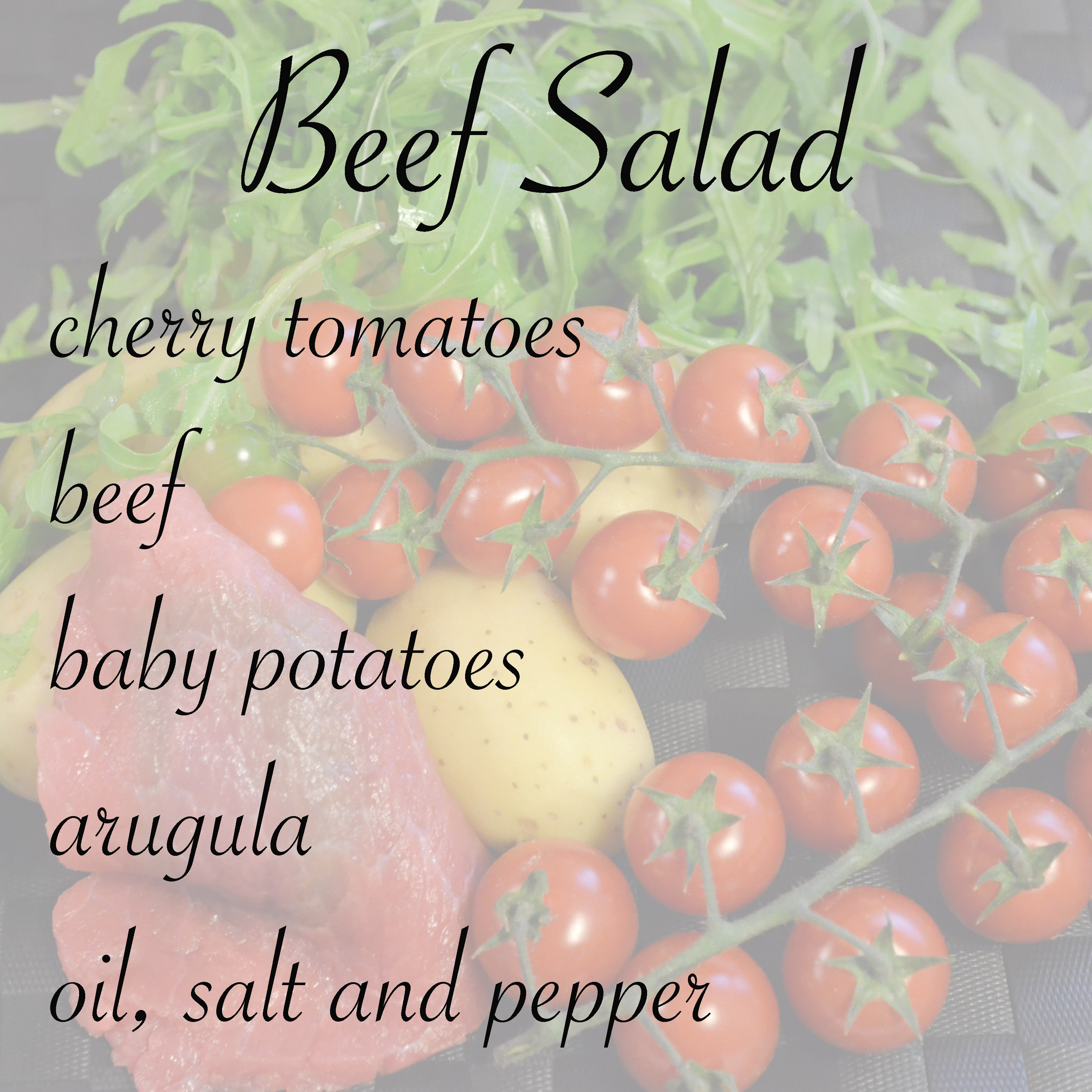 Toss the meat and the potatoes together. When they’re cold, add the cherry tomatoes and the arugula and enjoy your summery, healthy beef salad!