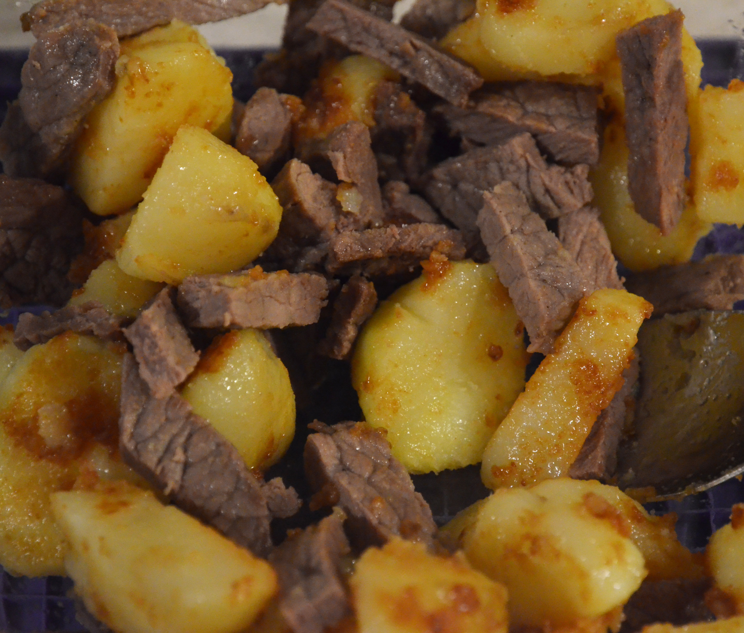 Set the meat aside. When the are potatoes cooked, take them out of the water, cut them into chunks (and peel them, if you prefer. I don’t, usually) and fry them lightly in the meat’s juices.