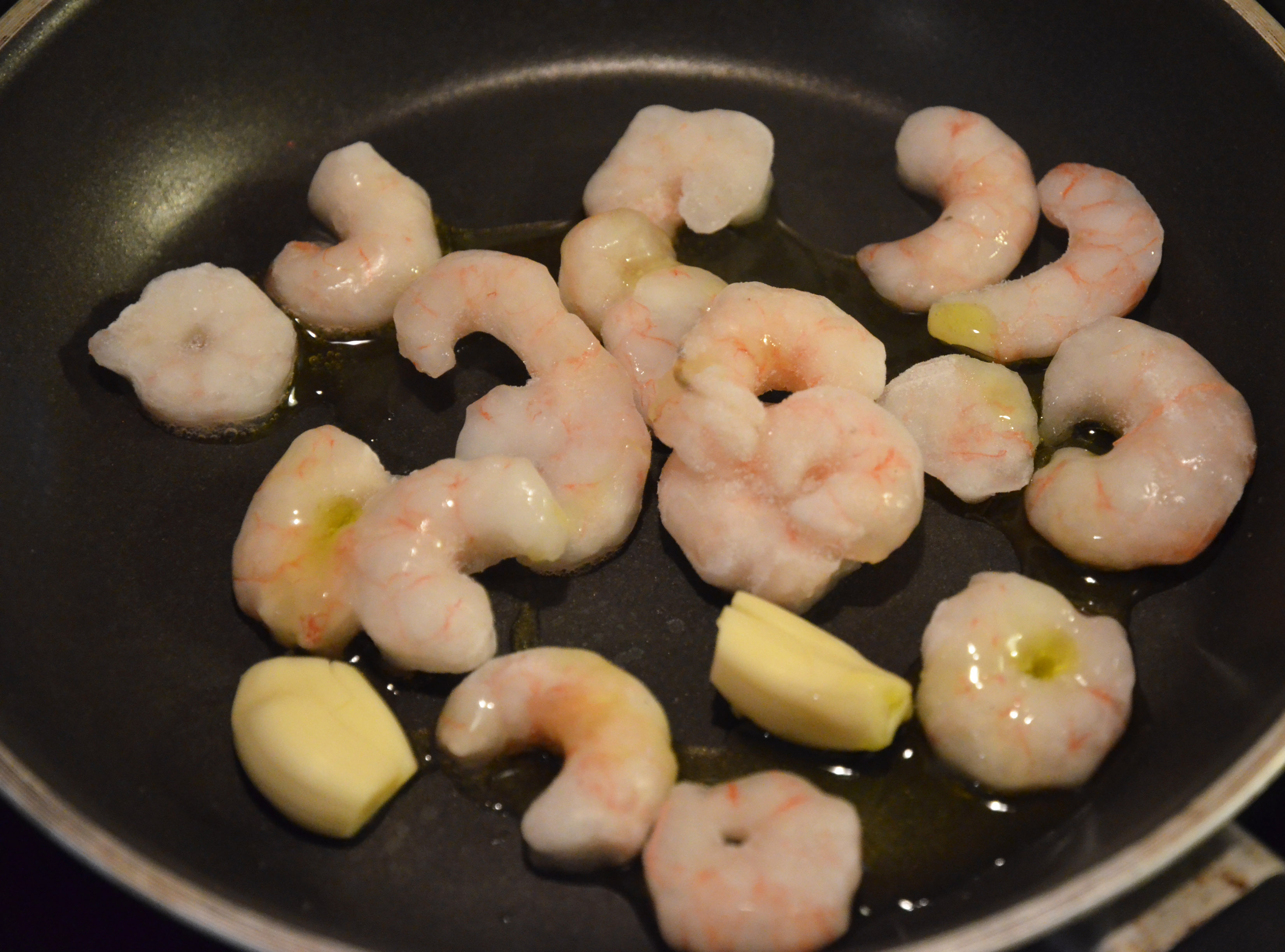 Sauté the shrimps with a drizzle of olive oil and the garlic. If you like your dishes hot, now is the time to add some chilli pepper flakes.
