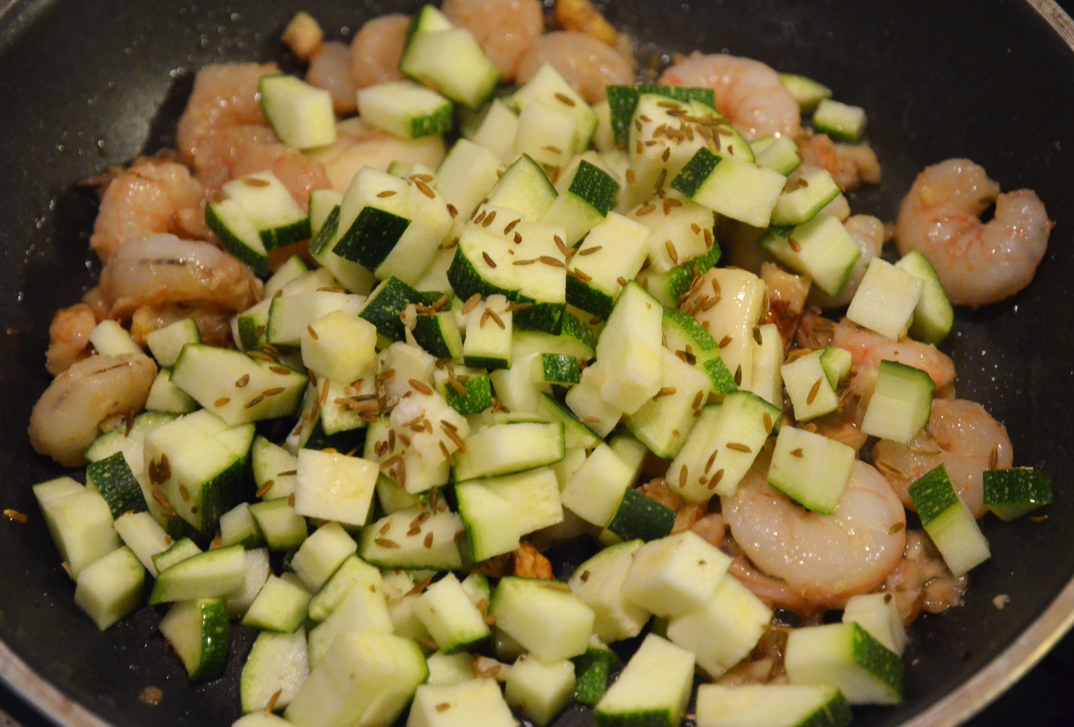When the shrimps are cooked and the liquid has evaporated, add the zucchini, cumin, salt and pepper. Cook on medium heat until the zucchini are soft but not mushy. While it cooks, prepare your couscous following the directions on the box.