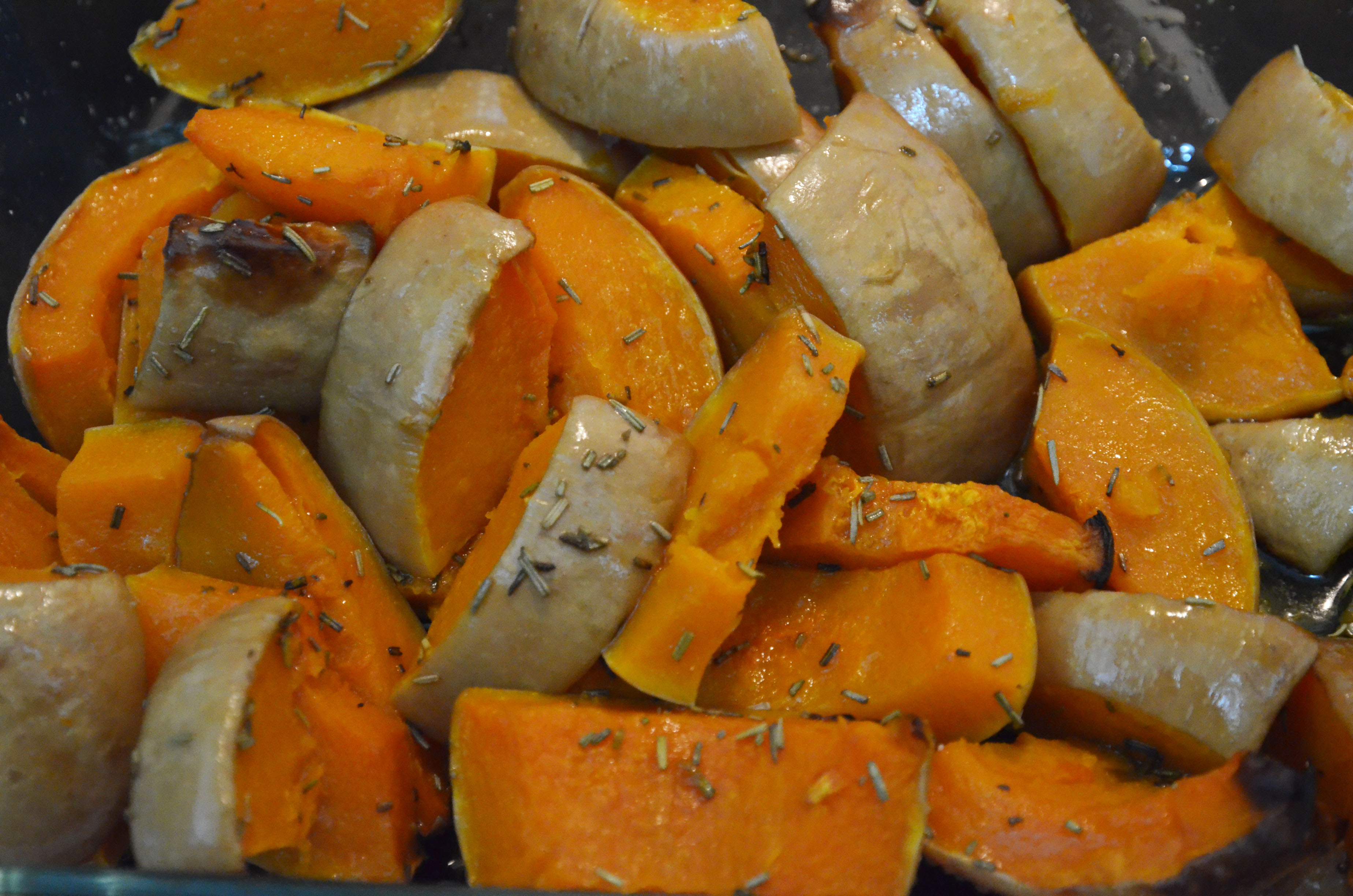 First, you need to chop up the butternut squash, remove the seeds and filaments, toss it with olive oil, salt, pepper and rosemary. You can leave the skin on – it becomes very soft and is good for digestion.