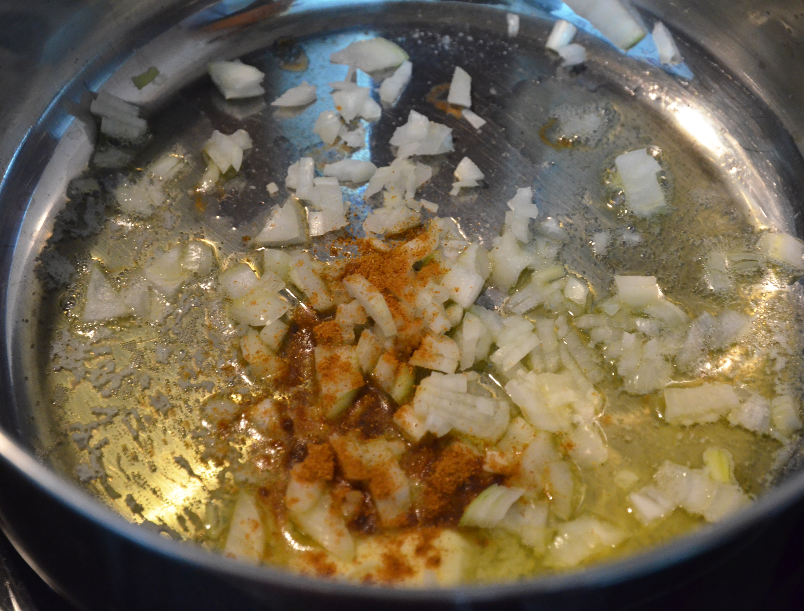 Now heat some olive oil in a non-stick pot and add the cinnamon and chopped onions. I prefer shallots or red onion, but I only had the normal white one so that’s what I used.