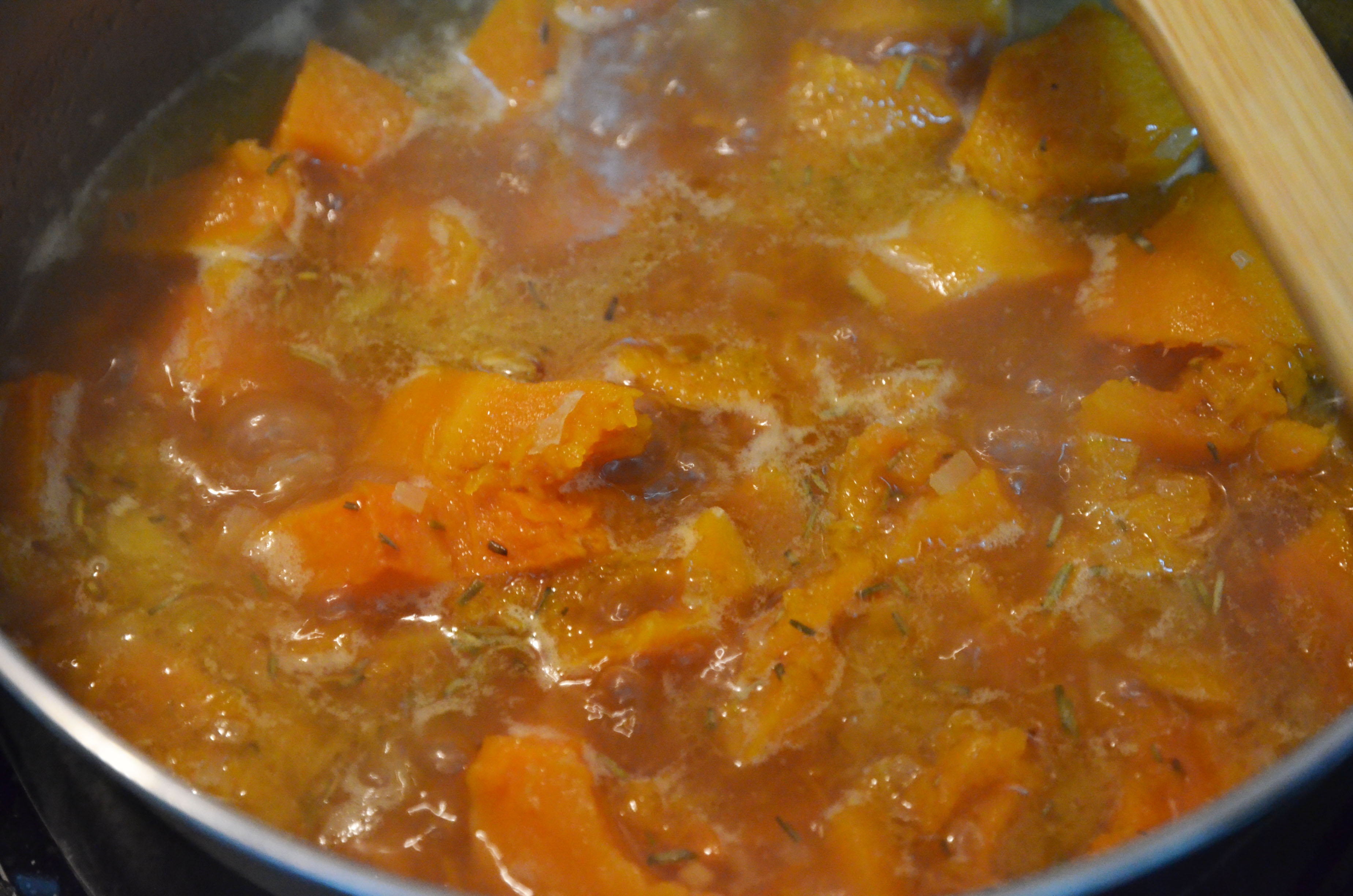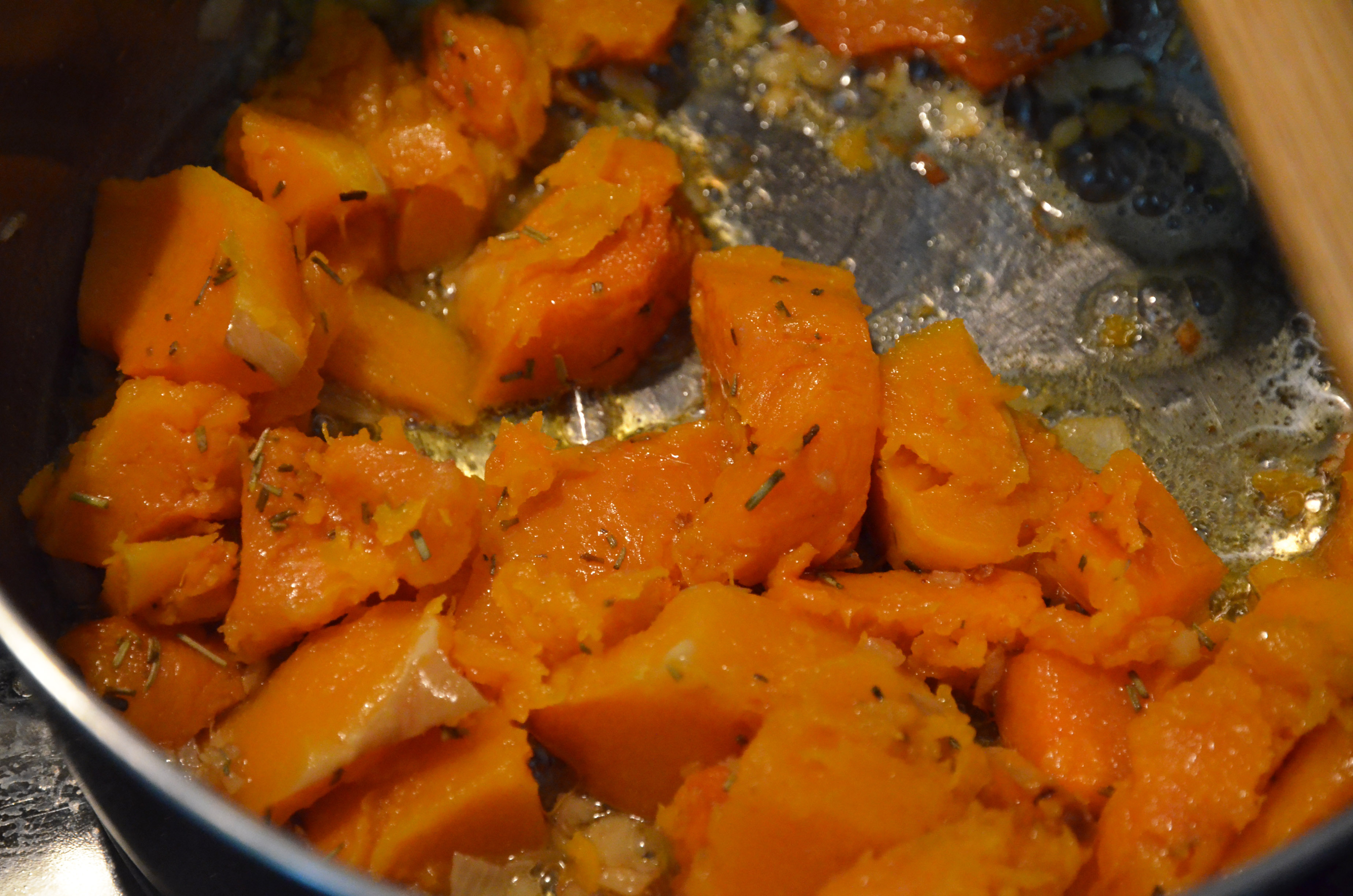 When the onion becomes translucent, add the butternut squash and lower the heat.