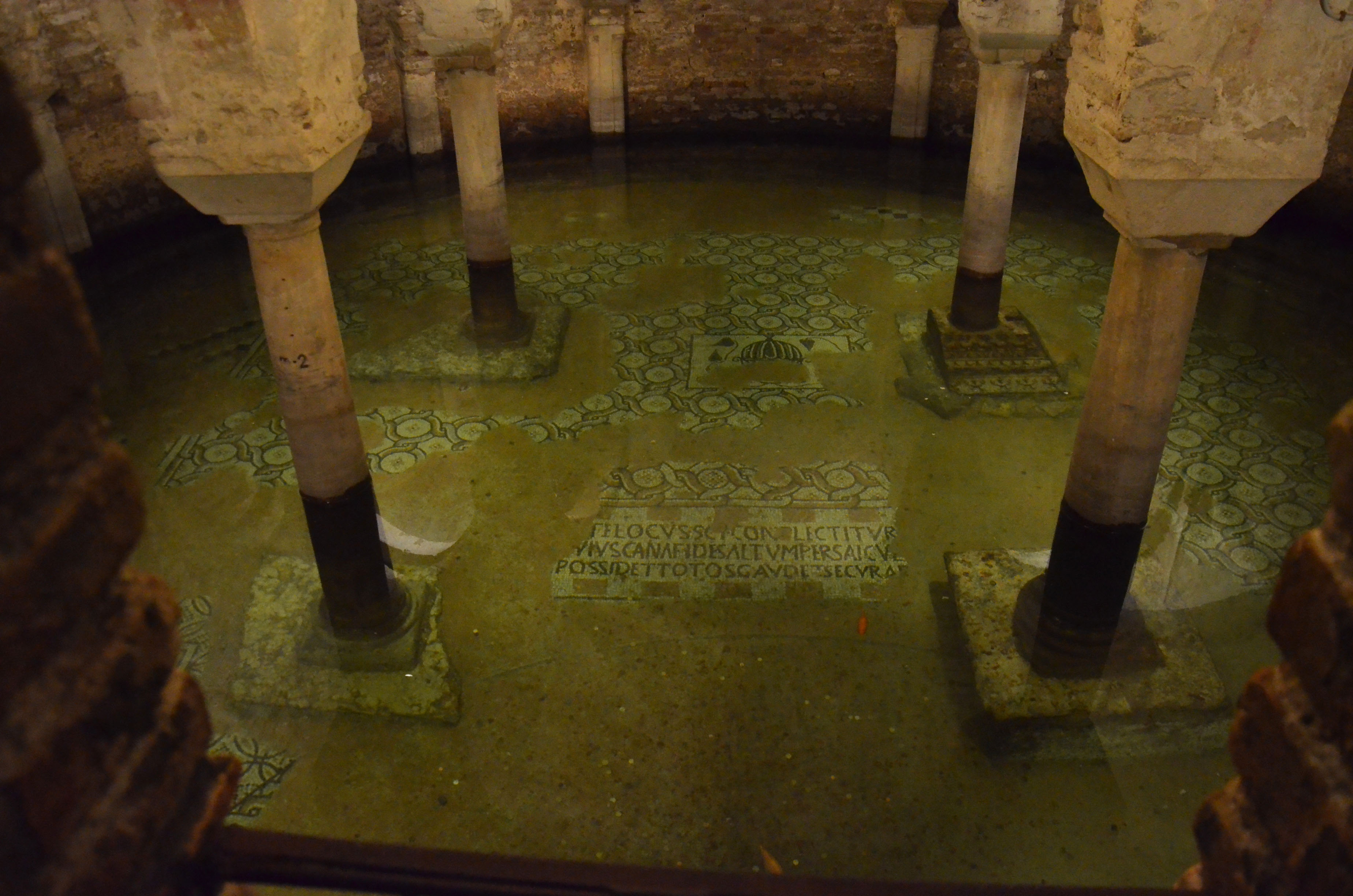 The beautiful church of San Francesco, splat in the center of town, is a wonderful example of what subsidence can do. Many tourists go in and walk around, but few see that by just slipping a coin in a badly placed machine you can turn on the lights in the crypt. And if you lean over the railing and look down, you’ll notice that there’s about a meter of perfectly transparent water covering the delicate mosaics below. And if you wait a minute, you’ll probably notice that there are fat orange goldfish that look as if they’re flying over the mosaics and the coins that people superstitiously throw in . Because Ravenna isn’t only famous for its byzantine mosaics, its coastal night life and its subsidence. It’s also famous for its mosquitos.