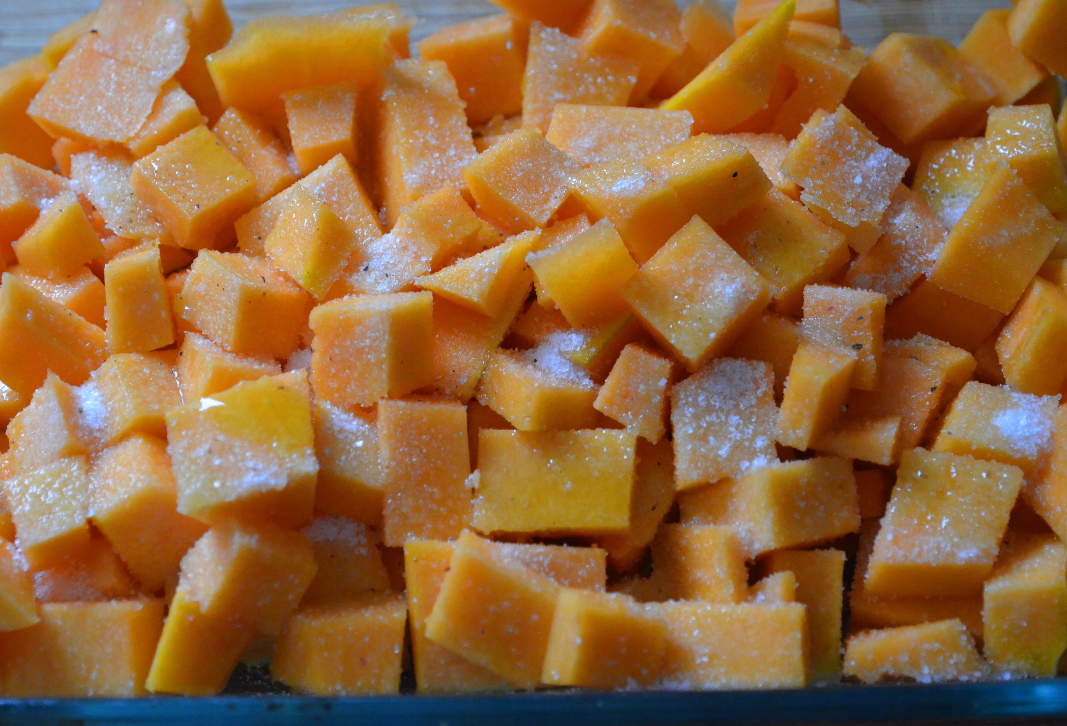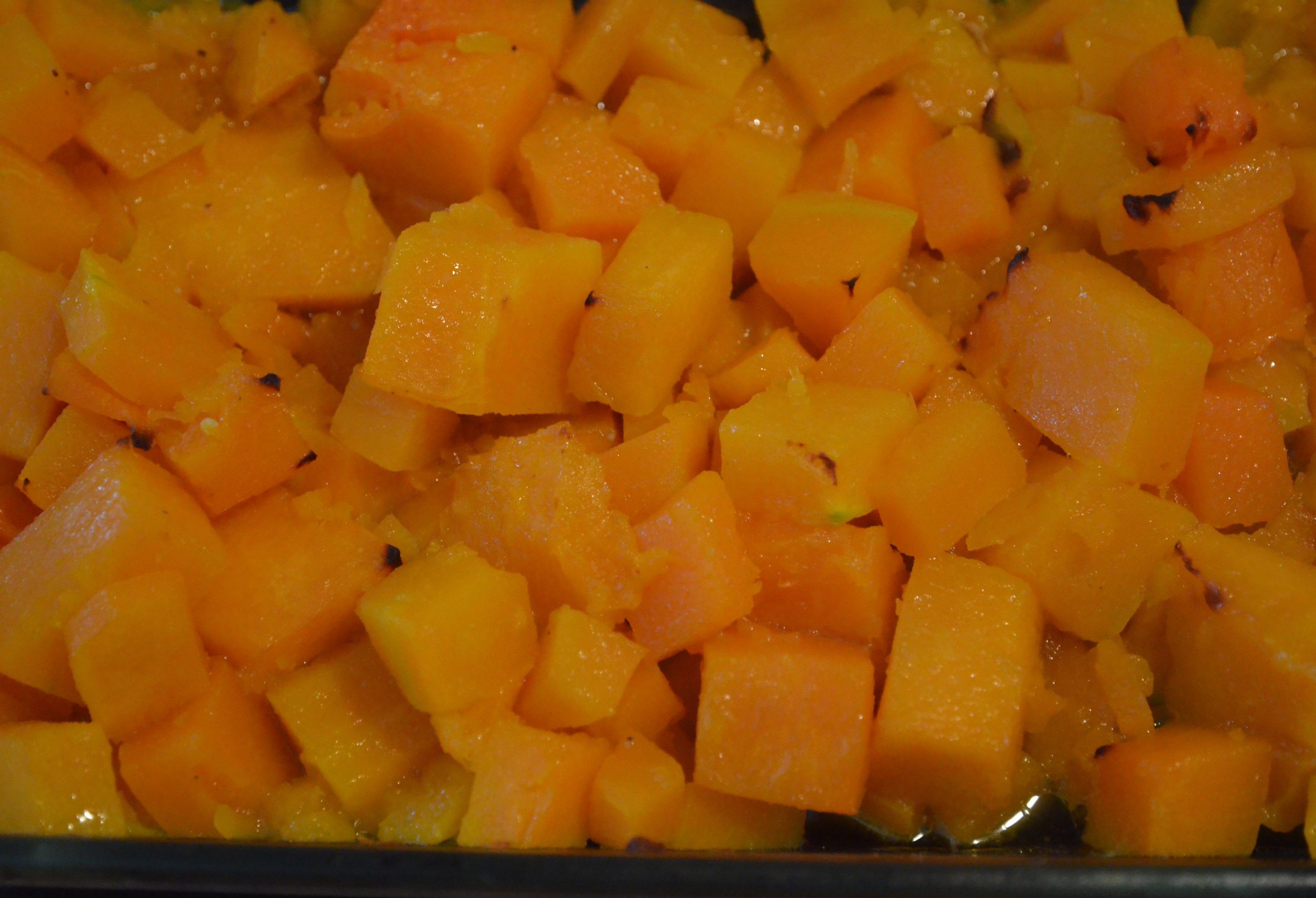 So, chop up you pumpkin and toss with oil, salt, pepper and, if you have it (or if it’s not pouring and you can be bothered going out to the garden to get it), rosemary.