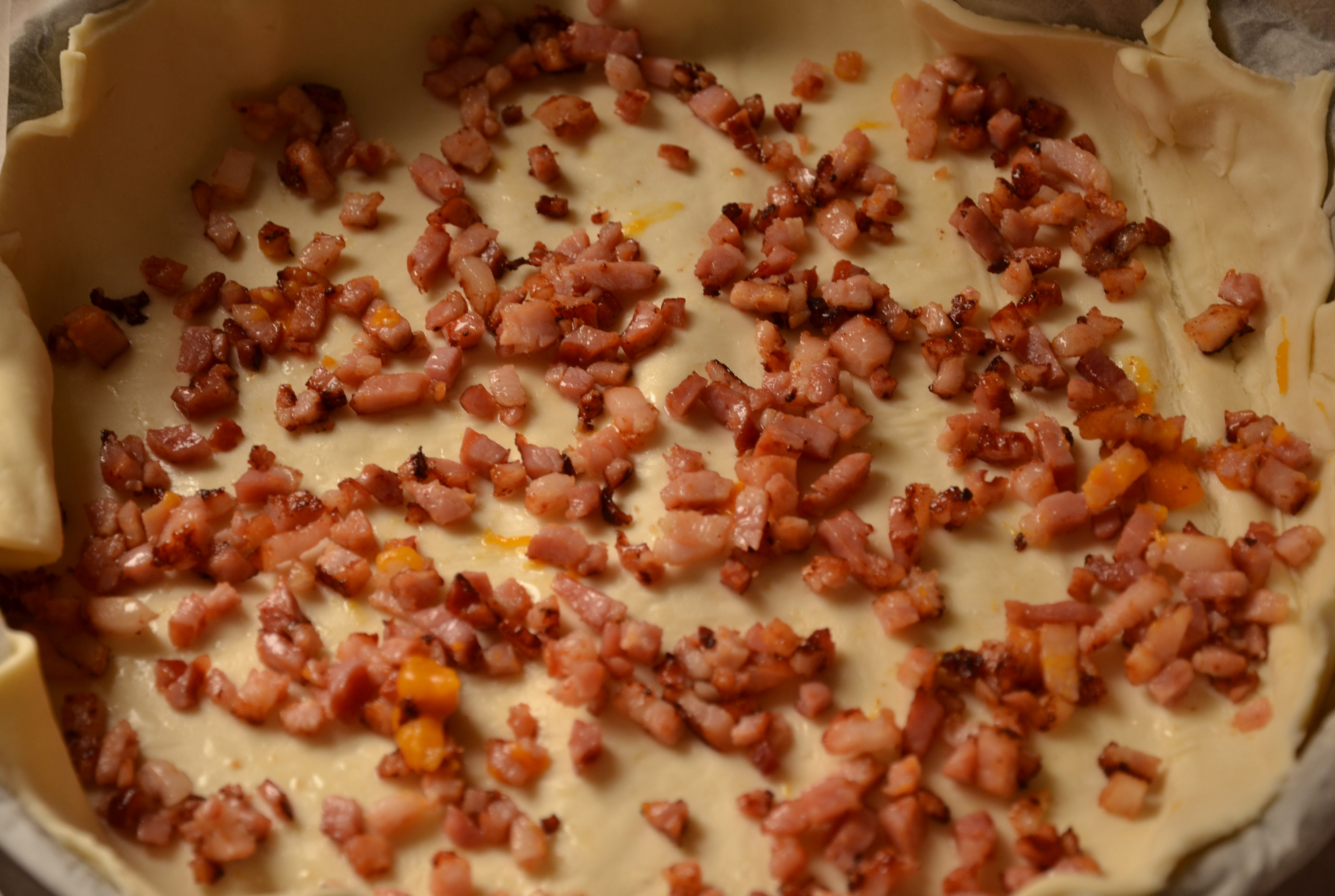 Spread the bacon on the bottom of the puff pastry