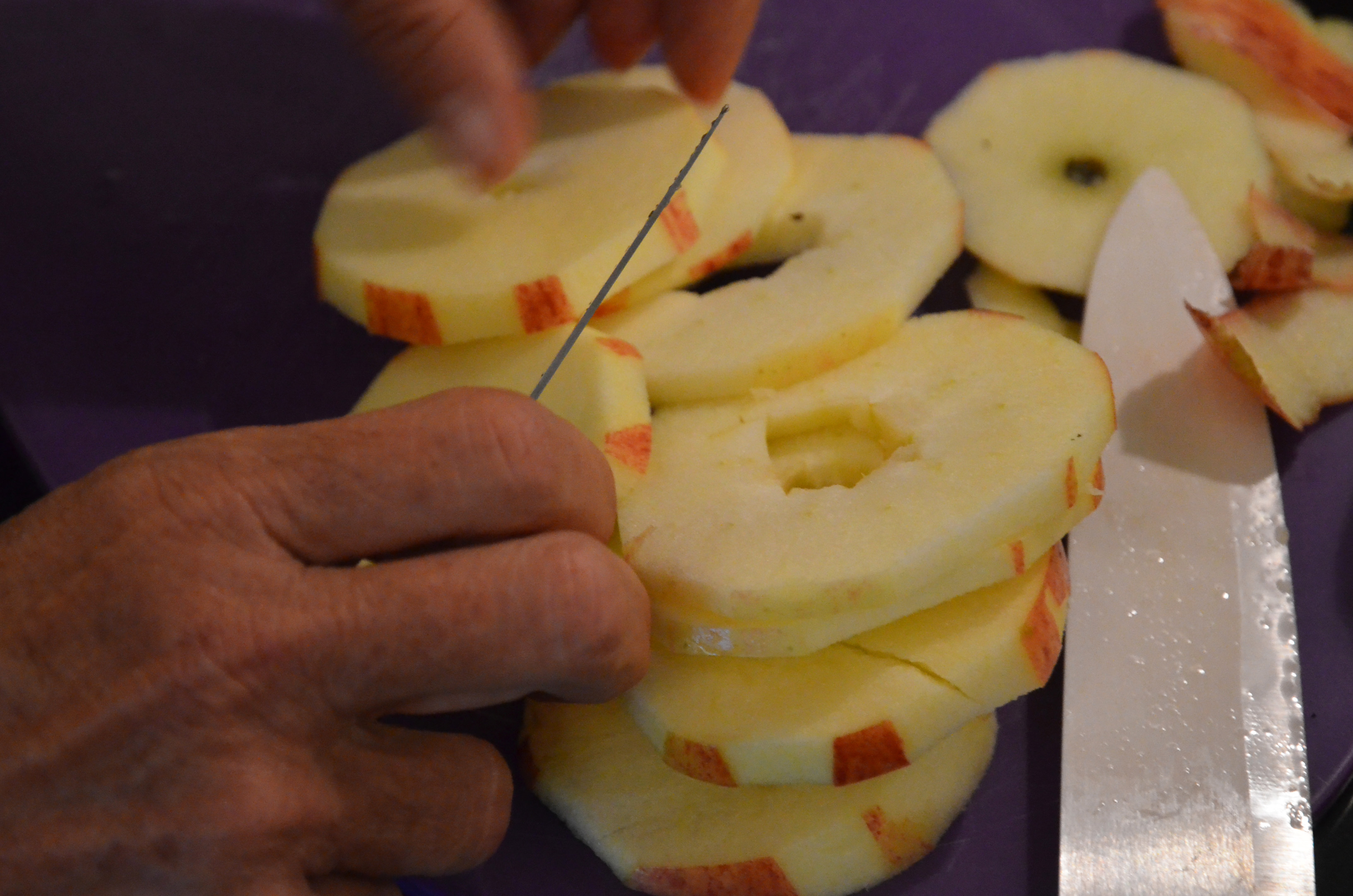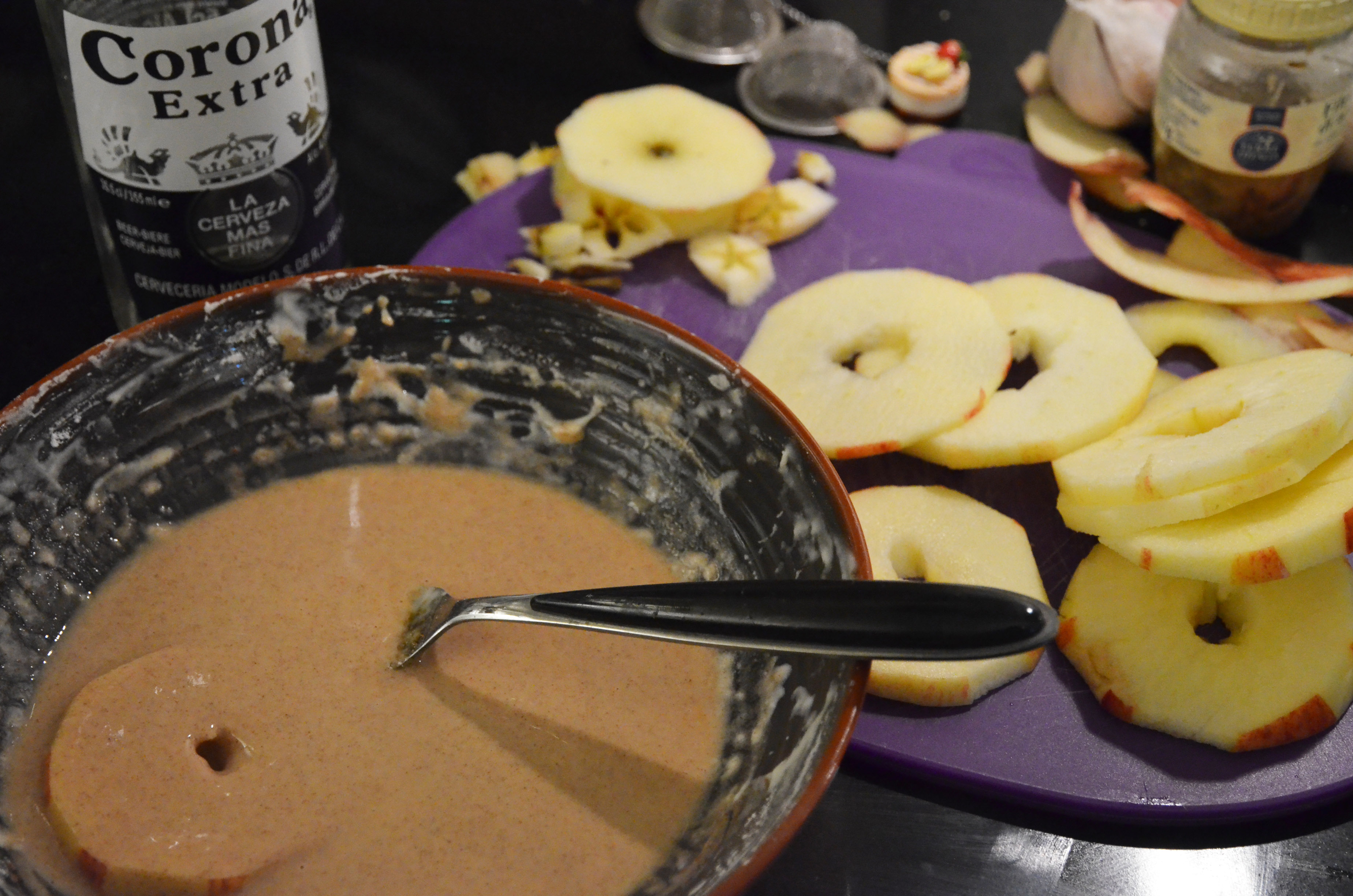 Once the apples are peeled and sliced, mix the flour, beer, cinnamon sugar and pinch of salt together. The batter is perfect when it coats and sticks to your finger without dripping too fast.